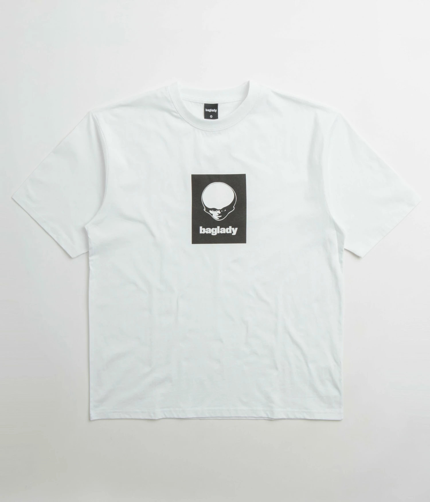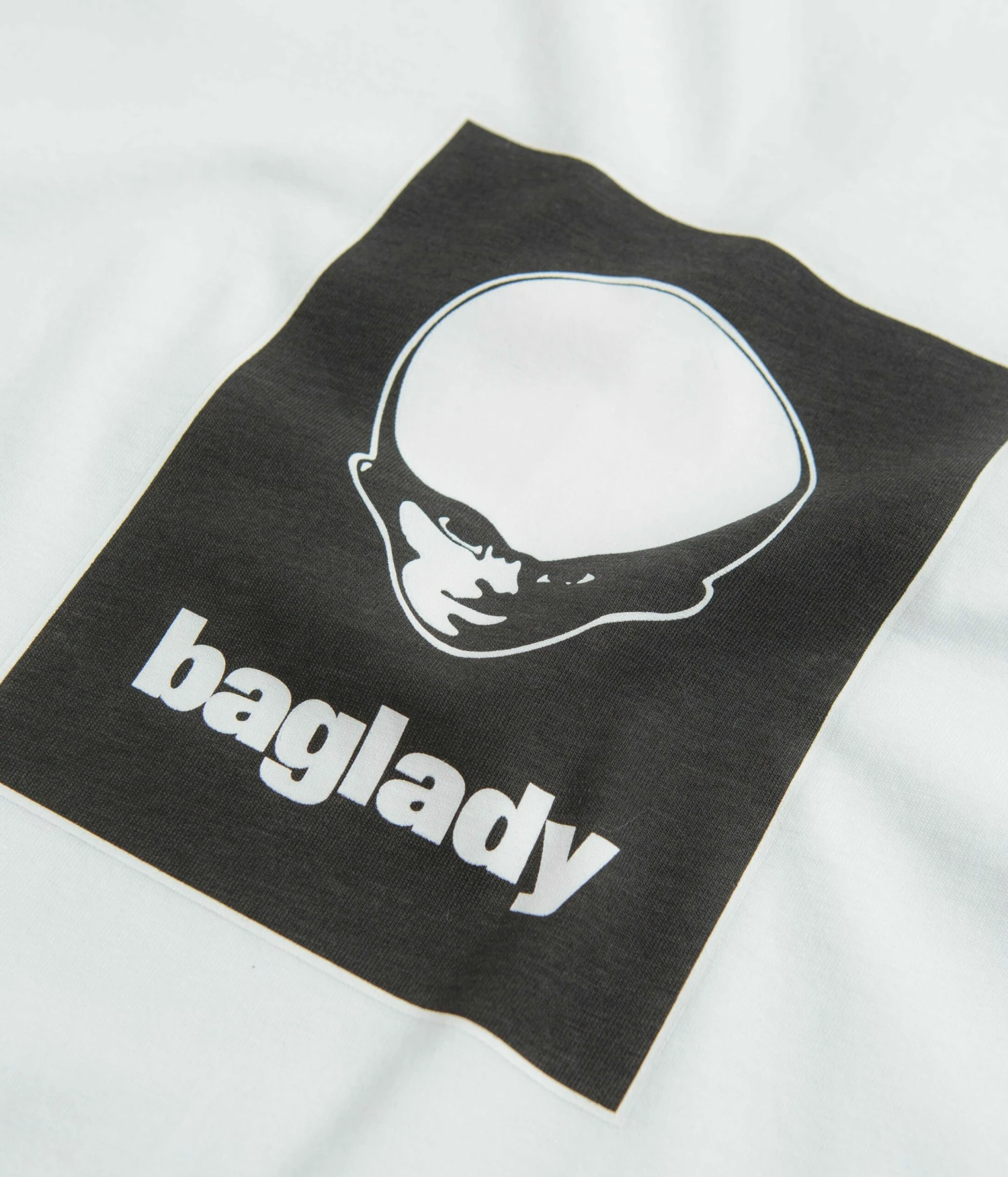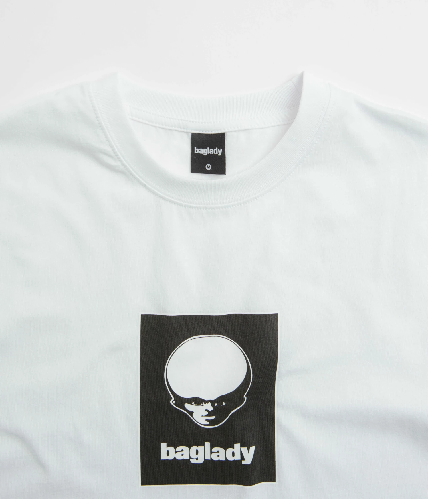 Baglady Alien Logo T-Shirt in White. Arriving as part of the brand’s latest collection, this boxy fitting Baglady t-shirt is made from 100% cotton. Featuring a flexible rib knit collar and a reinforced hem, this white t-shirt is finished with an alien themed baglady graphic printed across the centre chest.