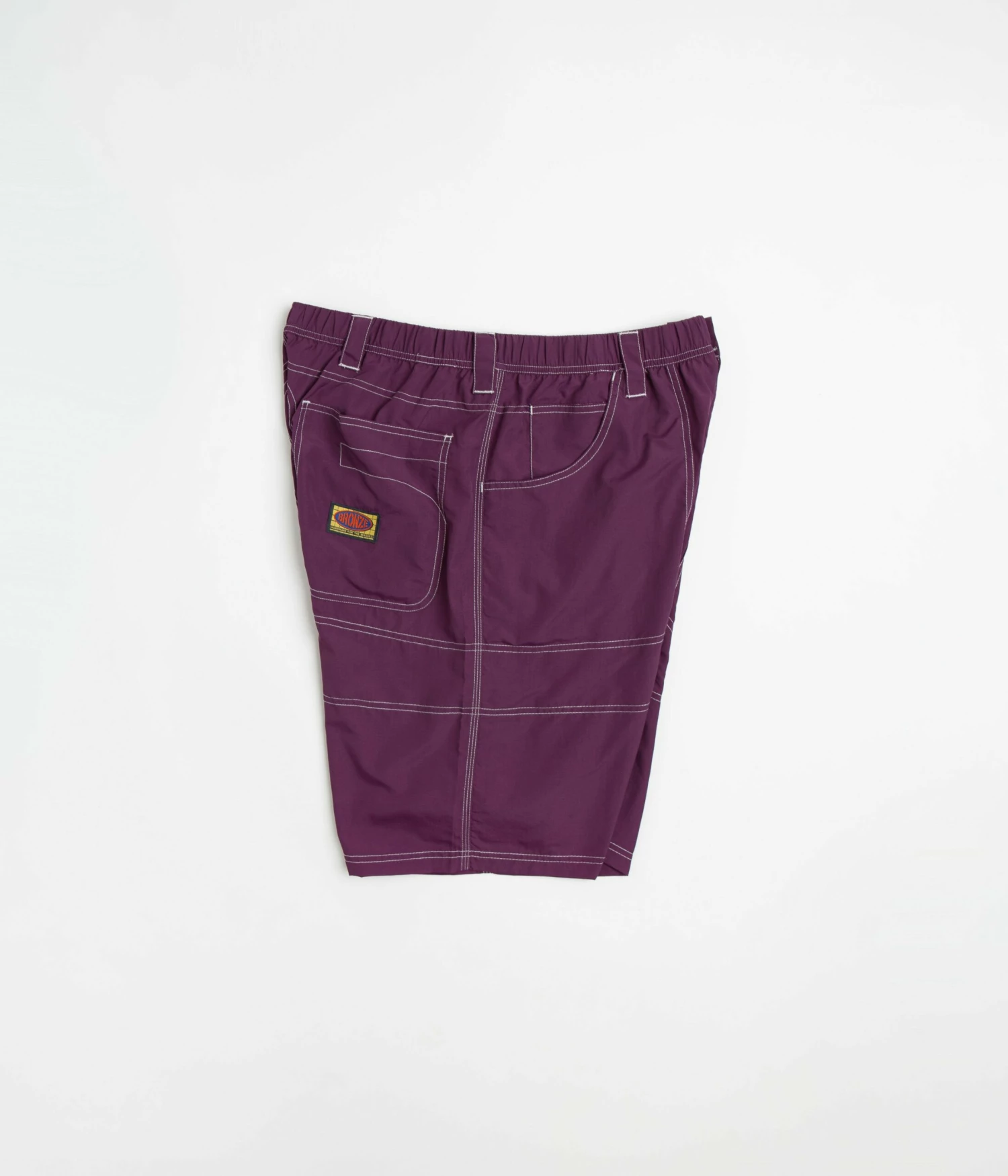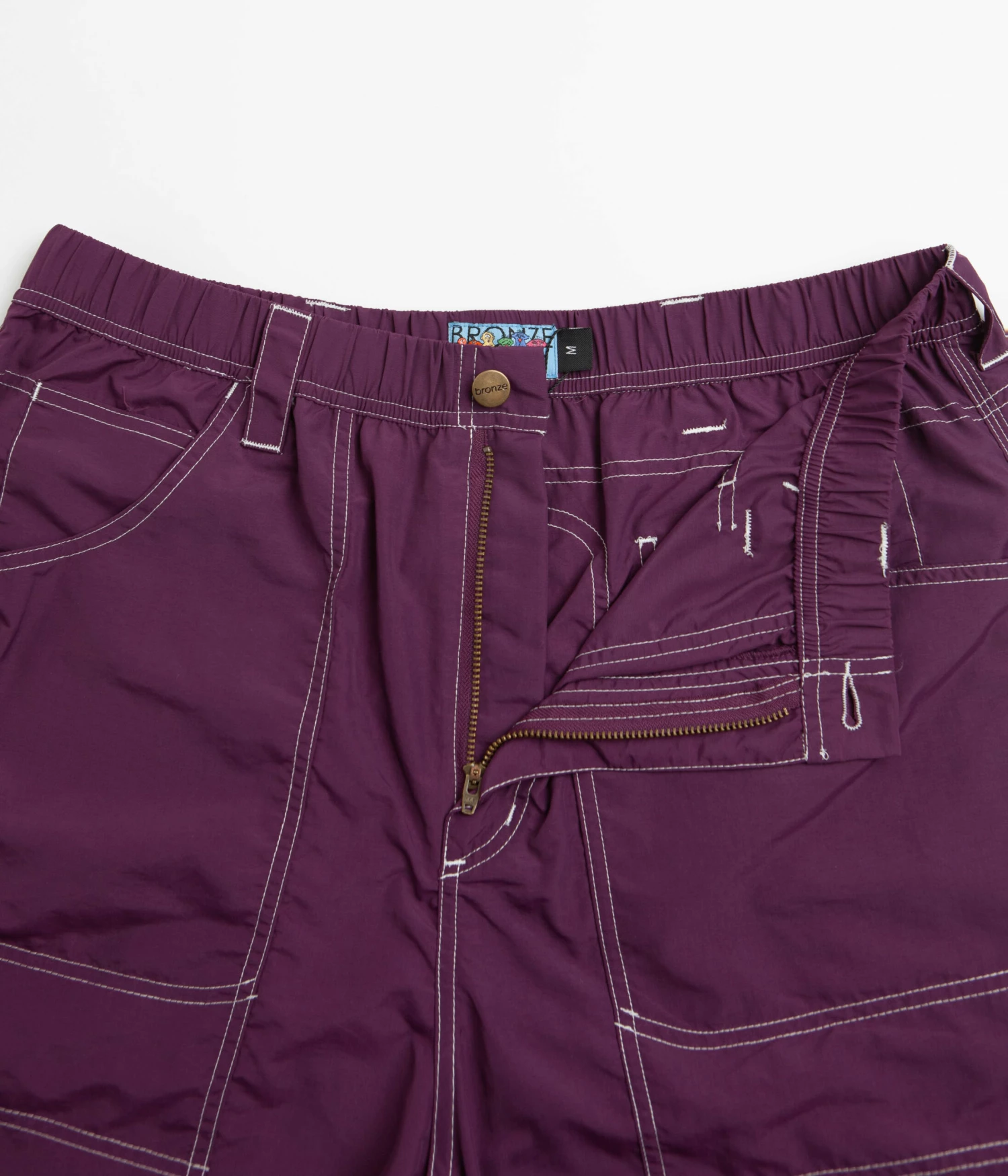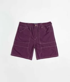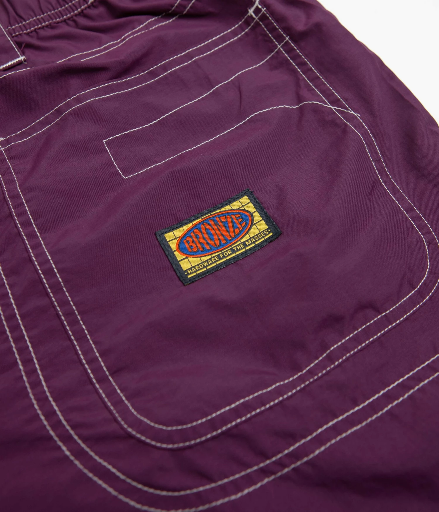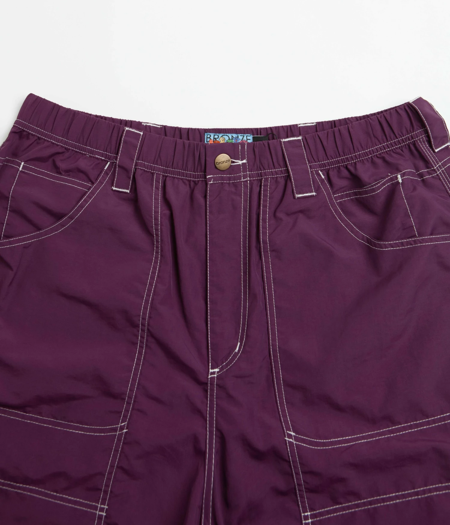 Bronze 56K Double Knee Shorts in Eggplant. Workwear inspired and made from 100% nylon, these Bronze 56K shorts are tailored to a regular fitting with contrast stitch detailing throughout. Featuring a classic belt loop waist, a single button secured zipper fly and double layer knee panels, these burgundy Bronze 56K shorts are finished with two front pockets, two rear pockets and with integrated coin pockets.
