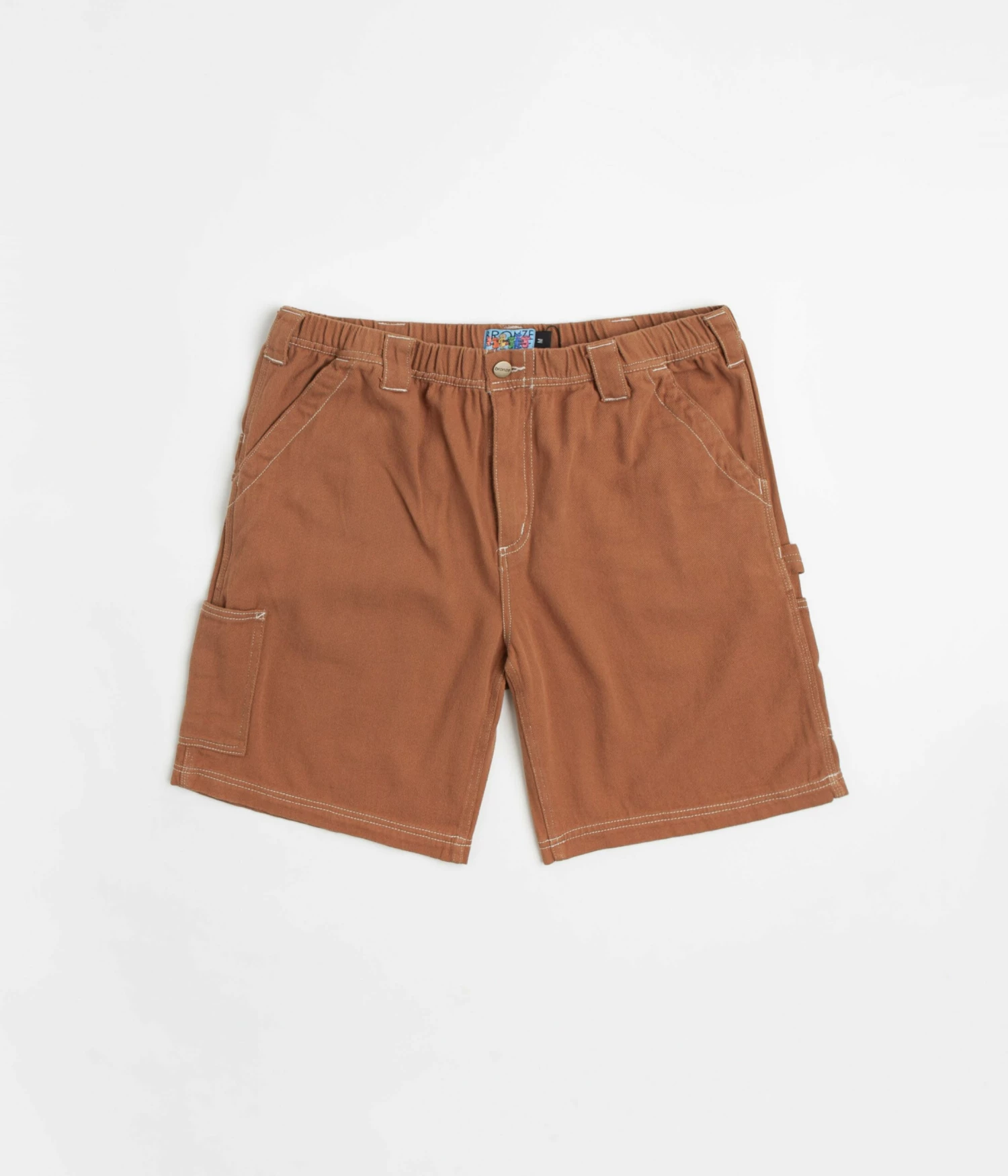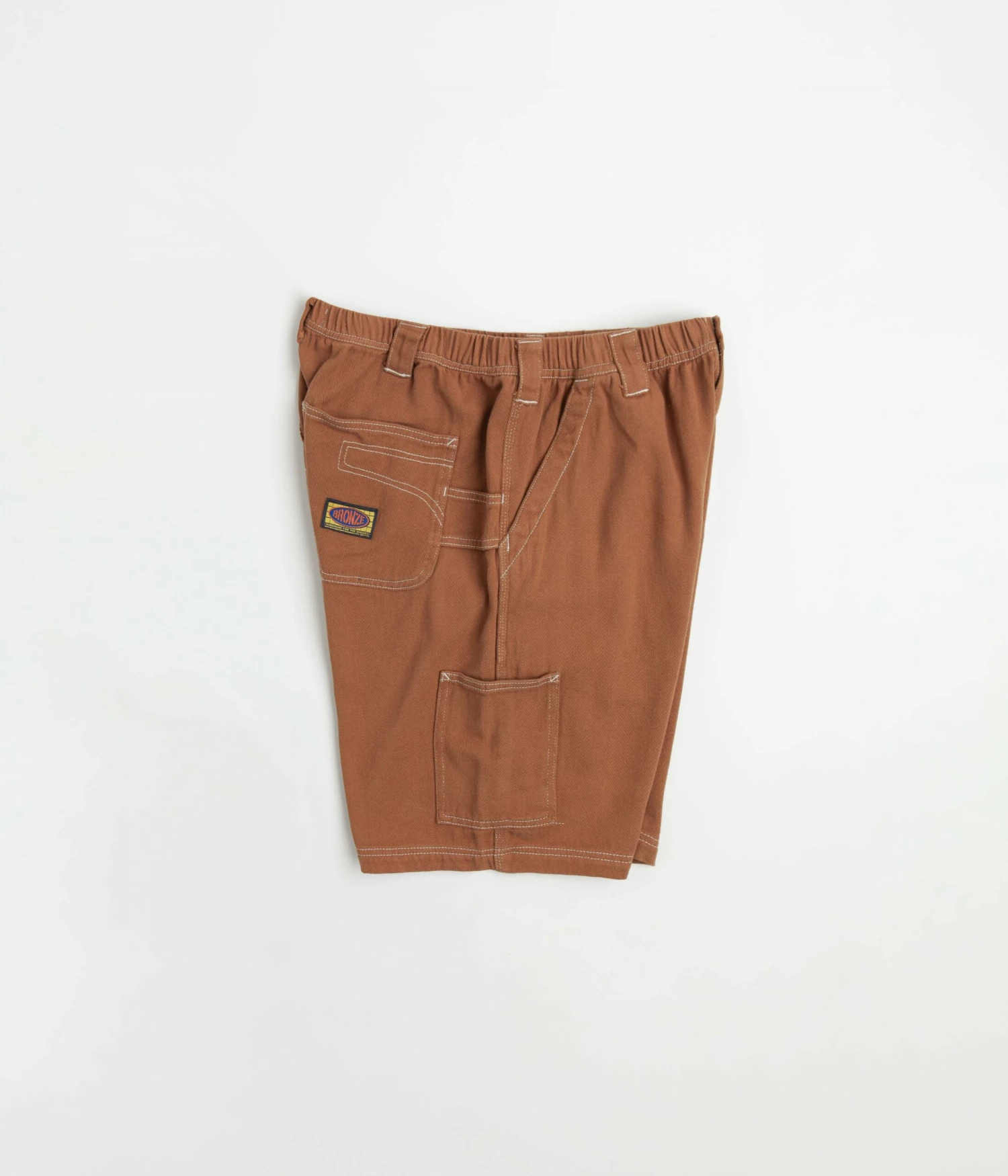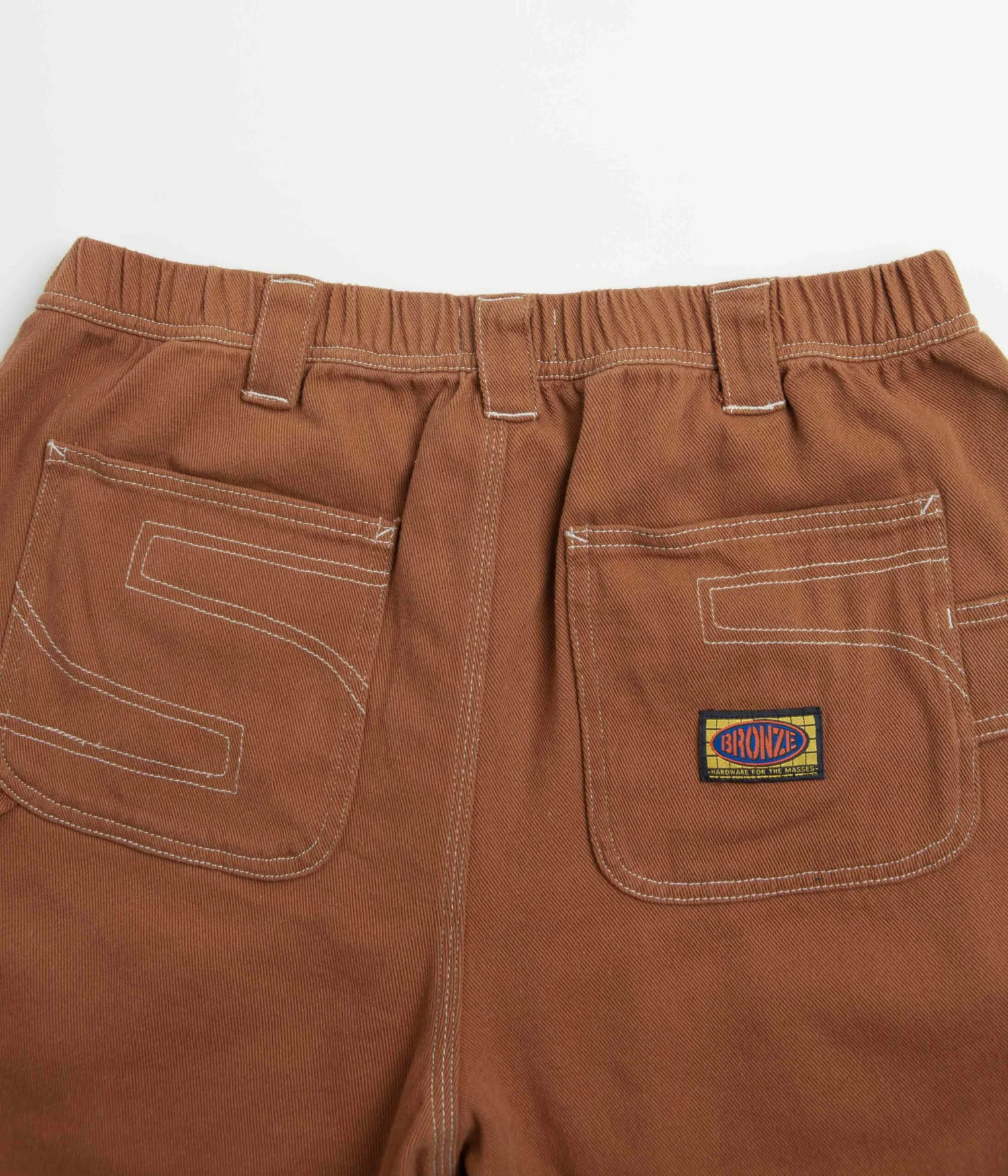 Bronze 56K Karpenter Shorts in Brown. Regular fitting and styled with contrast stitching, these workwear inspired Bronze 56K shorts are styled with a classic belt loop waist and a single button secured zipper fly. Featuring two front pockets, two ‘56’ stitched rear pockets and additional utility pockets, these brown Bronze 56K shorts are finished with a woven flag label and a woven hammer loop.