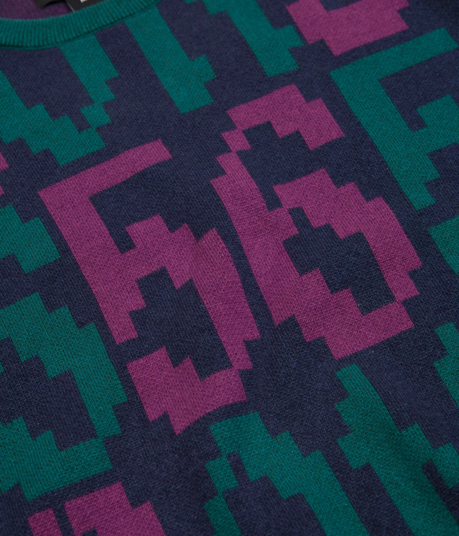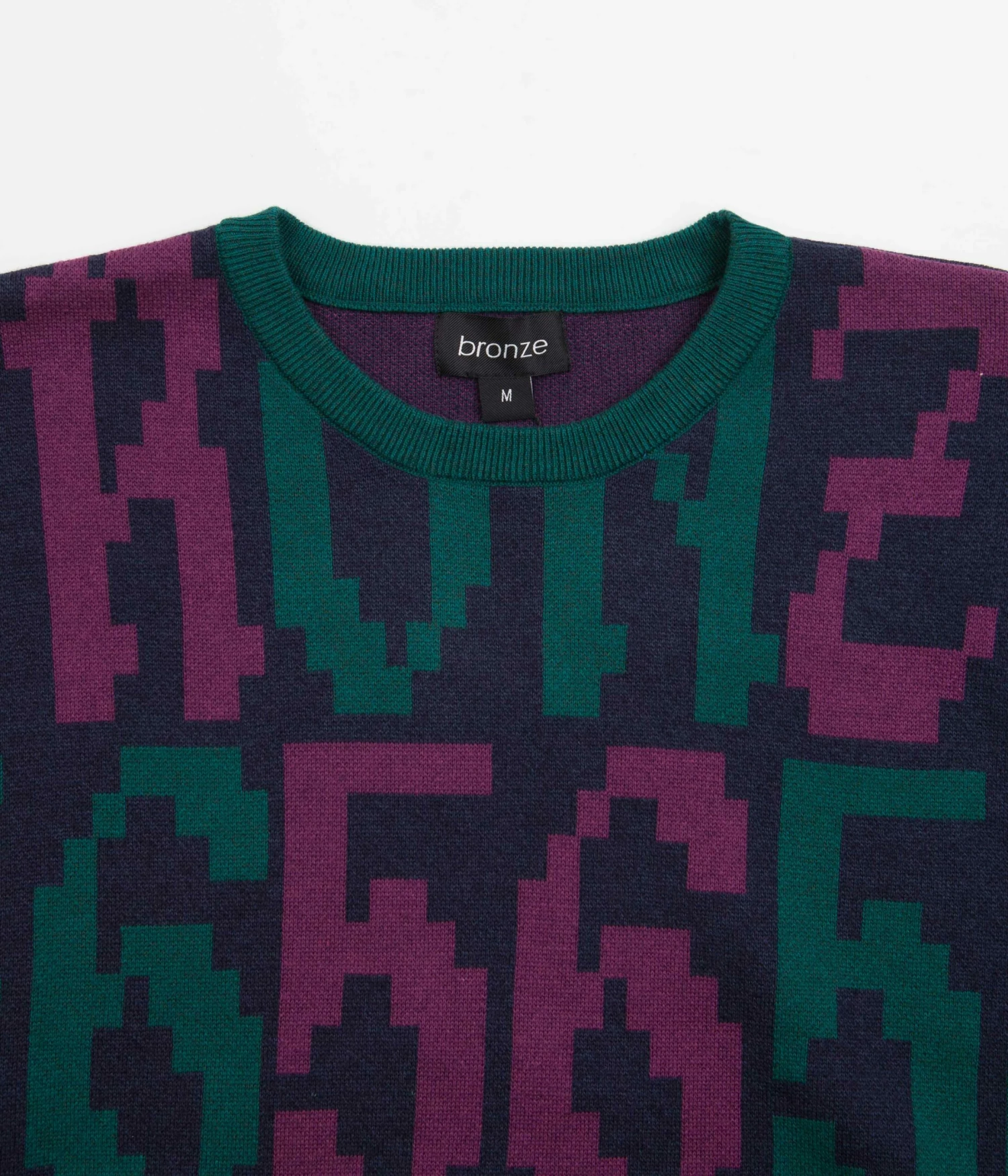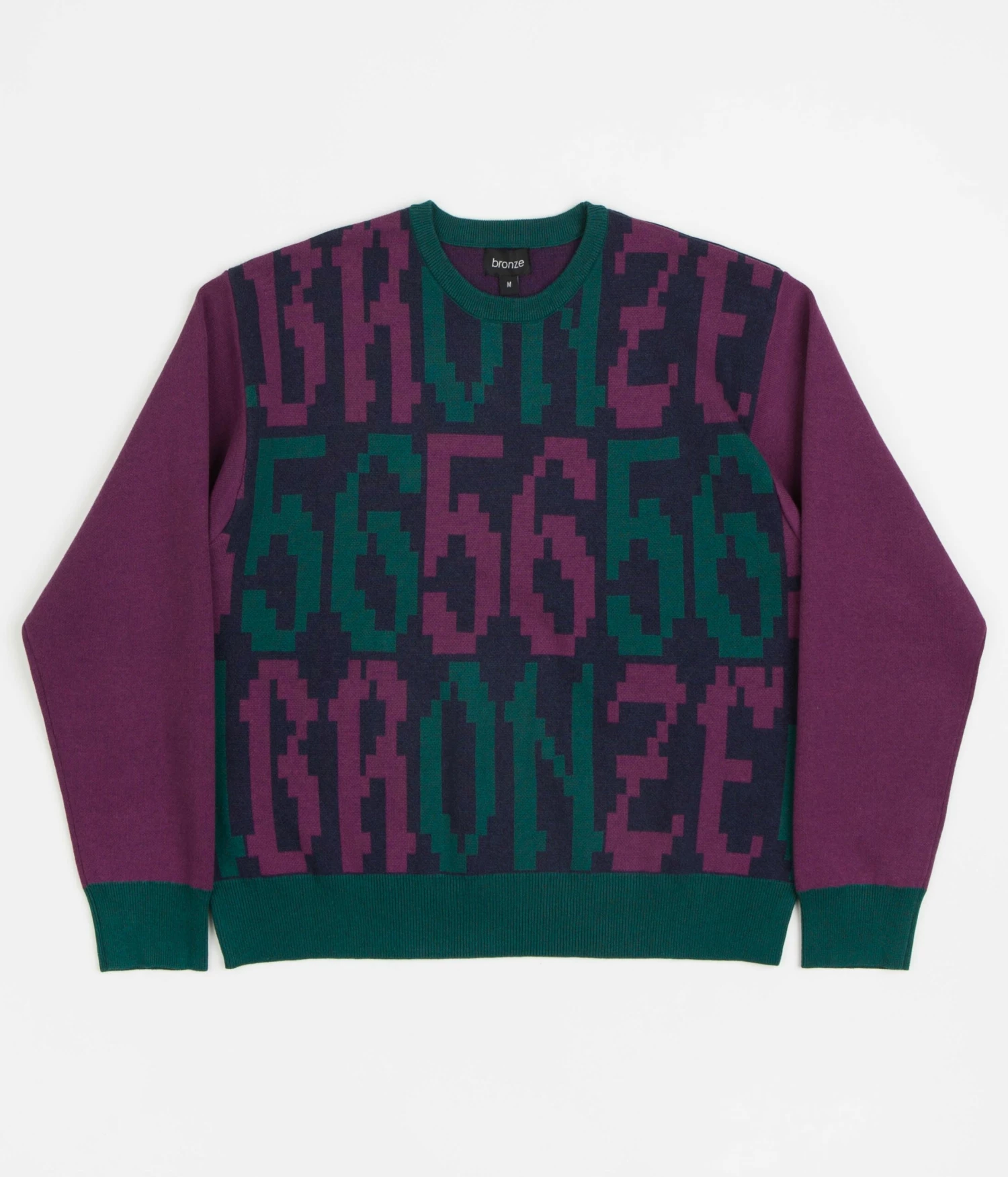 Bronze 56K Old E Crewneck Sweatshirt in Purple and Teal. Tailored to a regular fitting from a cotton-polyester blend, this vintage style Bronze 56K sweatshirt is styled with a colour block crew collar, cuffed sleeves and a woven elastic hem. Finished with block tone sleeves, this purple and teal Bronze 56K sweater is signed off with a repeating ‘BRONZE 56’ archaic script pattern across the front and rear.