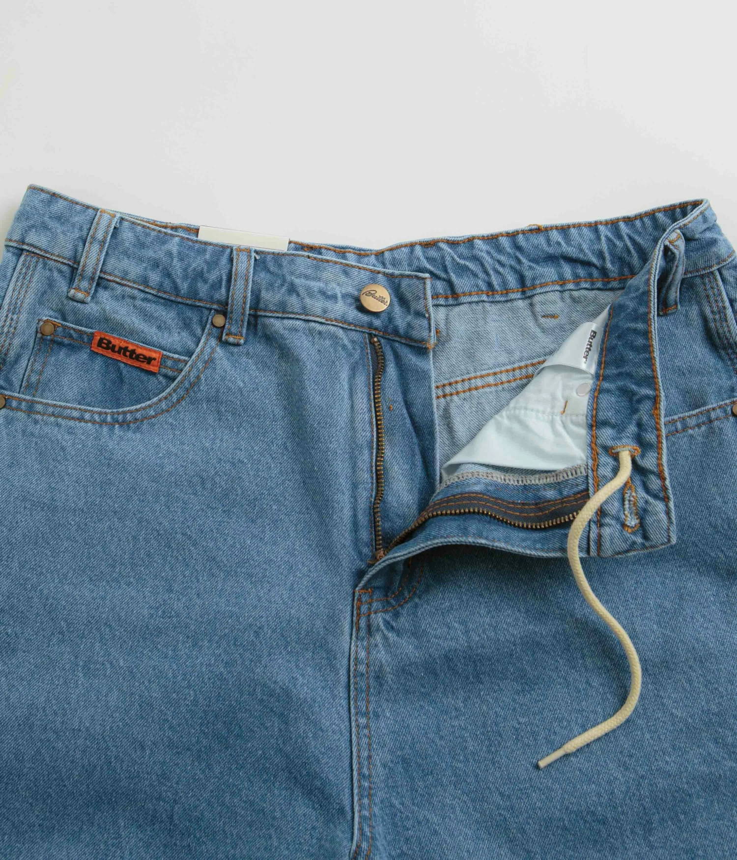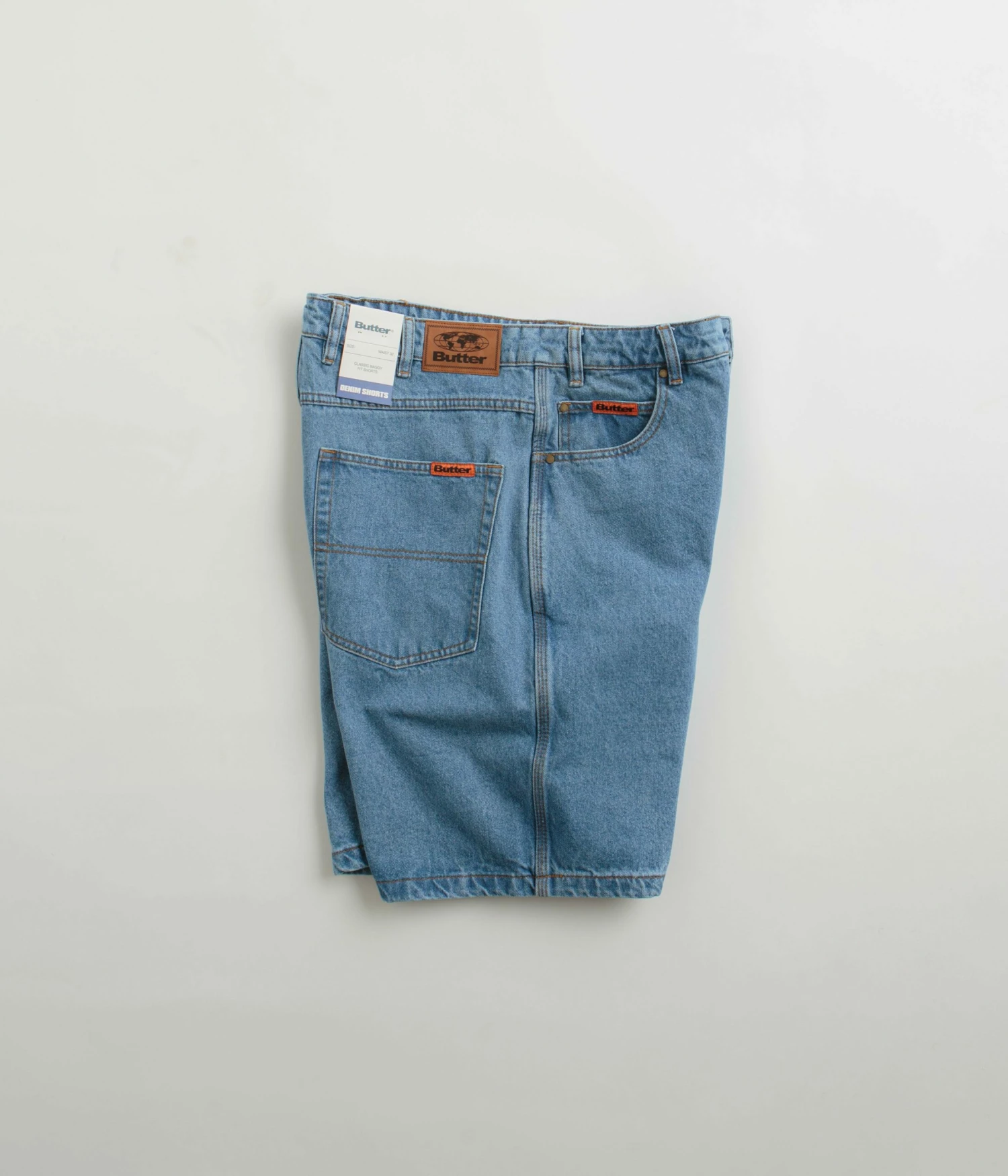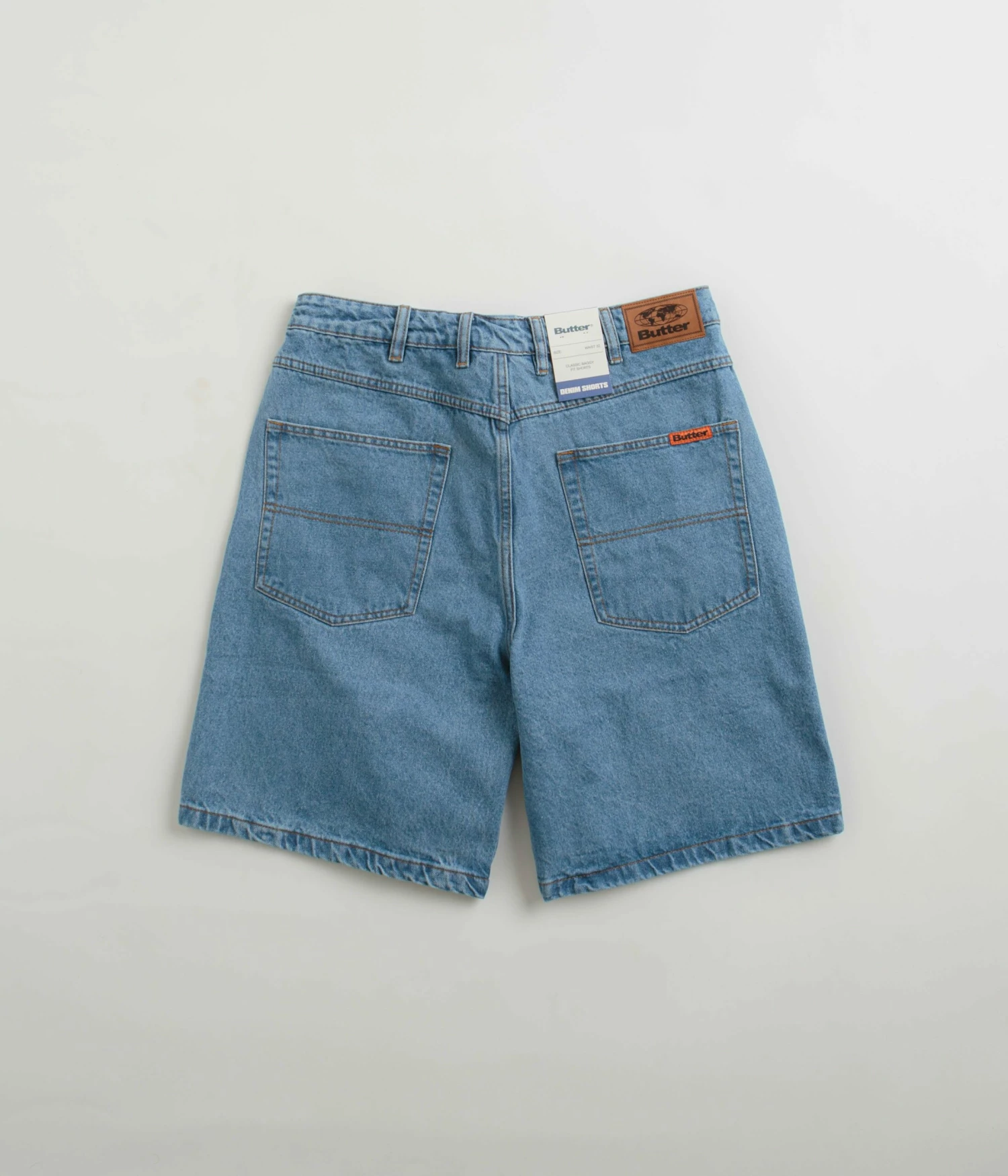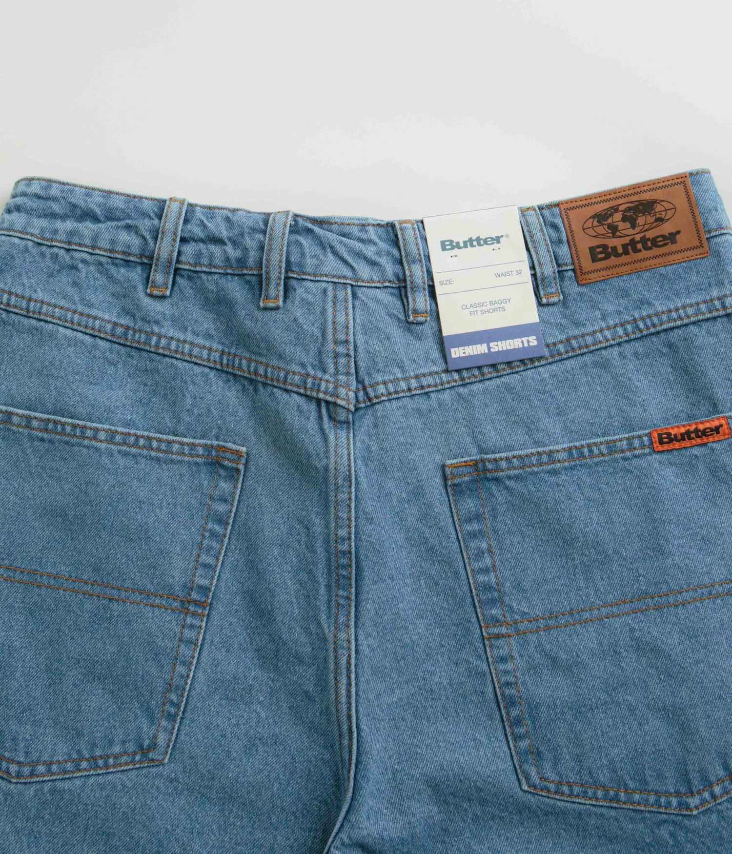 Butter Goods Baggy Denim Shorts in Washed Indigo. Baggy fitting and made from 100% cotton denim, these Butter Goods shorts are designed with contrast stitched seams and a belt loop waist. Featuring a single button secured zipper fly, these washed blue Butter Goods shorts are finished with two front pockets, two rear pockets, a flag labelled coin pocket and with a woven PU rear belt patch.
