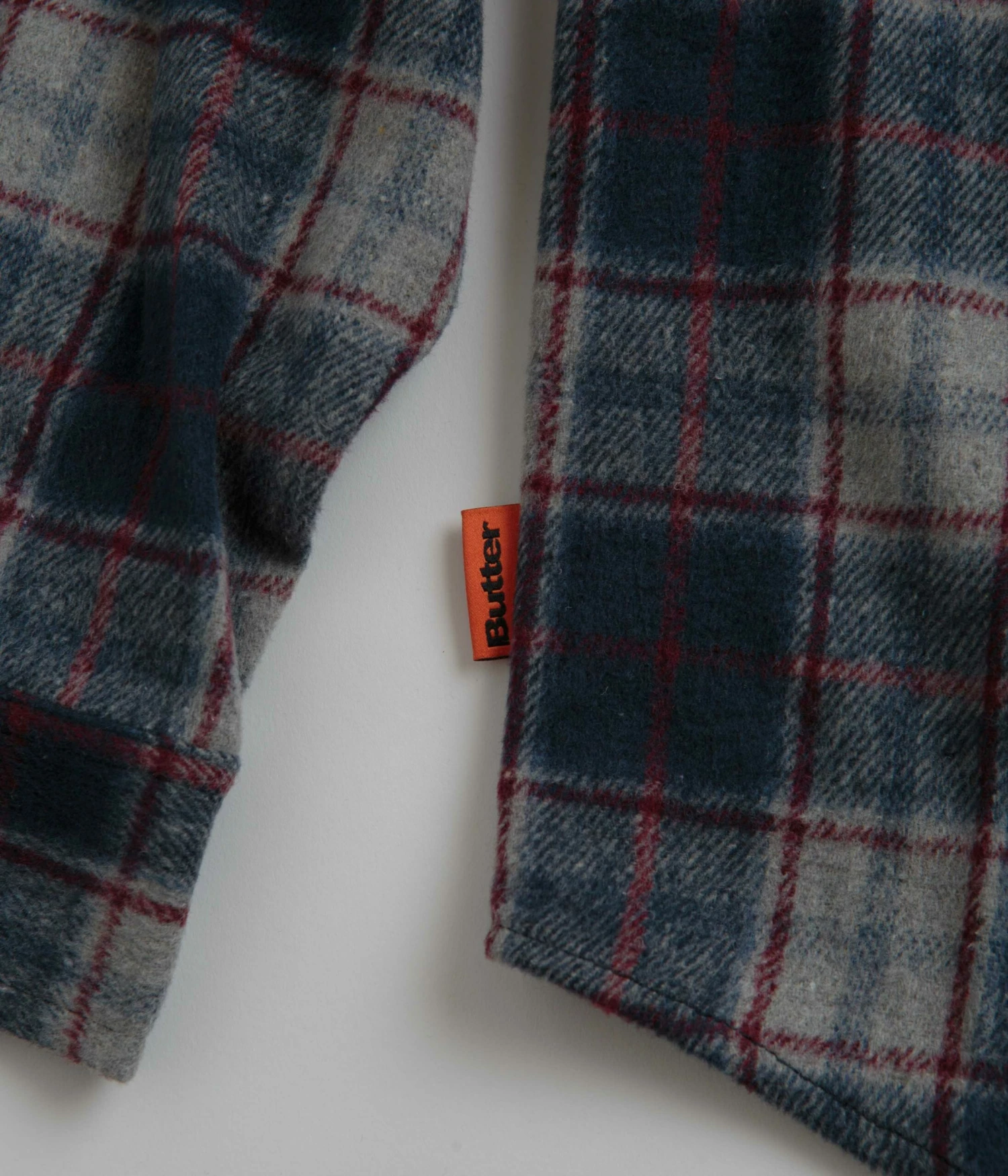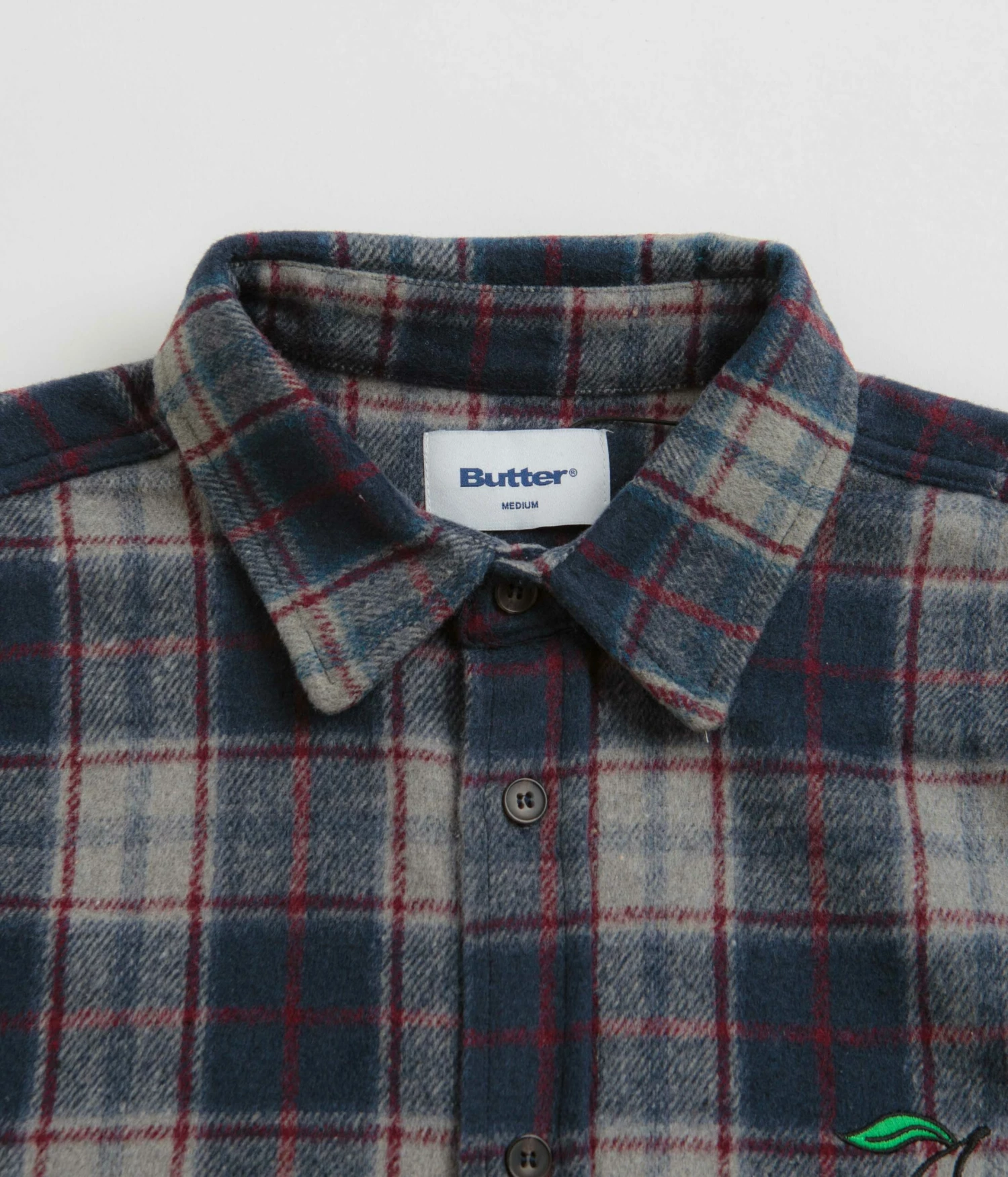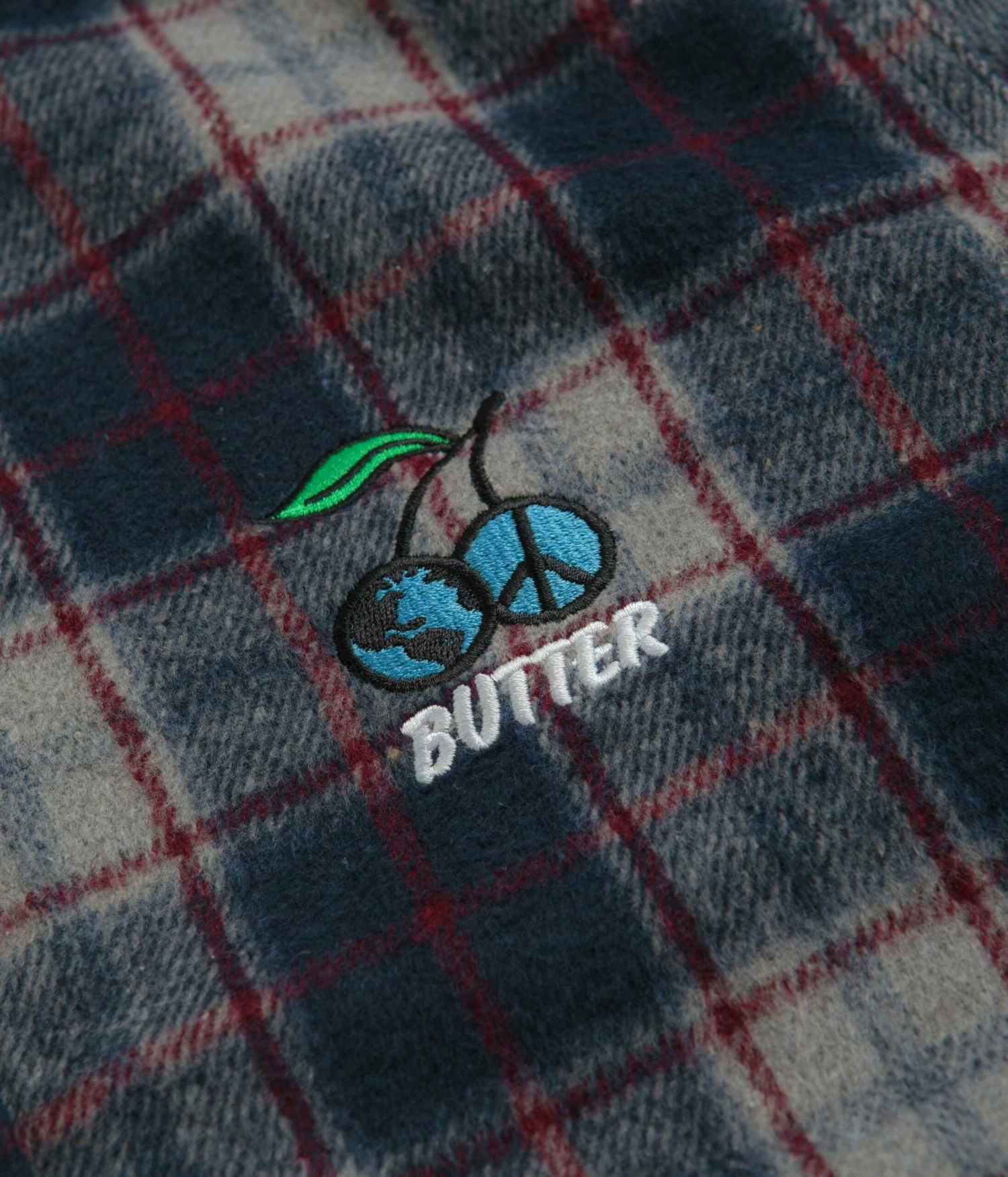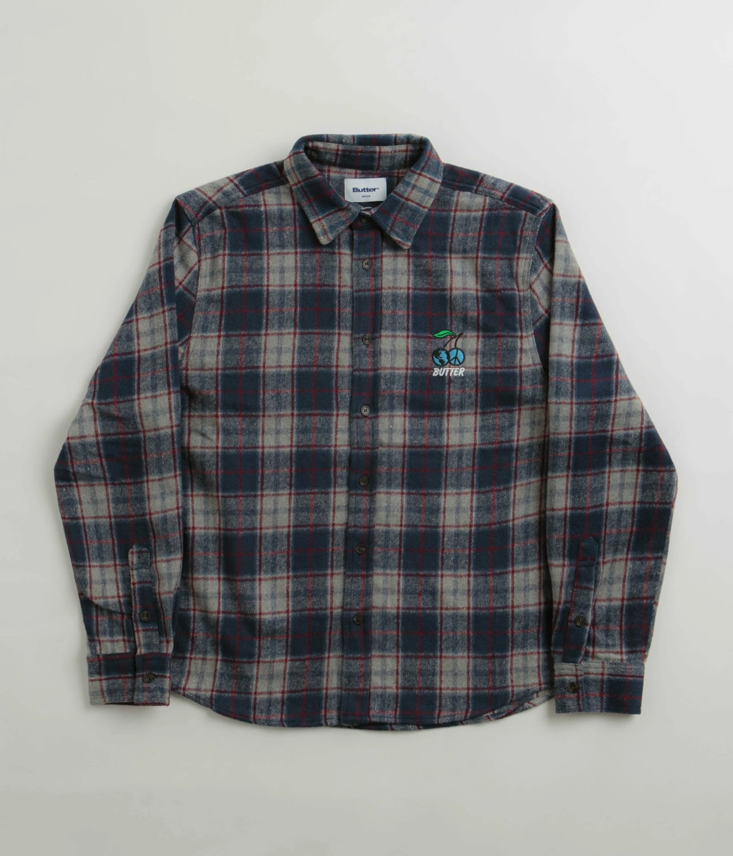 Butter Goods Cherry Flannel Shirt in Navy. Made from 100% polyester, this midweight Butter Goods shirt is tailored to a regular fitting with an all-over plaid pattern. Featuring a classic stand collar and a full length button fastening, this navy Butter Goods shirt is finished with a curved hem, adjustable cuffs and with an embroidered Butter chest graphic.