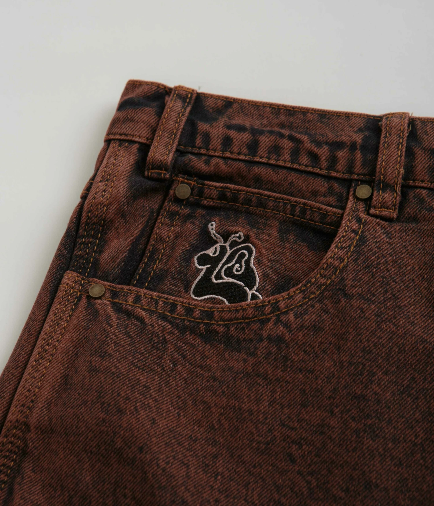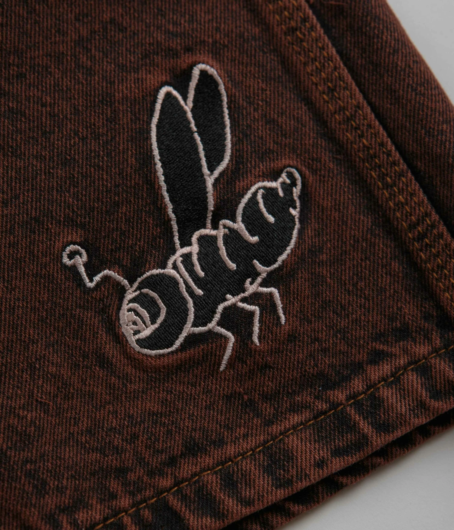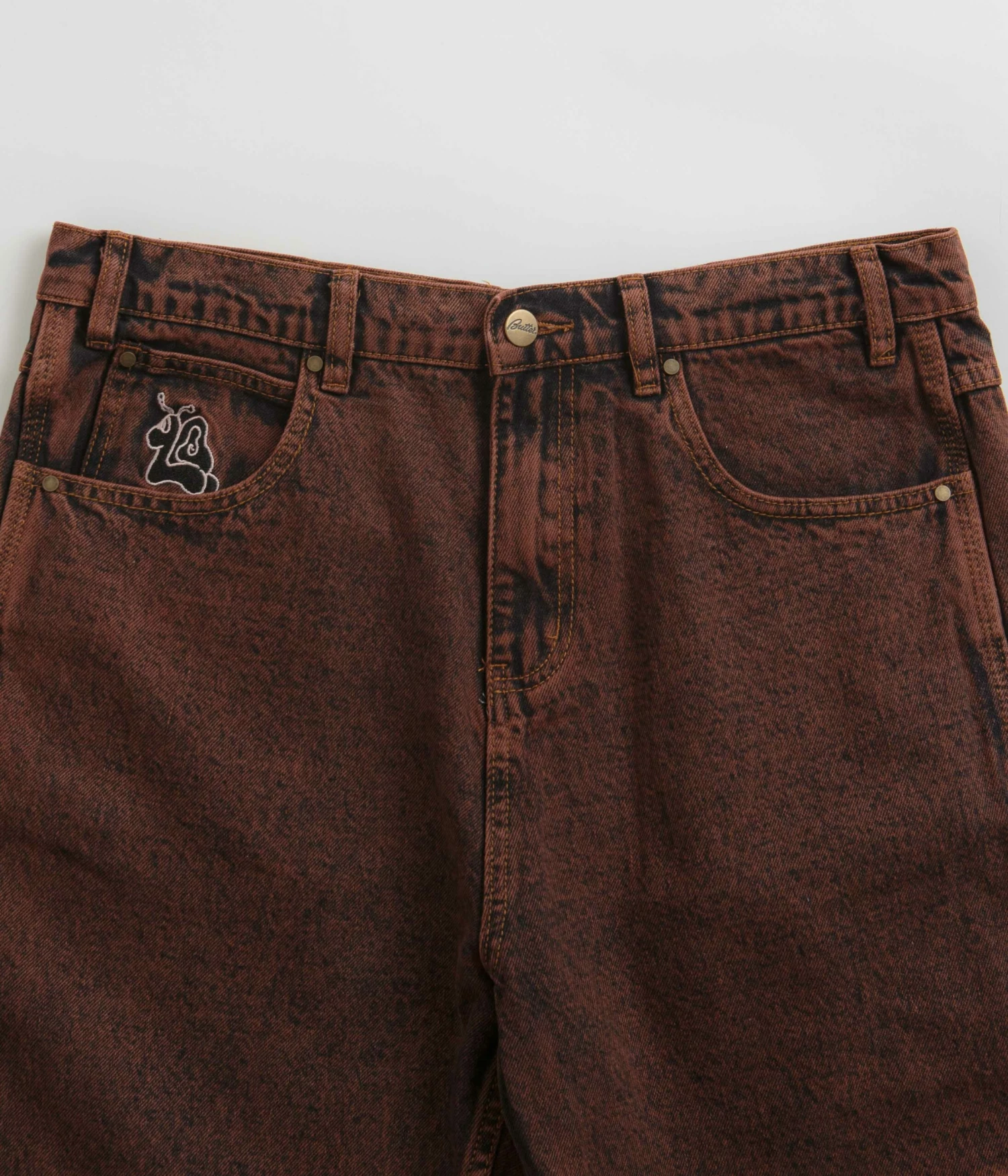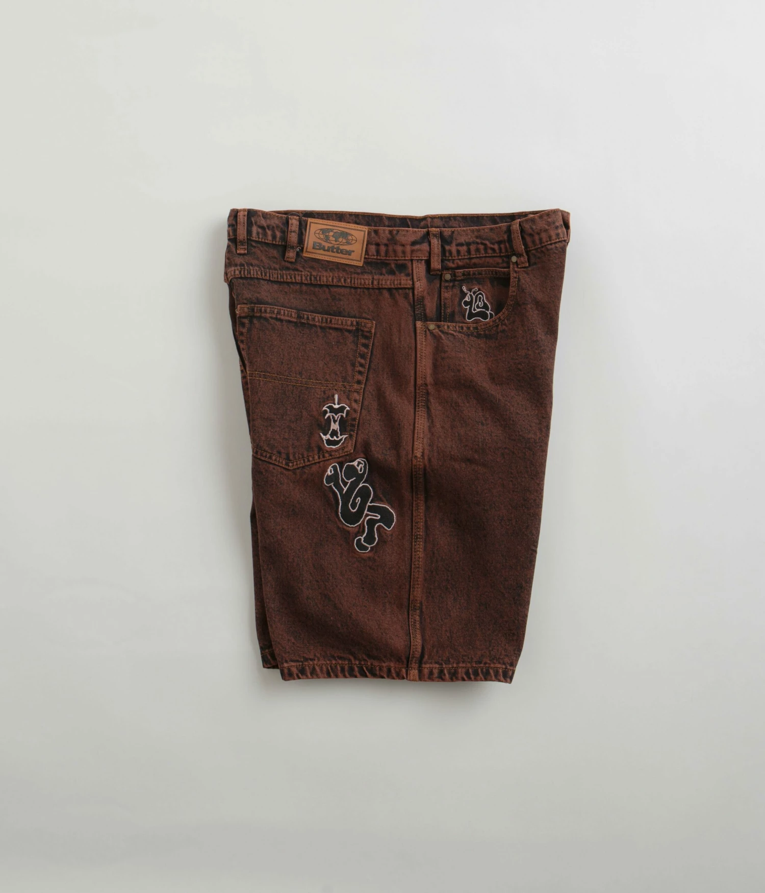 Butter Goods Critter Baggy Denim Shorts in Brick. Designed with a washed fabrication, these baggy fitting Butter Goods shorts are made from 100% cotton denim. Featuring all-over embroidered graphics, a classic belt loop waist and a single button secured zipper fly, these brown red Butter Goods shorts are finished with two front pockets, two rear pockets, an embroidered coin pocket and with a woven PU rear belt patch.