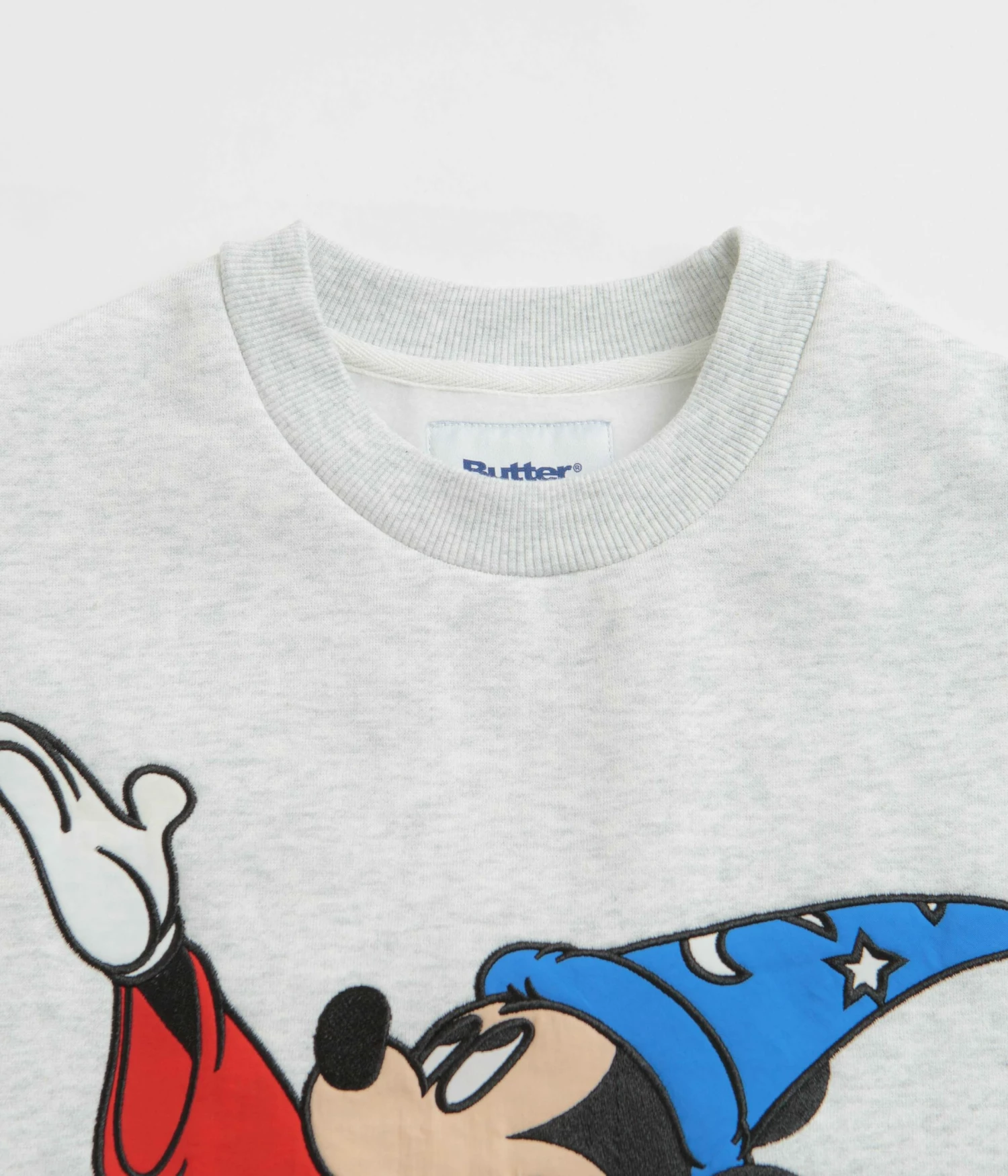 Butter Goods Fantasia Crewneck Sweatshirt in Ash Grey. Part of the brand’s latest collaboration with Disney, this regular fitting Butter Goods sweatshirt is made from a cotton polyester blend with a ribbed collar and rib knit cuffs. Featuring a woven elastic hem, this grey Butter Goods sweater is finished with a nylon applique Fantasia chest graphic with additional Butter branding displayed across the rear.