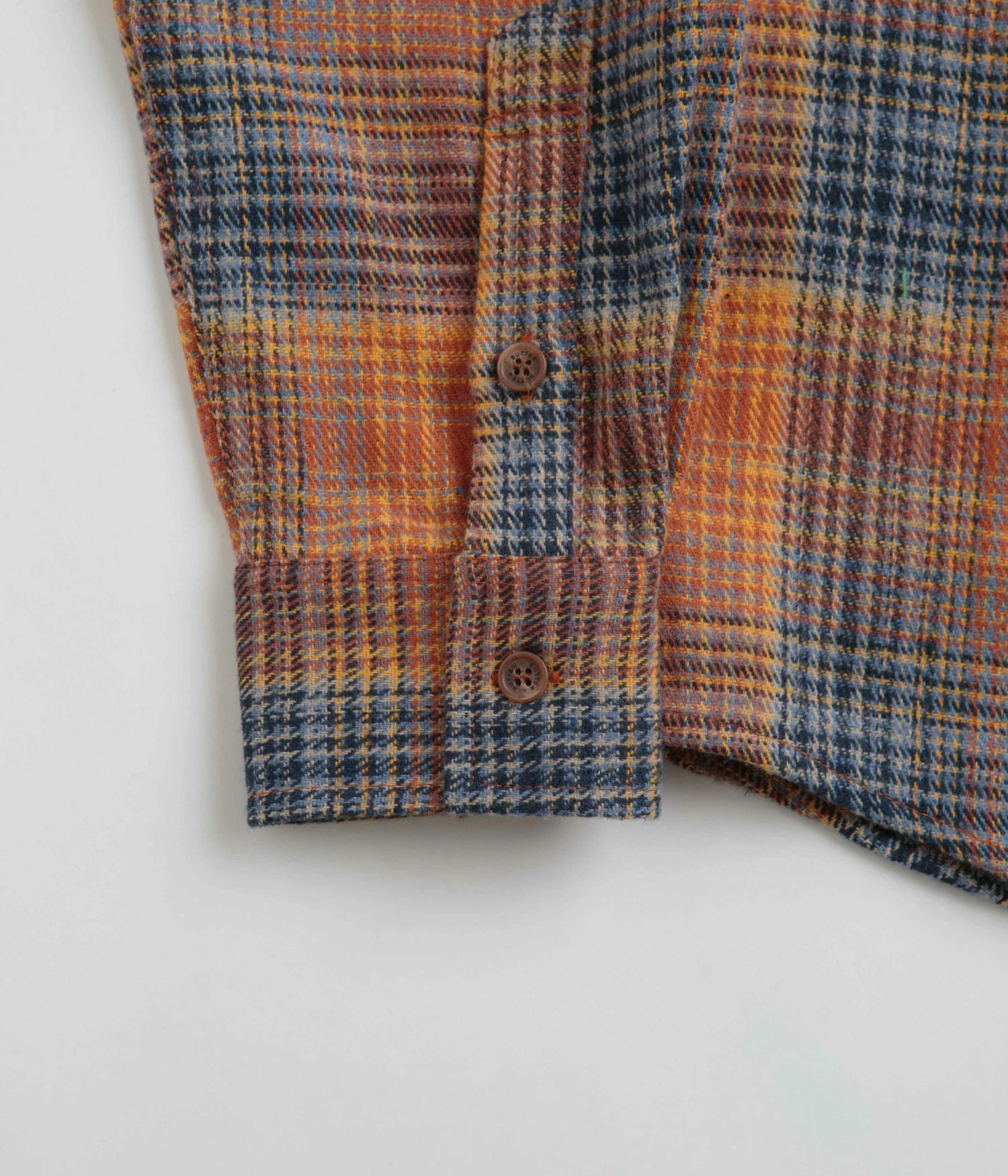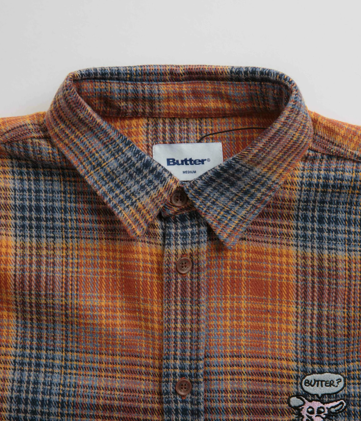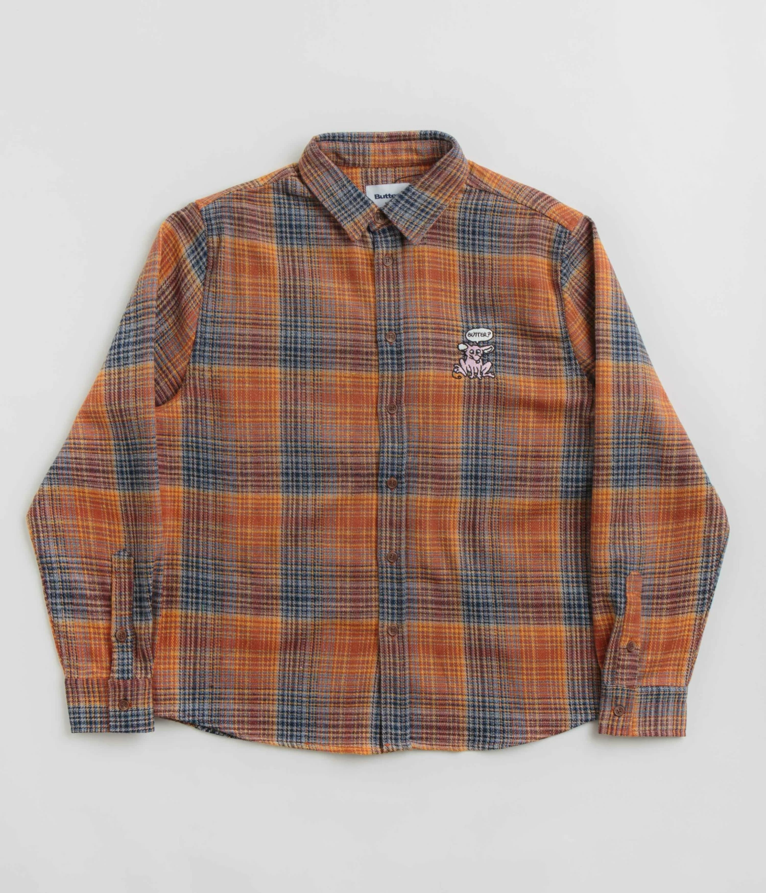 Butter Goods Rodent Flannel Shirt in Rust and Navy. Regular fitting and made from 100% polyester plaid, this new season Butter Goods shirt is designed with a classic stand collar and a full length button fastening. Featuring adjustable cuffs and a curved hem, this orange blue Butter Goods shirt is finished with embroidered front and rear graphics.