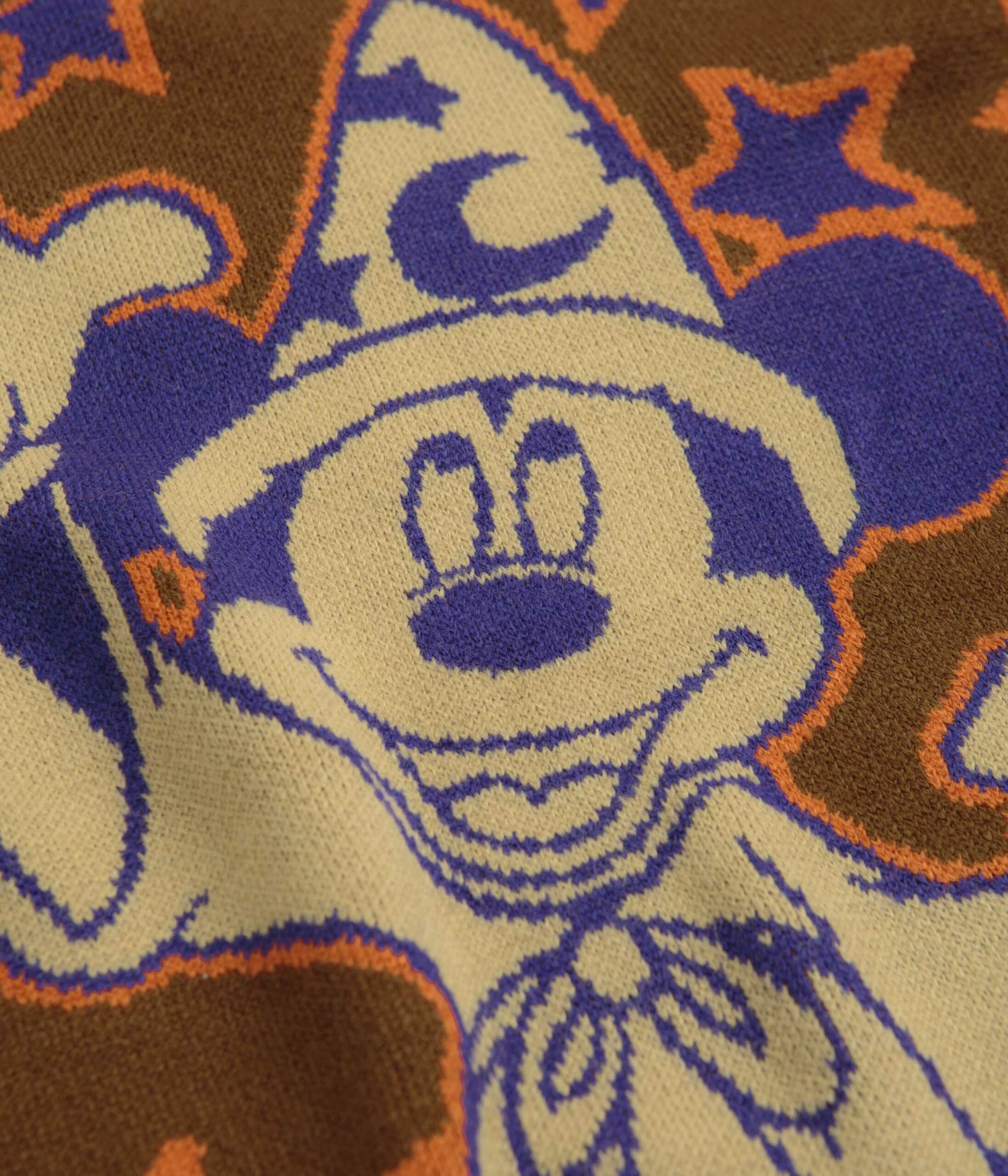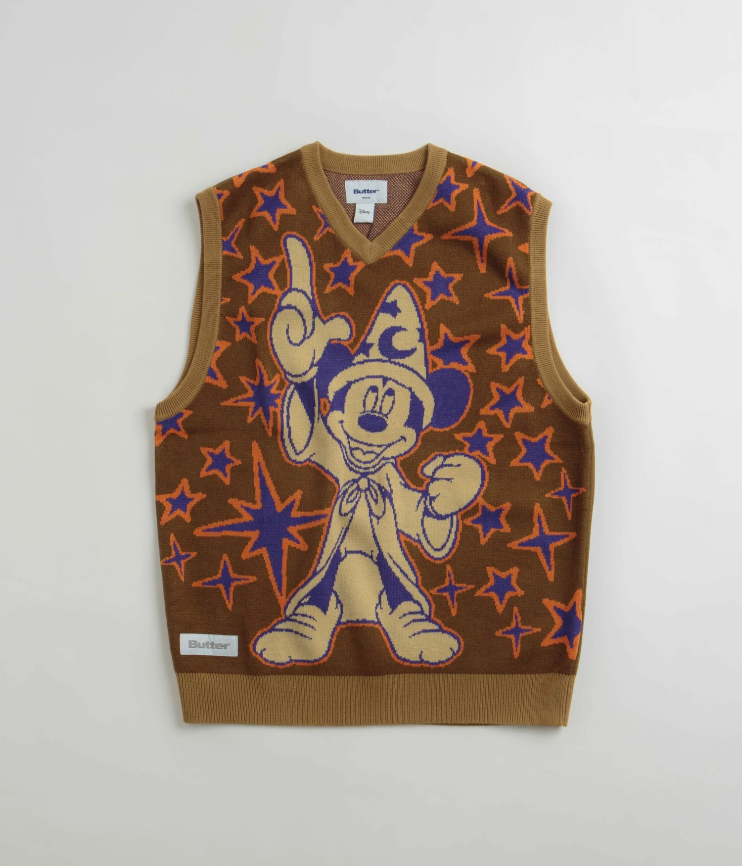 Butter Goods Starry Skies Knitted Vest in Brown. Made from 100% acrylic, this Butter Goods vest arrives as part of the brand’s latest collaboration with Disney. Featuring a ribbed V-neck collar and a woven elastic hem, this brown Butter Goods vest is finished with a fully fashioned jacquard knit, a woven flag label and with Fantasia artwork.