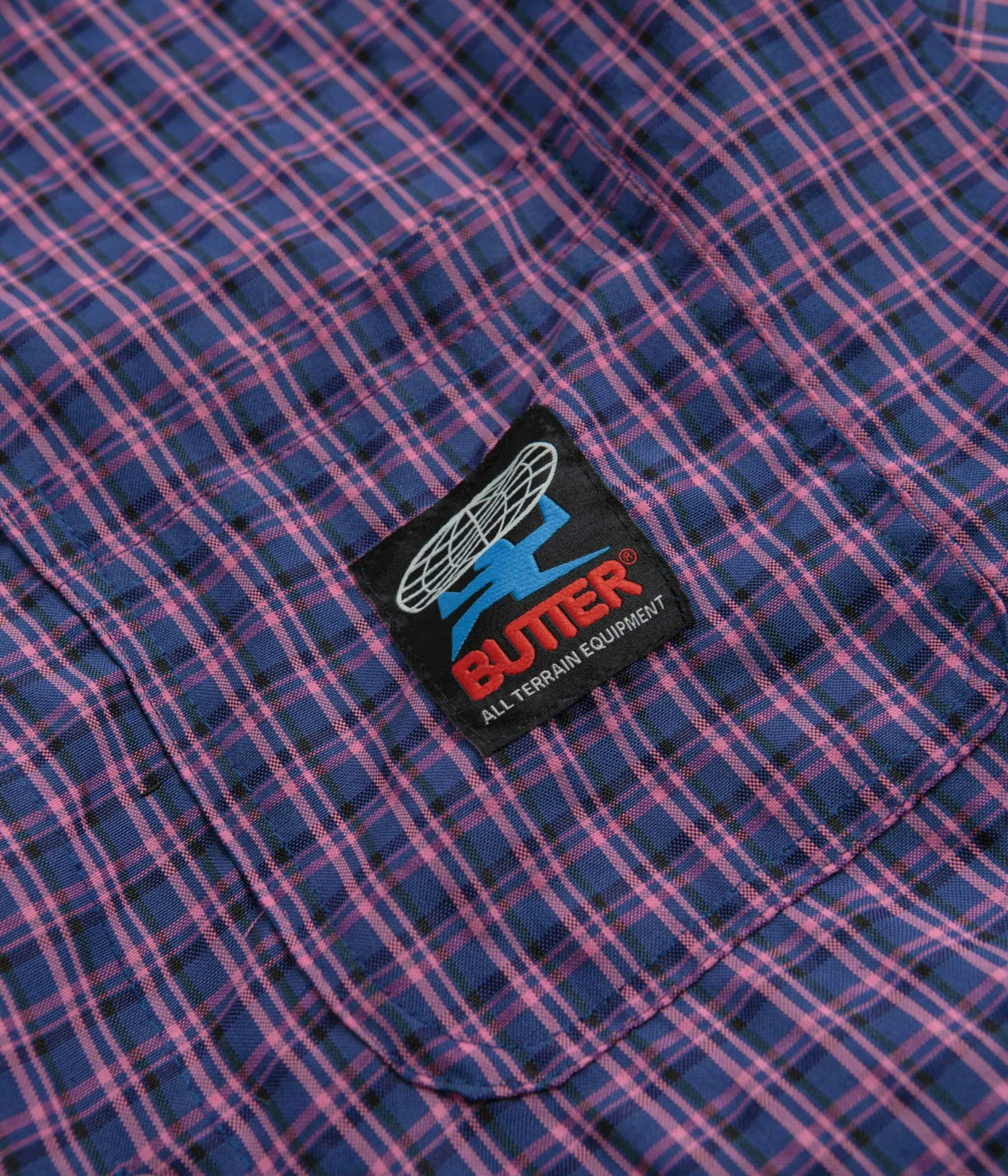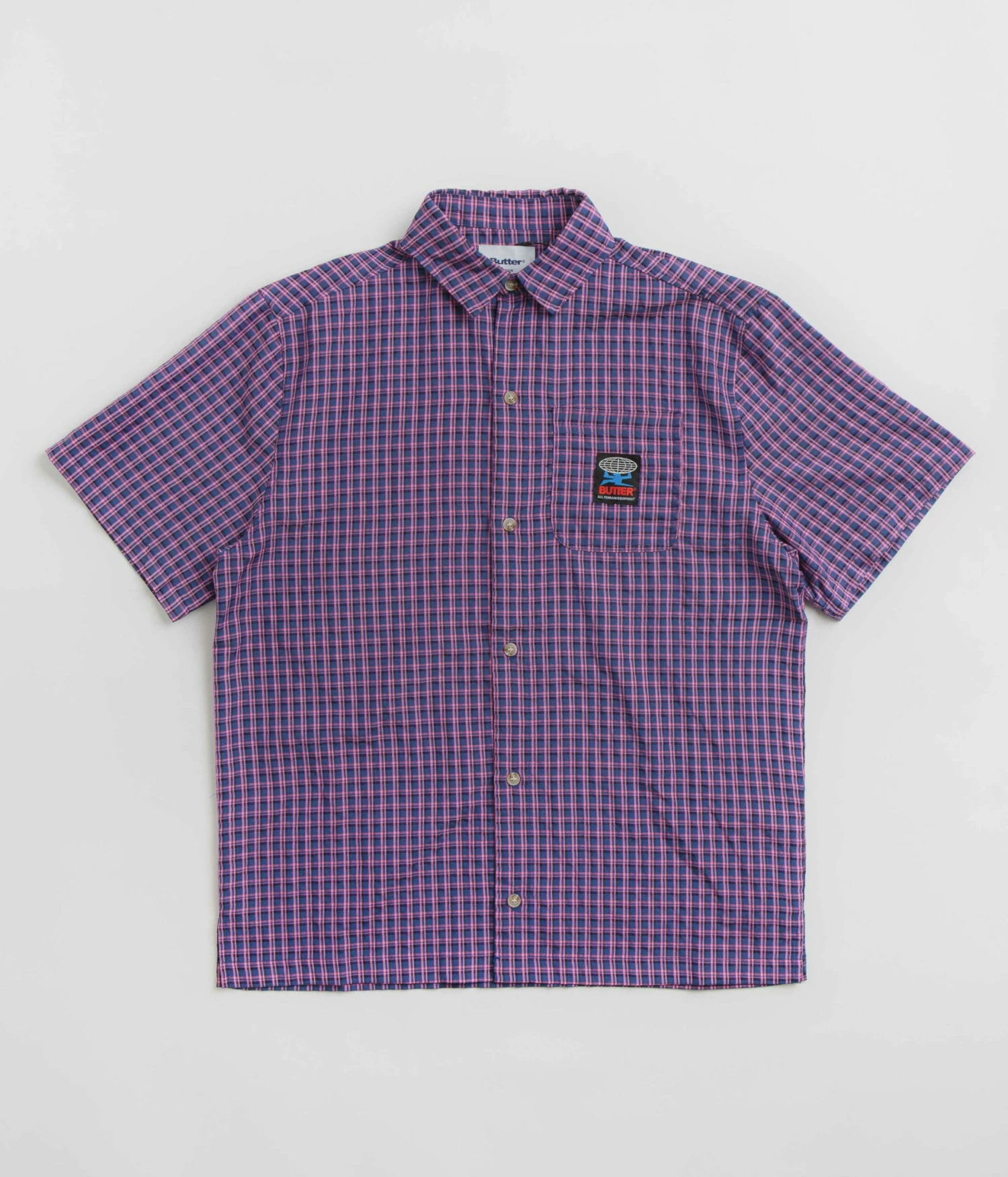 Butter Goods Terrain Short Sleeve Shirt in Navy and Pink. Part of the brand’s latest release, this regular fitting Butter Goods shirt is made from 100% cotton with an all-over plaid pattern. Featuring a classic stand collar and a full length button fastening, this navy and pink Butter Goods shirt is finished with a single left chest pocket and woven flag label branding.