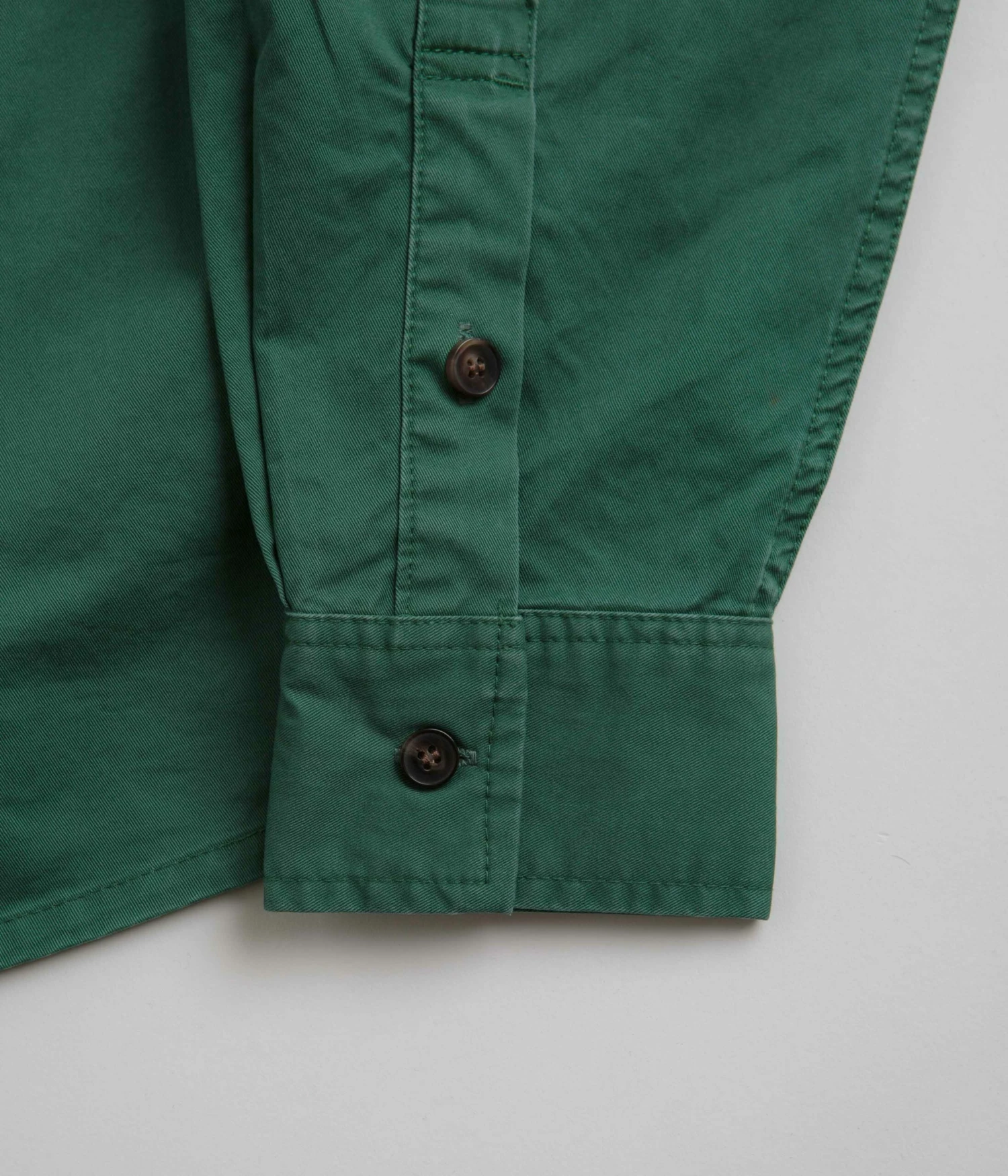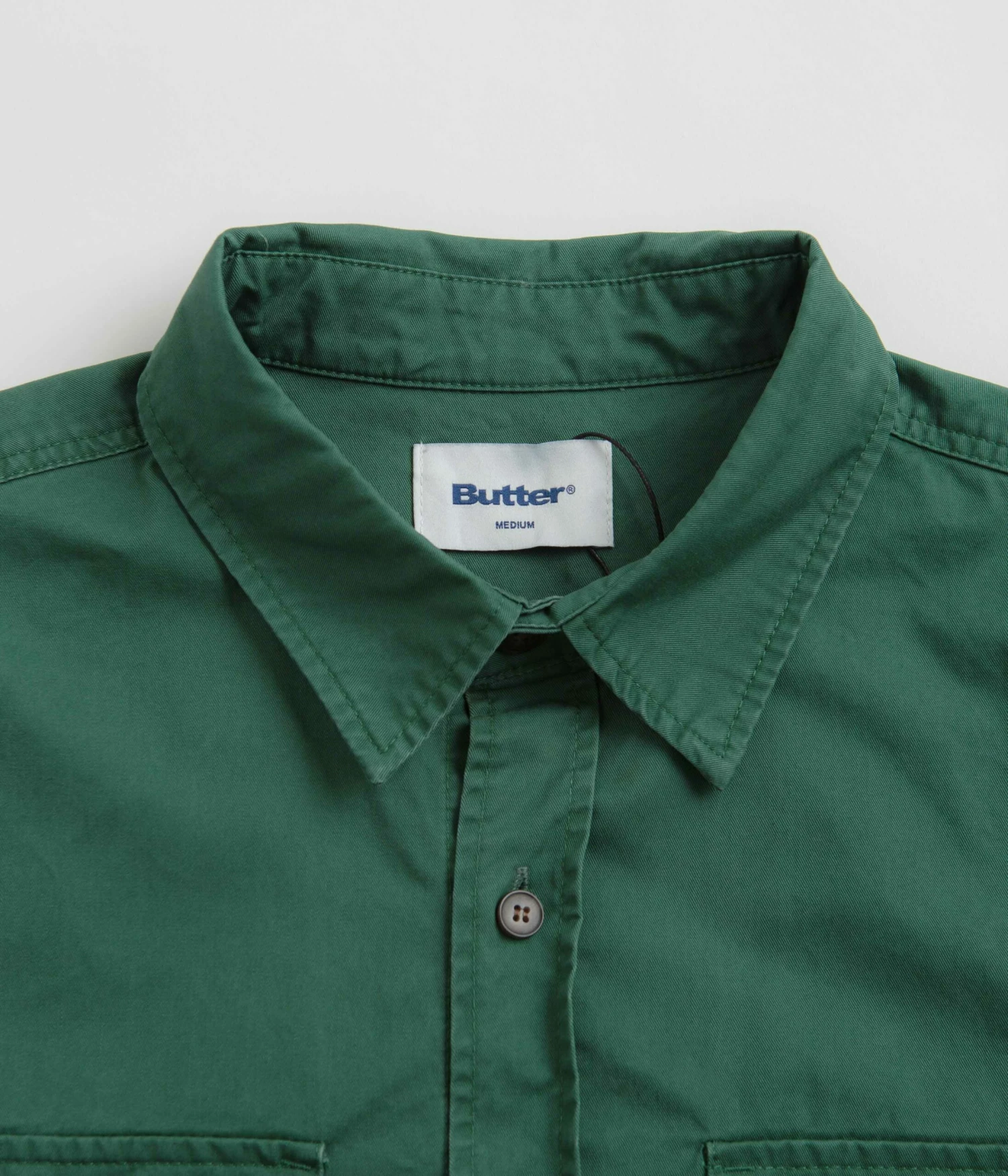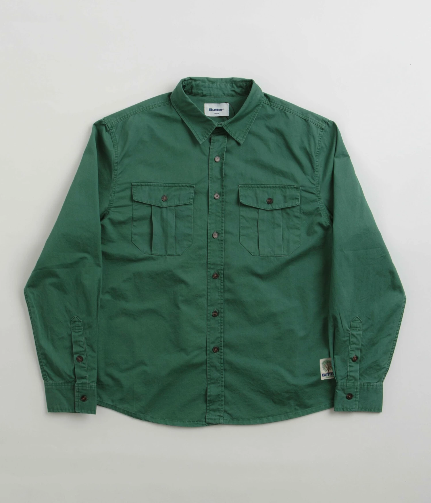 Butter Goods Washed Pocket Shirt in Fern. Utility inspired and tailored to a regular fitting, this new season Butter Goods shirt is made from 100% midweight cotton. Featuring a washed fabrication, a classic stand collar and a full length button fastening, this green Butter Goods shirt is finished with adjustable cuffs, a curved hem, two buttoned chest pockets and with woven flag label branding.