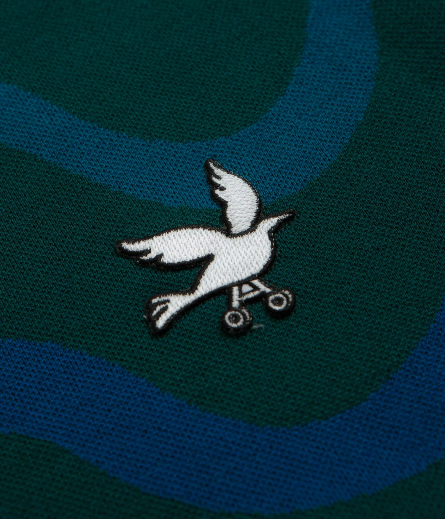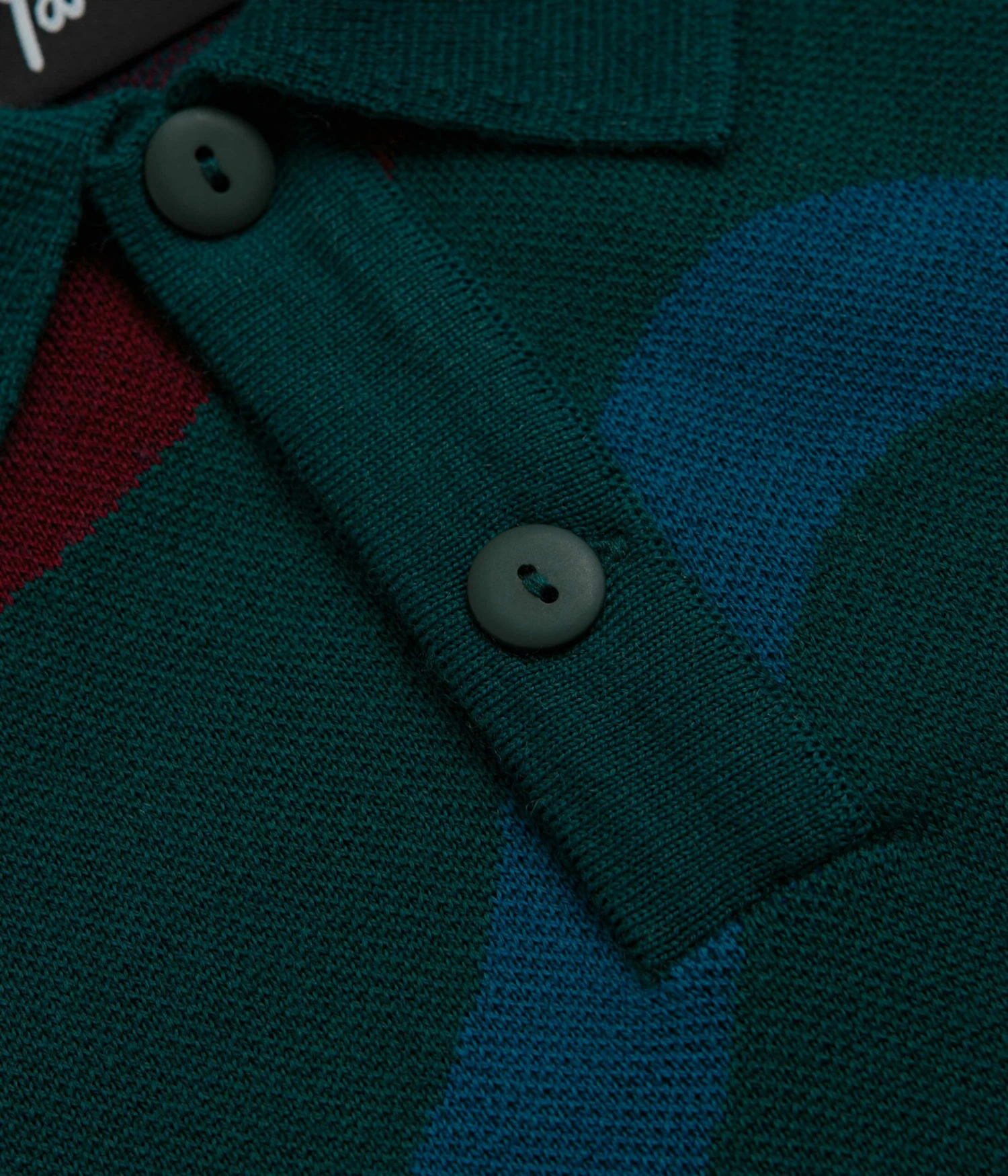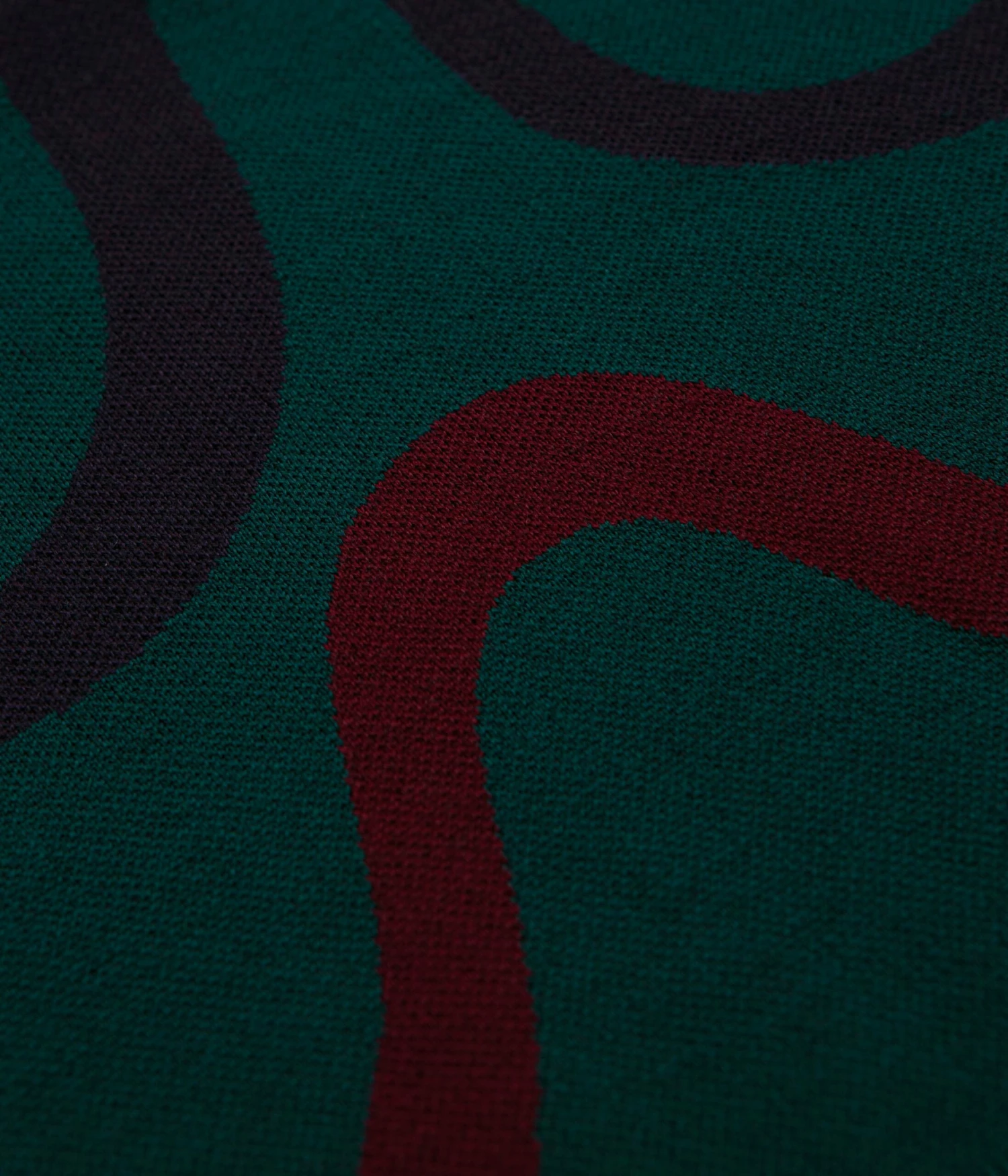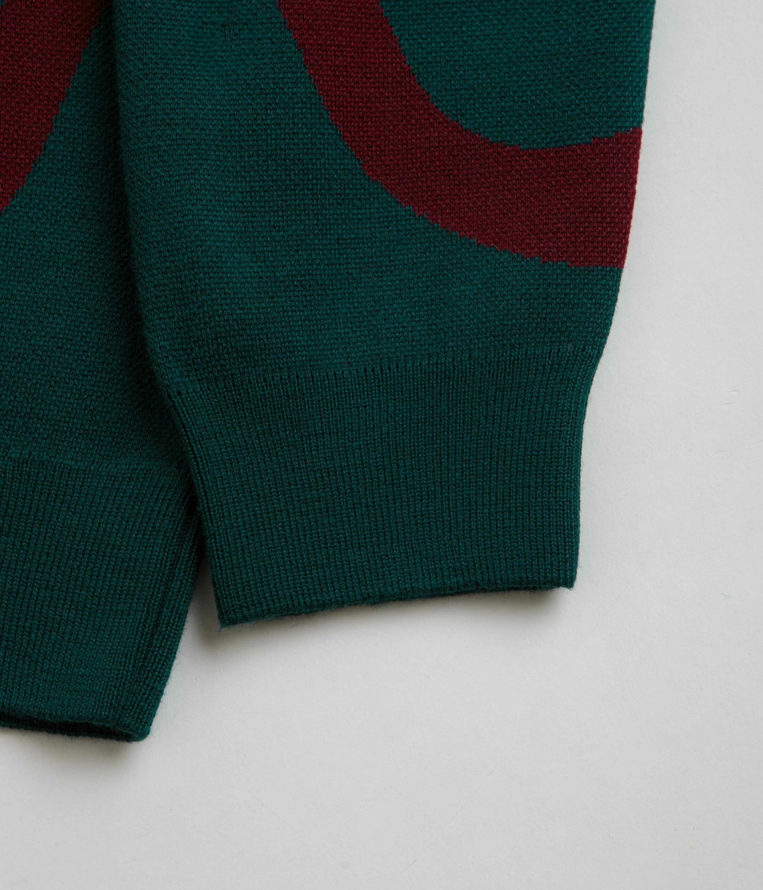 by Parra Colored Soundwave Knitted Polo Sweatshirt in Green. Tailored to a regular fitting from an acrylic-merino wool blend, this by Parra sweatshirt is designed with an all-over jacquard knit pattern. Featuring a double button placket, a classic stand collar, ribbed cuffs and a rib knit hem, this green by Parra sweatshirt is finished with an embroidered left chest graphic.