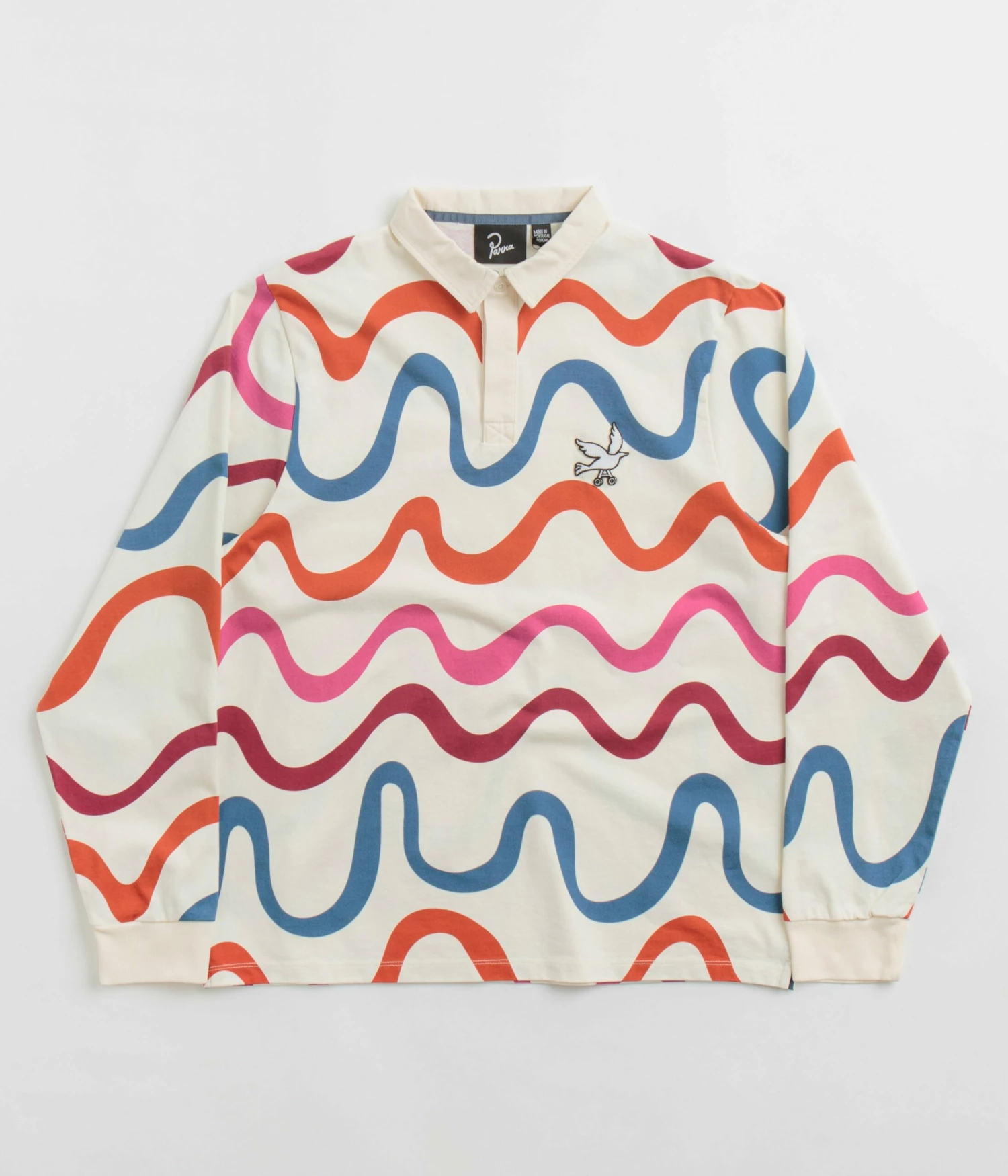 by Parra Colored Soundwave Polo Shirt in Off White. Made from 100% cotton with an all-over pattern, this by Parra polo shirt is designed with ribbed cuffs and with a concealed button placket. Featuring a shortened stand collar, a V-insert hem and contrast stitching, this white by Parra polo shirt is finished with an embroidered left chest graphic.