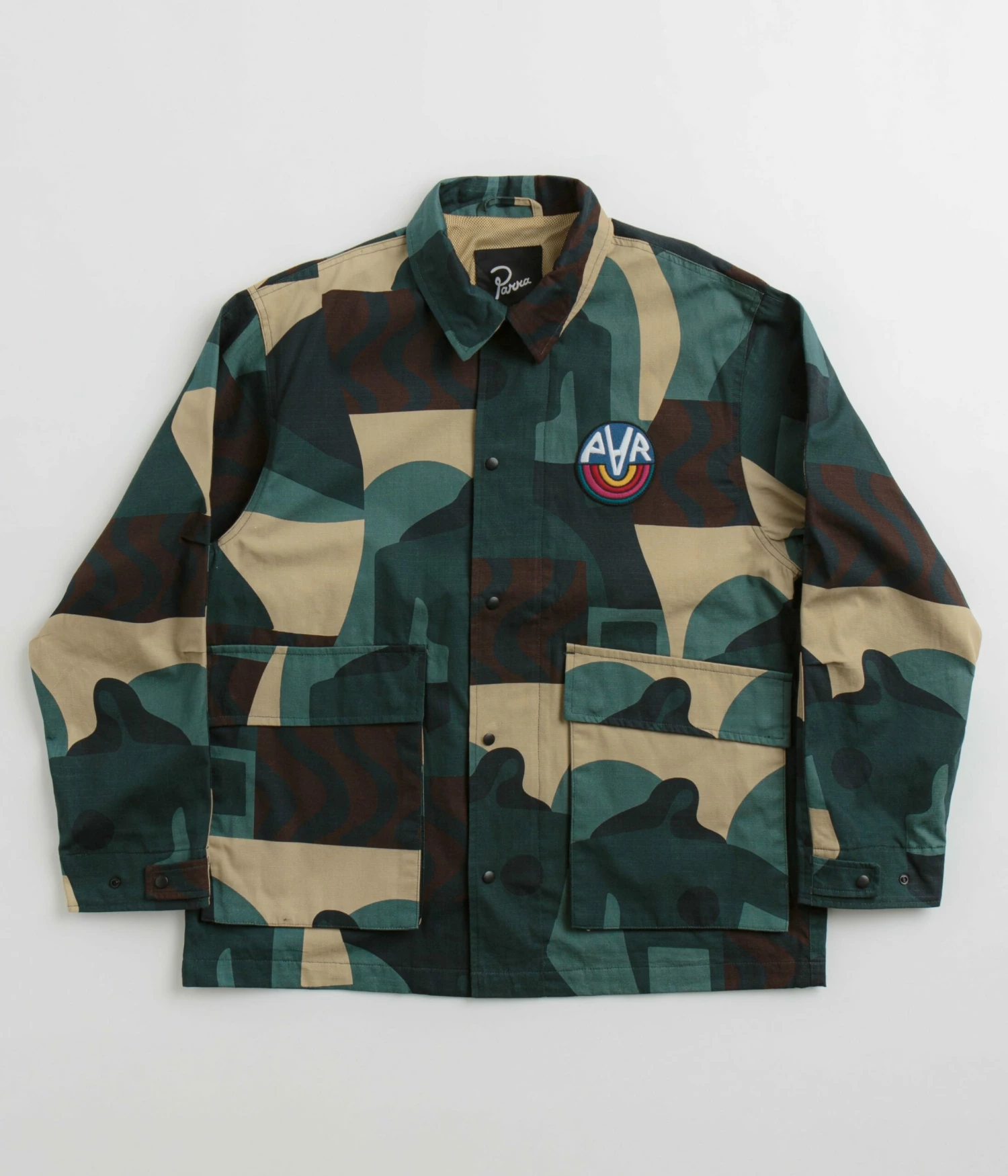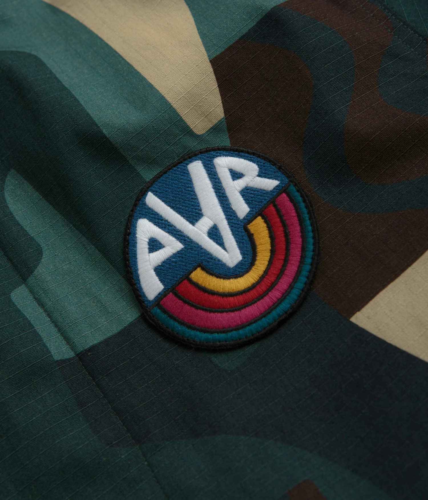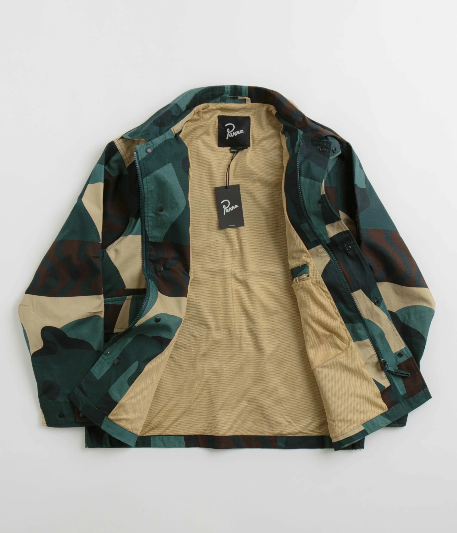 by Parra Distorted Camo Jacket in Green. Regular fitting with a mesh lined inner, this by Parra jacket is designed with an all-over camo print and a cotton ripstop shell. Featuring a classic stand collar, a full length zipper fastening and a snap secured placket, this green camo by Parra jacket is finished with adjustable cuffs, two front pockets, an inner security pocket and with embroidered patch graphics sewn across the sleeve and left chest.