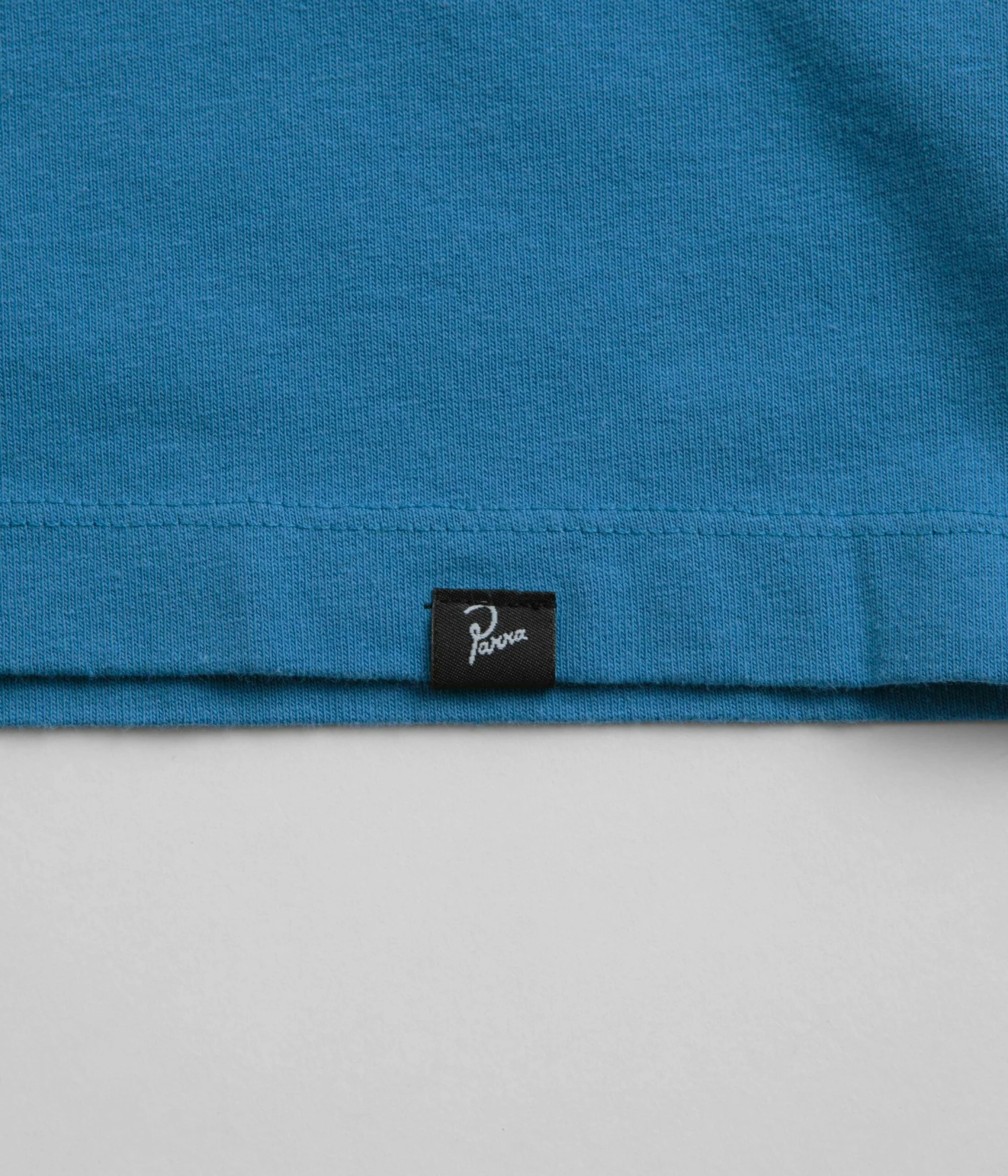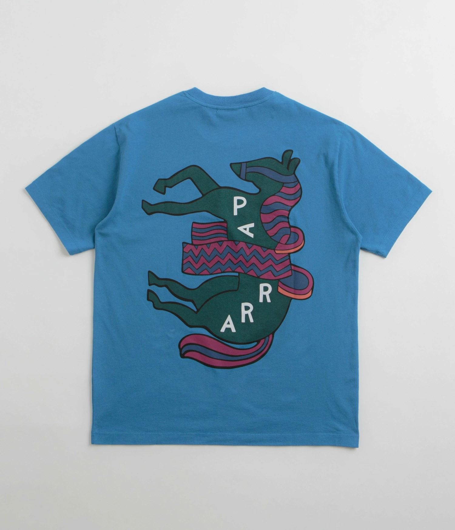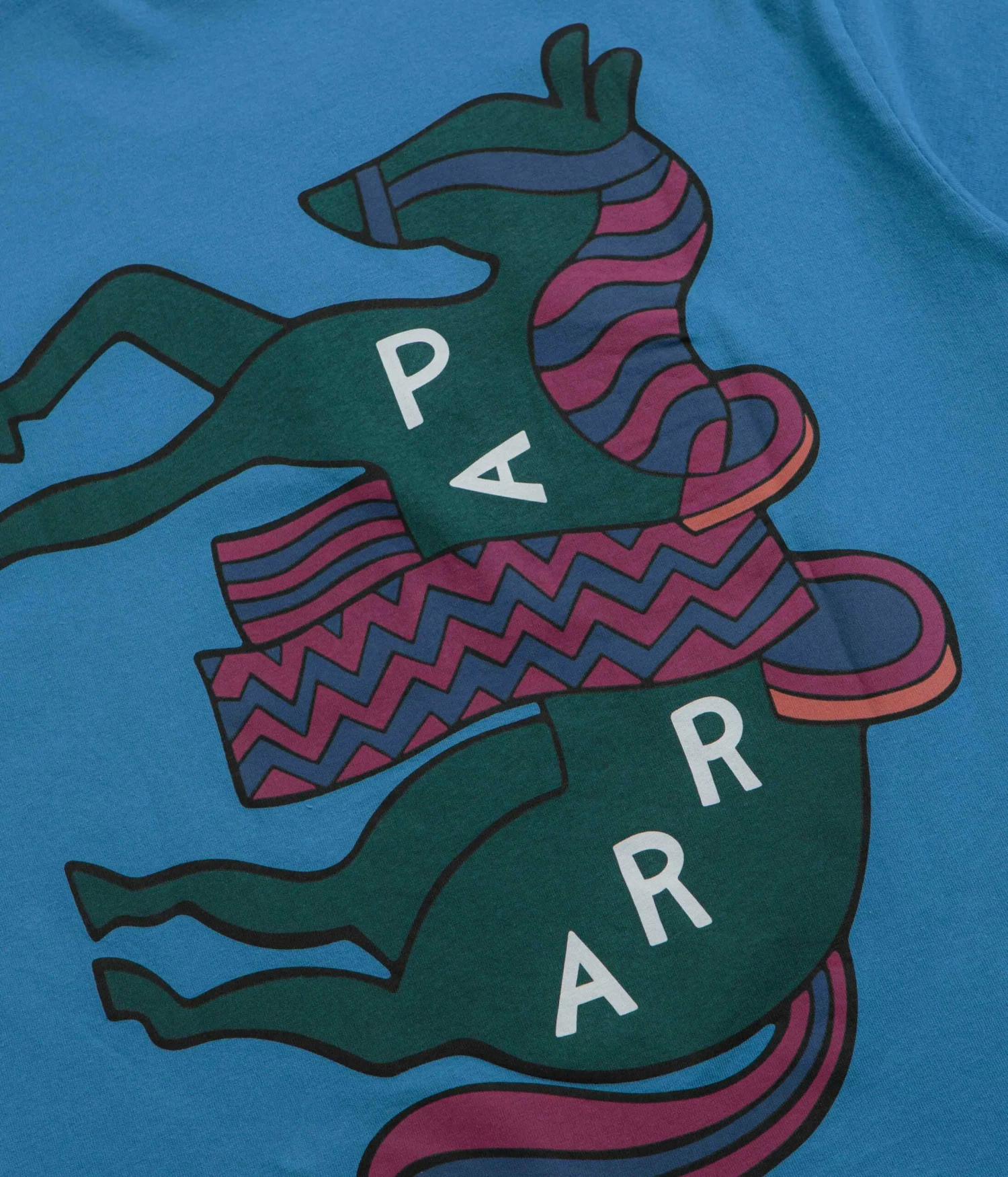 by Parra Fancy Horse T-Shirt in Azure Blue. Regular fitting and made from 100% coton, this colourblock by Parra t-shirt is designed with a flexible rib knit collar and a flag labelled hem. Finished in a shade of blue with printed front graphics and printed rear artwork.