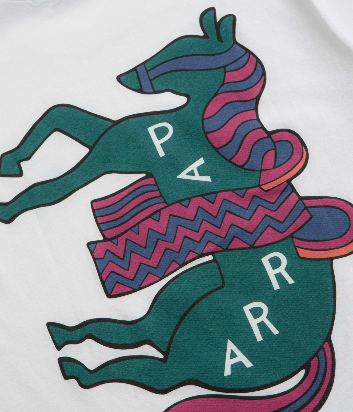 by Parra Fancy Horse T-Shirt in White. Made from 100% cotton, this regular fitting by Parra t-shirt is designed with a flexible rib knit collar and a flag labelled hem. Finished in a shade of white with printed front and rear graphics.