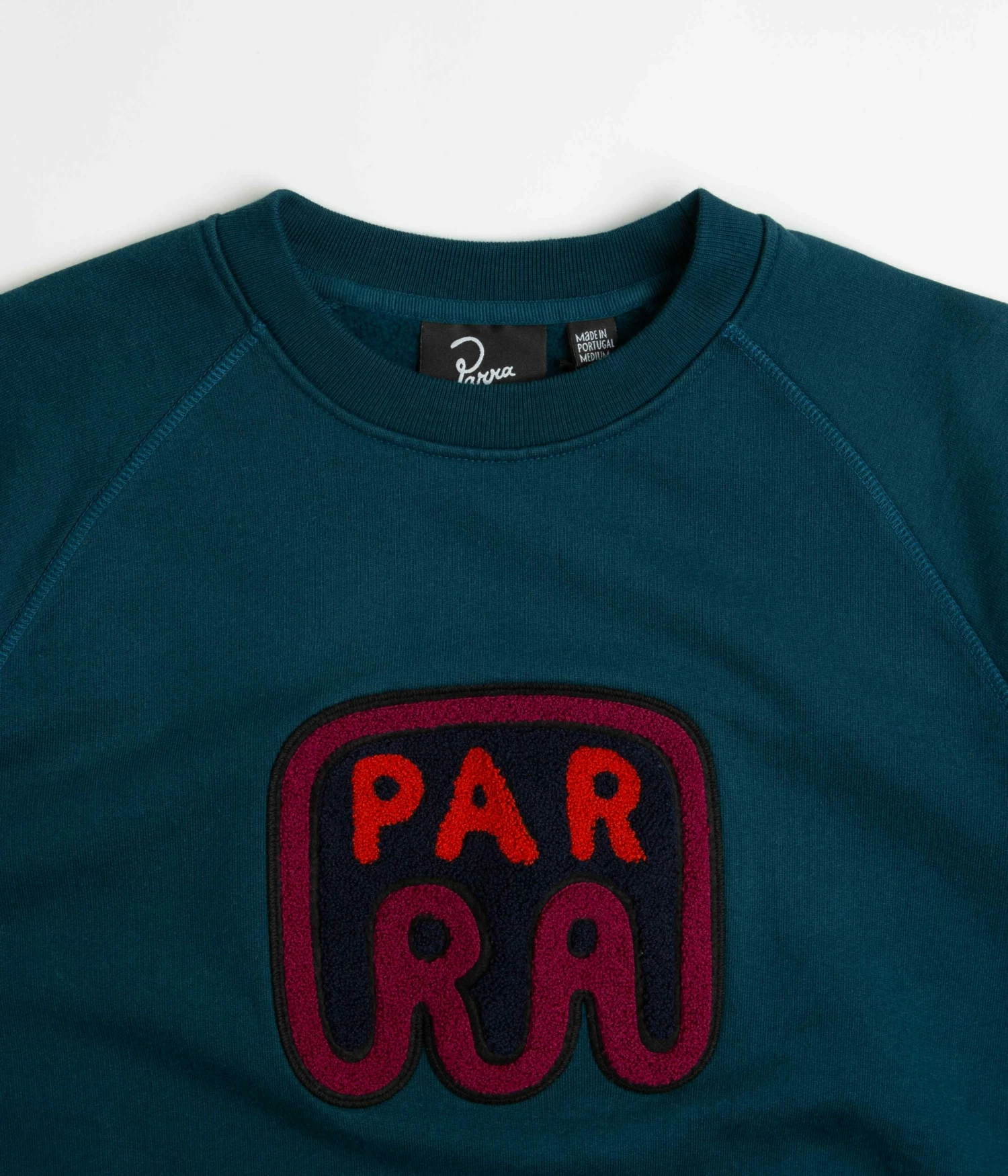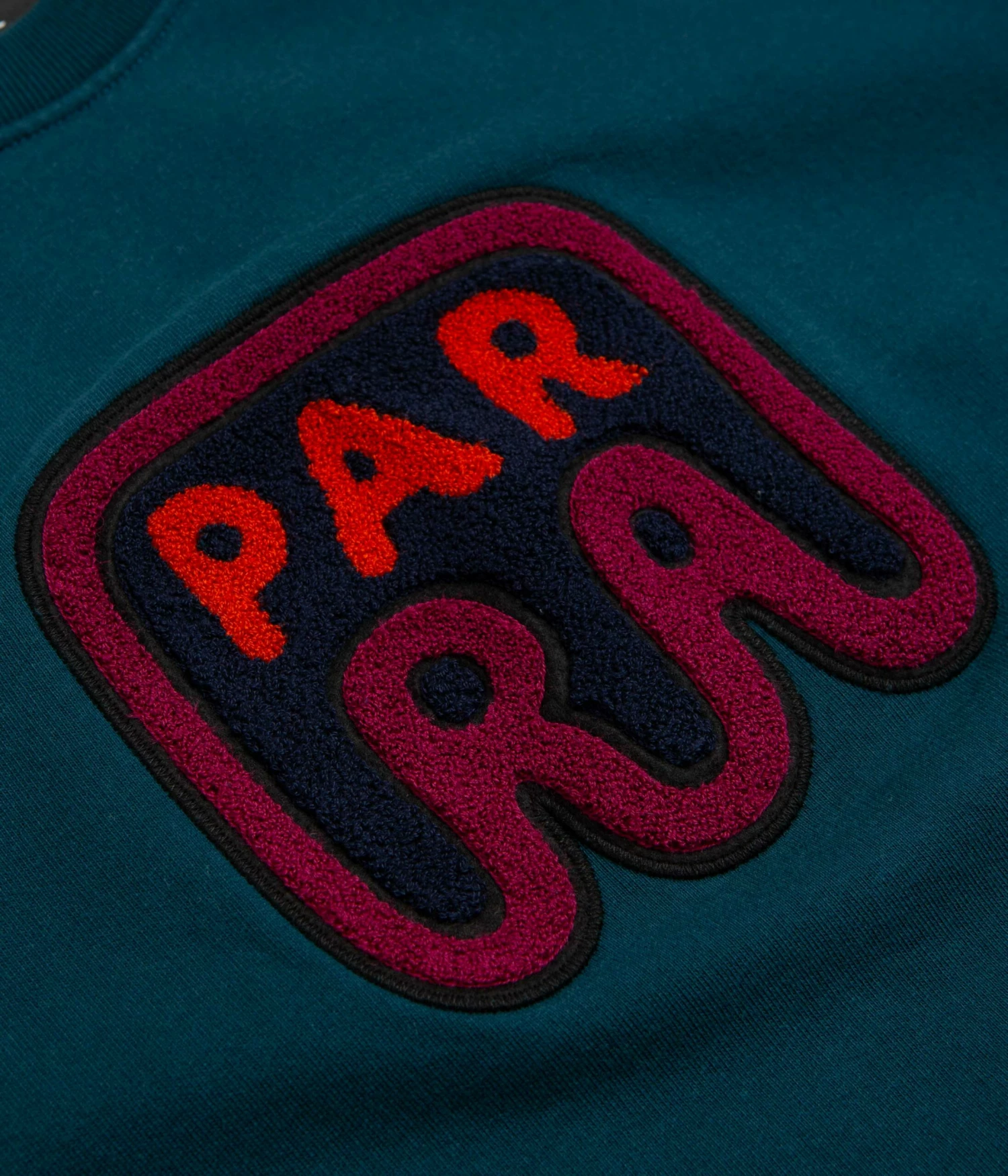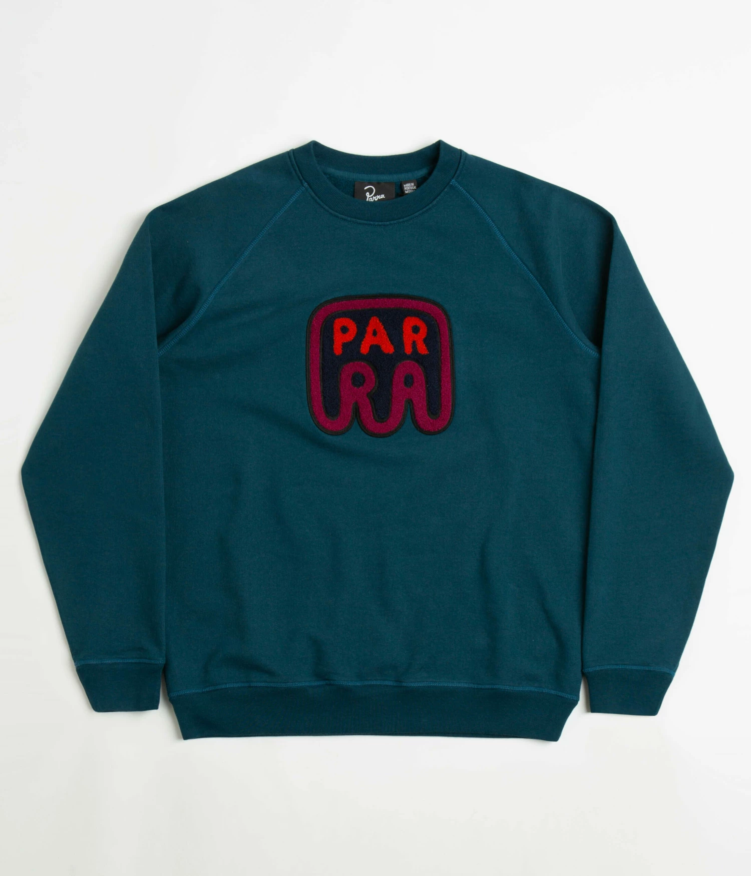 by Parra Fast Food Logo Crewneck Sweatshirt in Deep Sea Green. Tailored to a regular fitting with a brushed fleece lining, this new season by Parra sweatshirt is made from 100% cotton. Featuring raglan sleeves, rib knit cuffs and a woven elastic hem, this green by Parra sweater is finished with an embroidered applique Parra chest logo.
