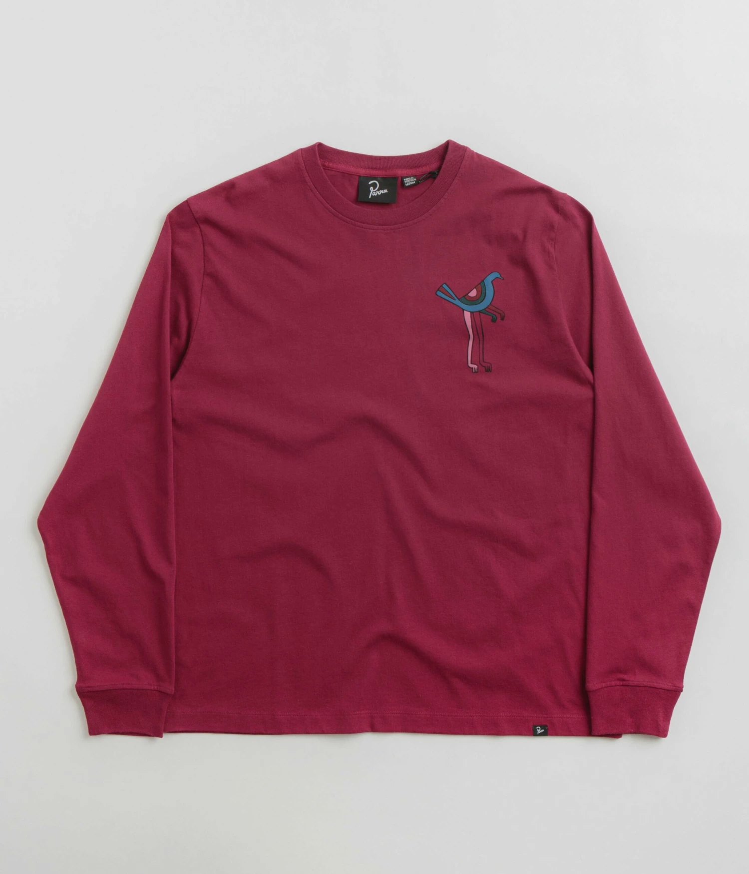 by Parra Wine And Books Long Sleeve T-Shirt in Beet Red. Made from 100% cotton, this new season by Parra t-shirt is designed with ribbed cuffs and a classic crew collar. Finished with a flag labelled hem, this red by Parra t-shirt is finished with printed front and rear graphics.