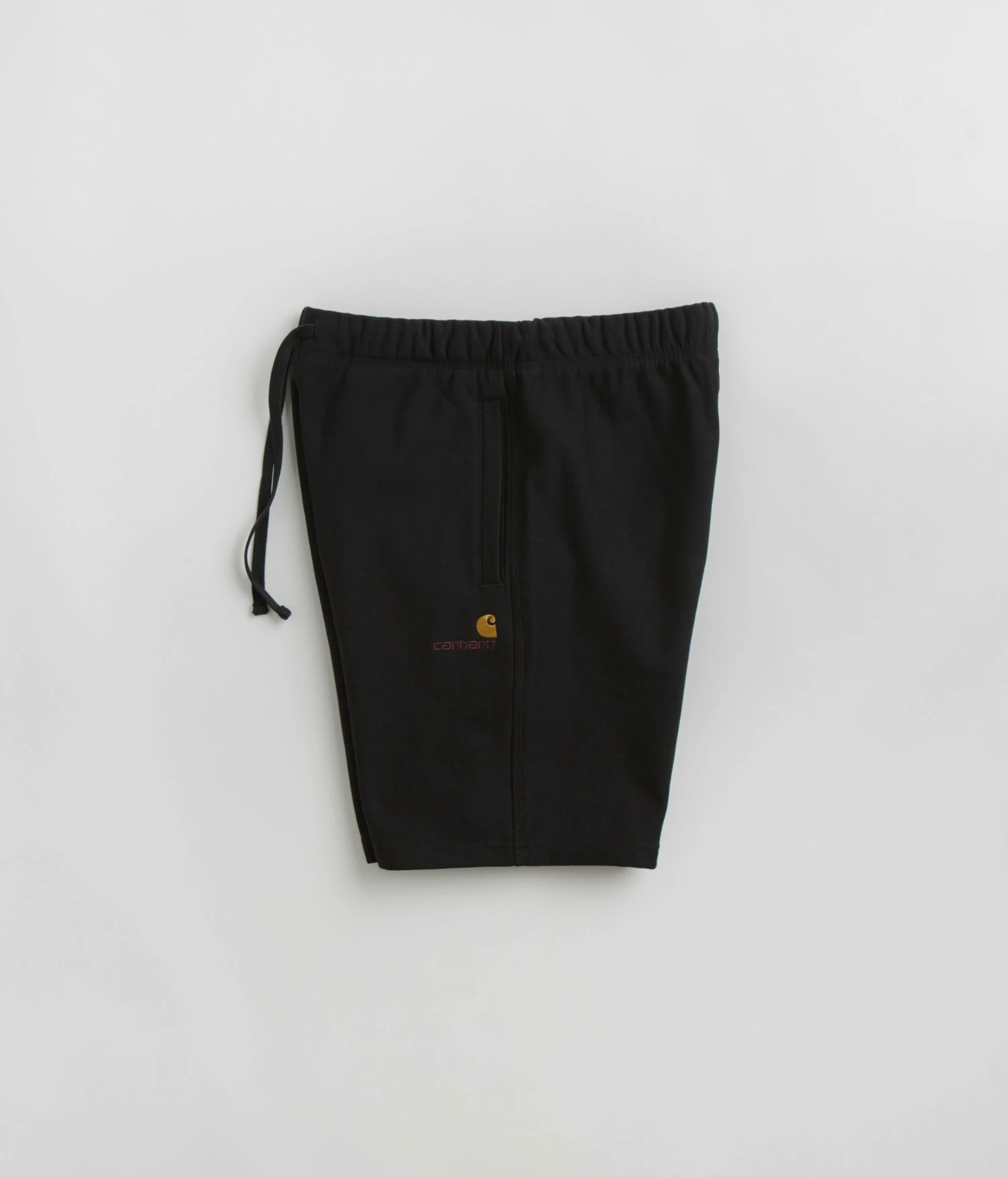 Carhartt American Script Sweat Shorts in Black. Loose fitting and made from a heavyweight cotton-polyester blend, these Carhartt shorts are designed with a brushed lining and an elasticated drawstring waistband. Featuring two side pockets and a single rear pocket, these black Carhartt shorts are finished with embroidered logo branding.