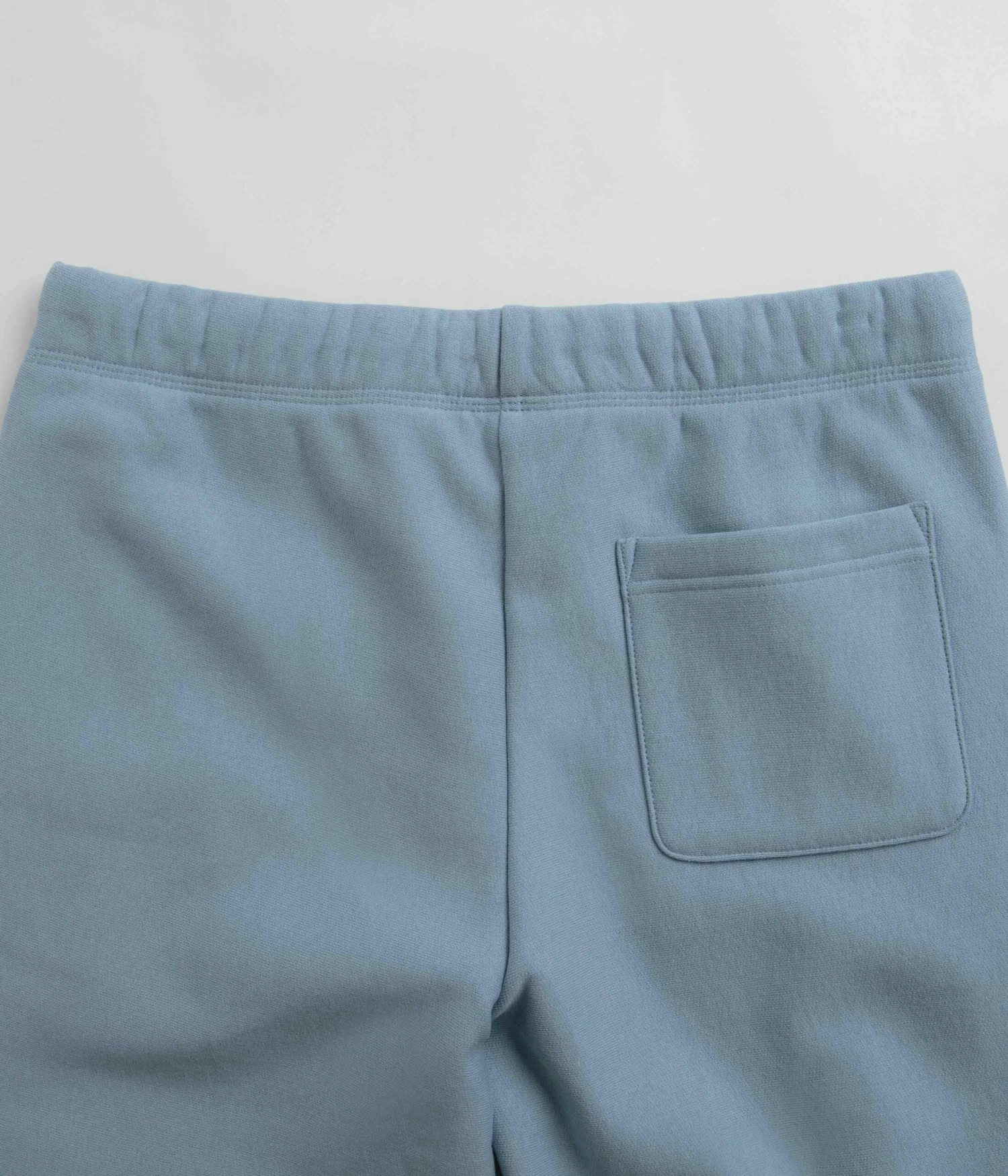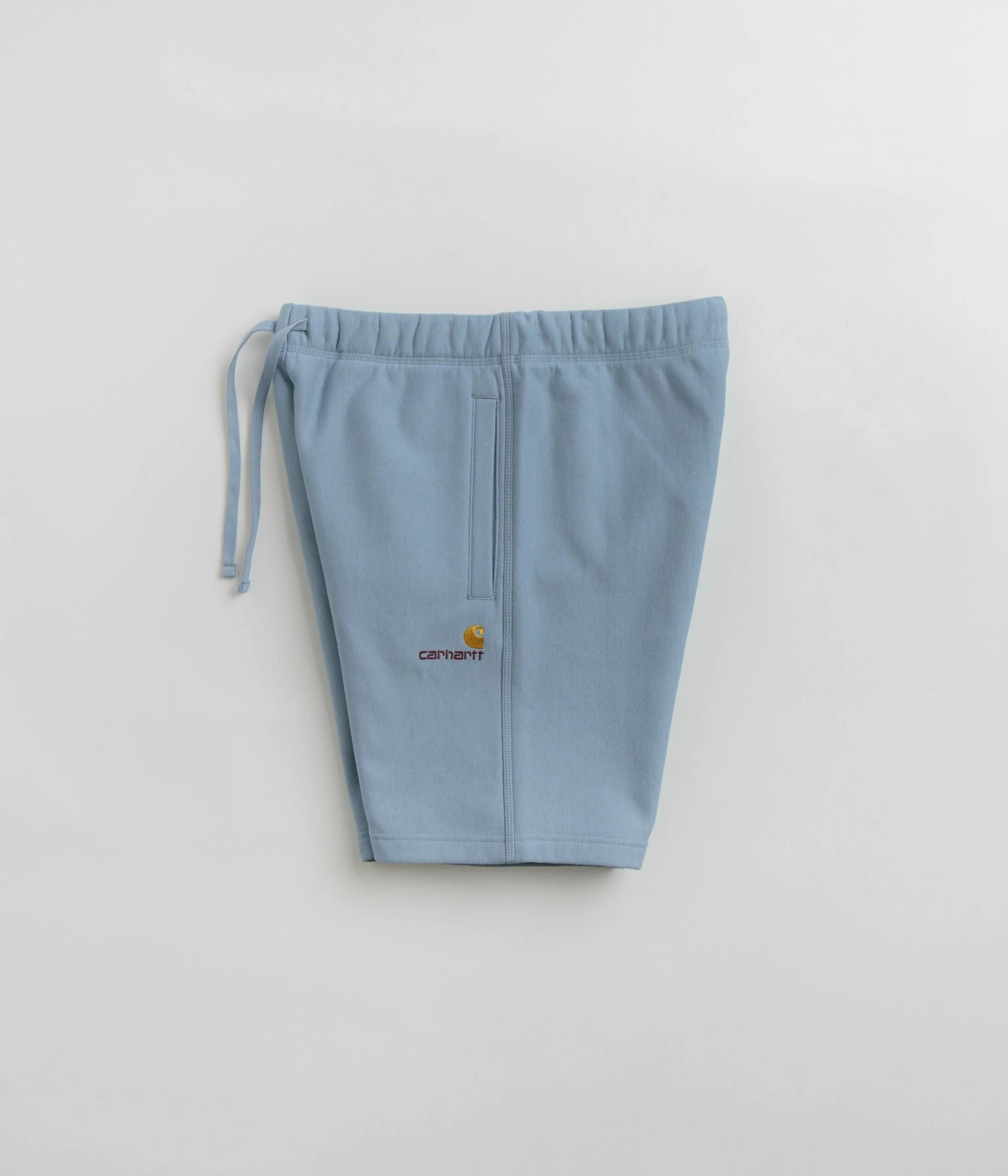 Carhartt American Script Sweat Shorts in Frosted Blue. Made from a heavyweight cotton-polyester blend, these above-knee Carhartt shorts are designed with a brushed lining and a woven elastic drawstring waist. Finished in a shade of blue with two side pockets, a single rear pocket and with embroidered logo branding.