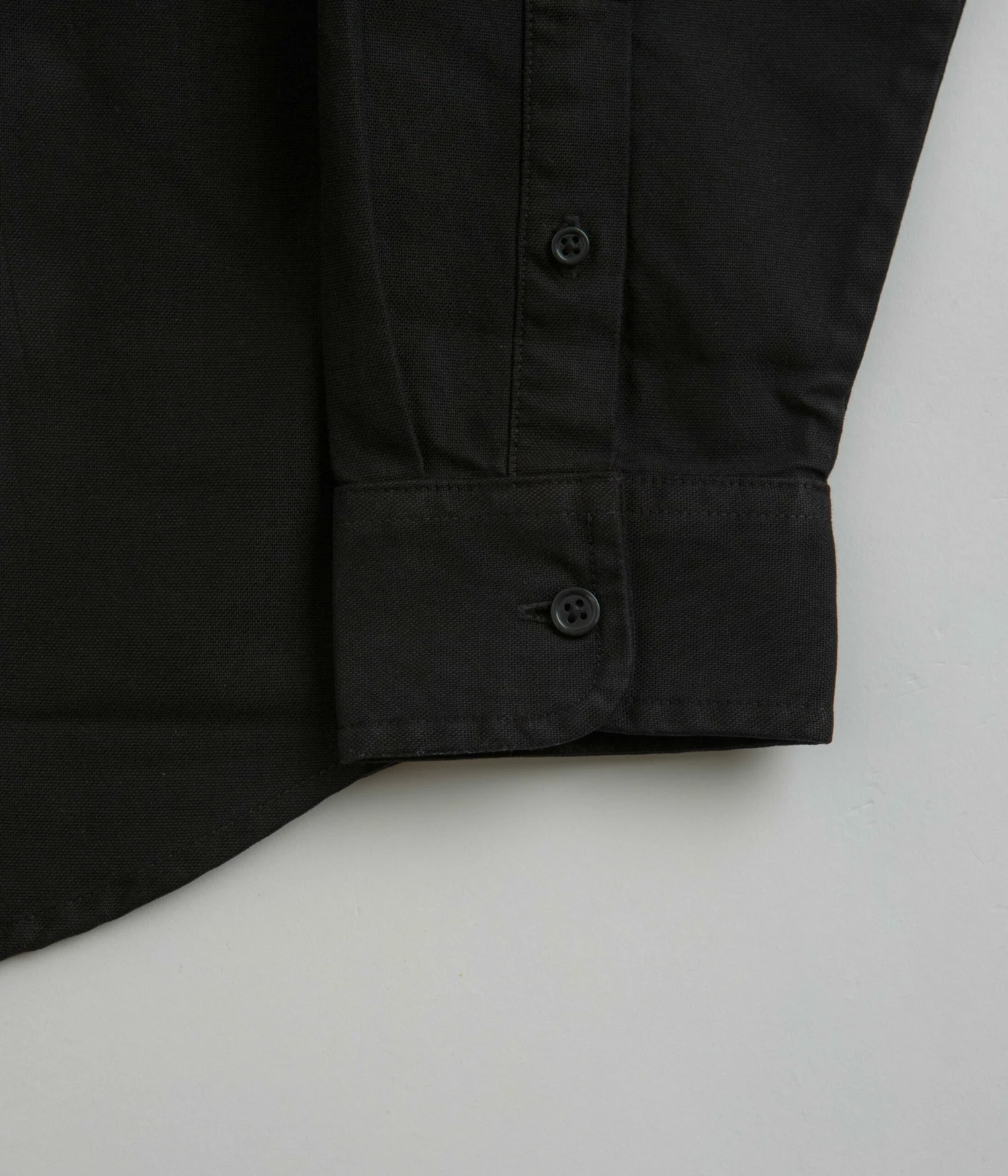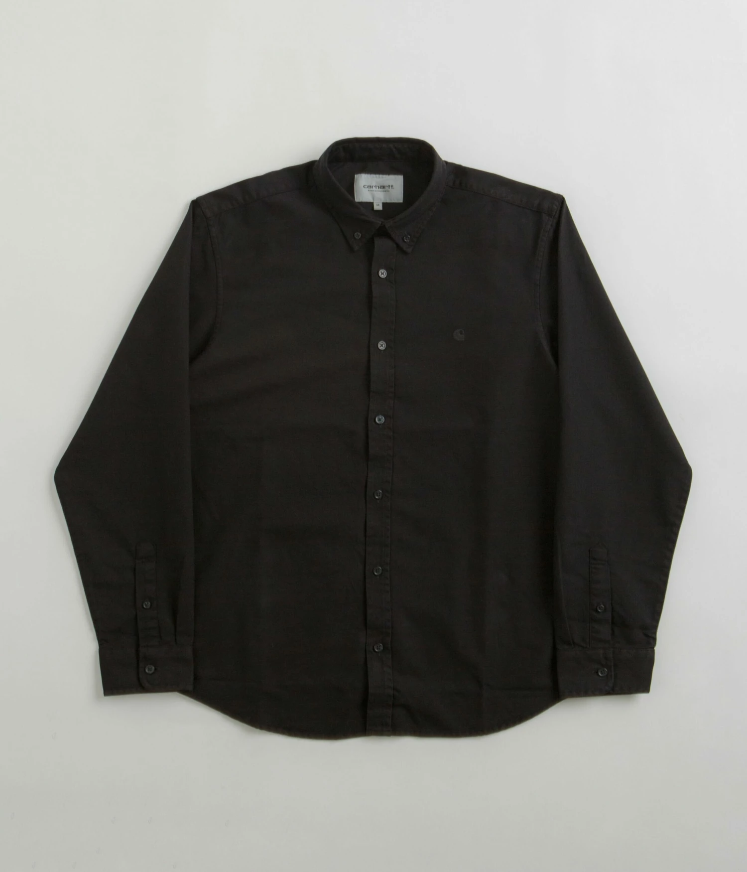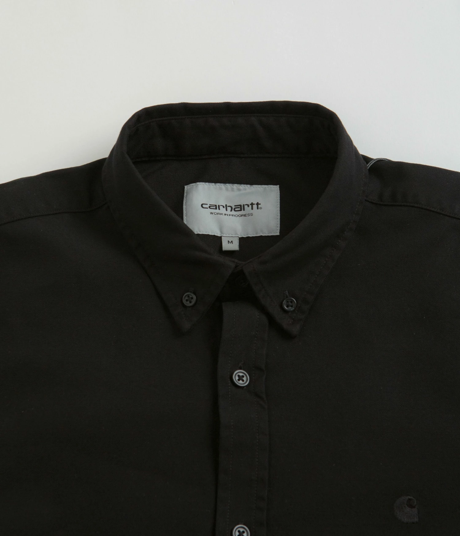 Carhartt Bolton Shirt in Black. Made from 100% cotton Oxford and tailored to a regular fitting, this garment dyed Carhartt shirt arrives as part of the brand’s latest release. Featuring a button-down collar, a full length button fastening, buttoned cuffs and a curved hem, this black Carhartt shirt is finished with a tonal C logo sewn across the left chest.