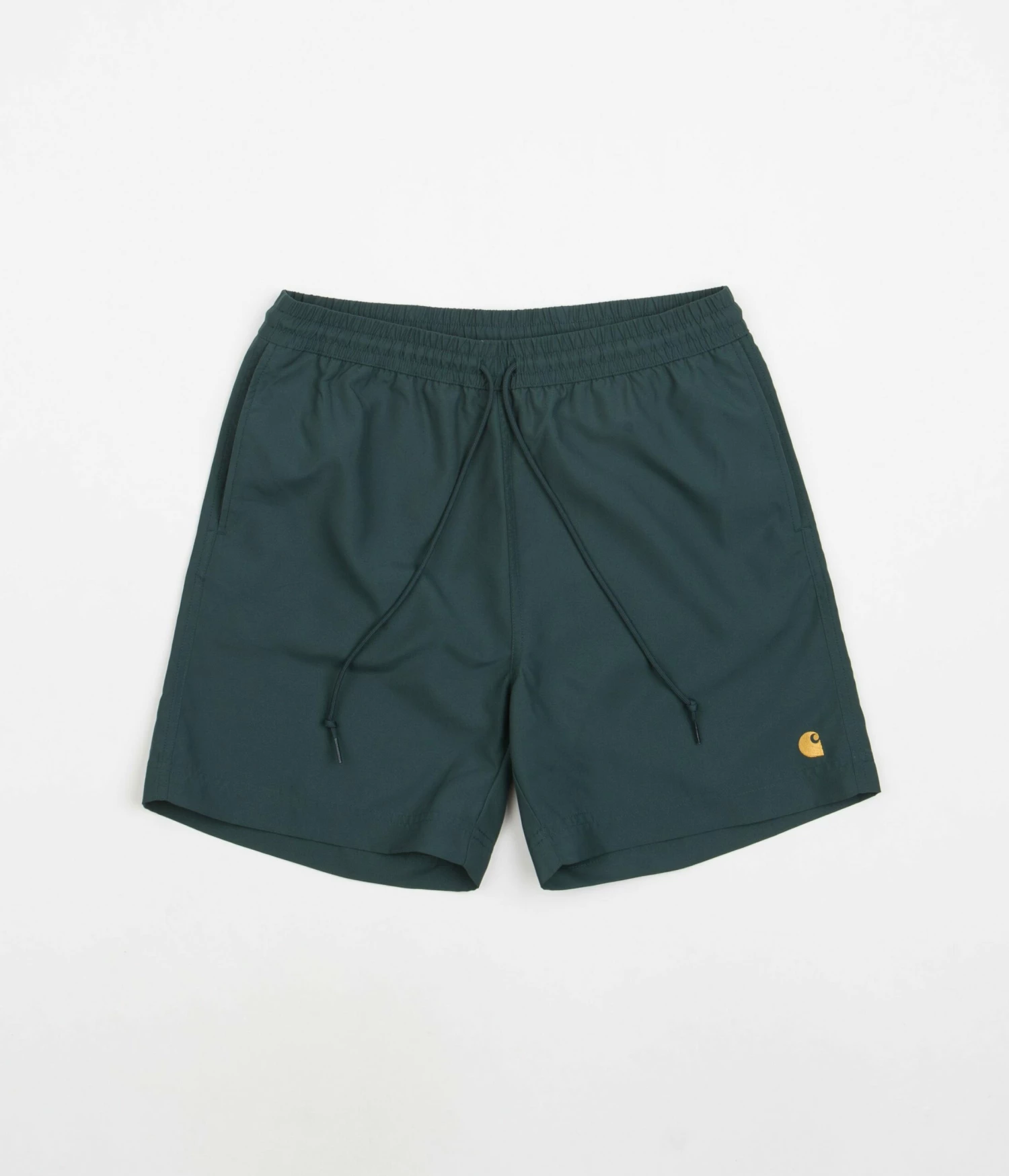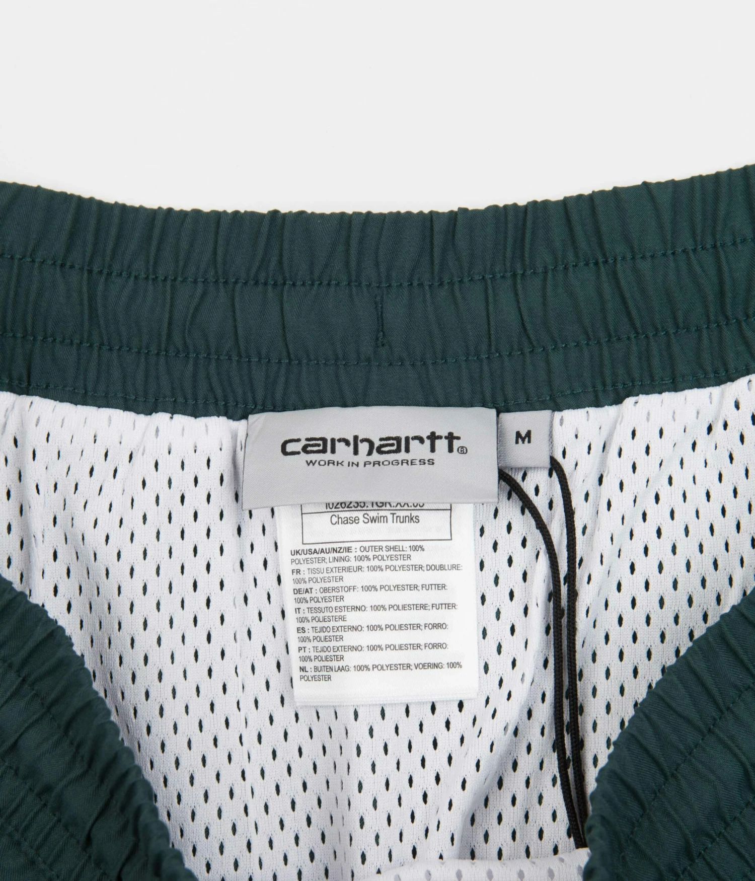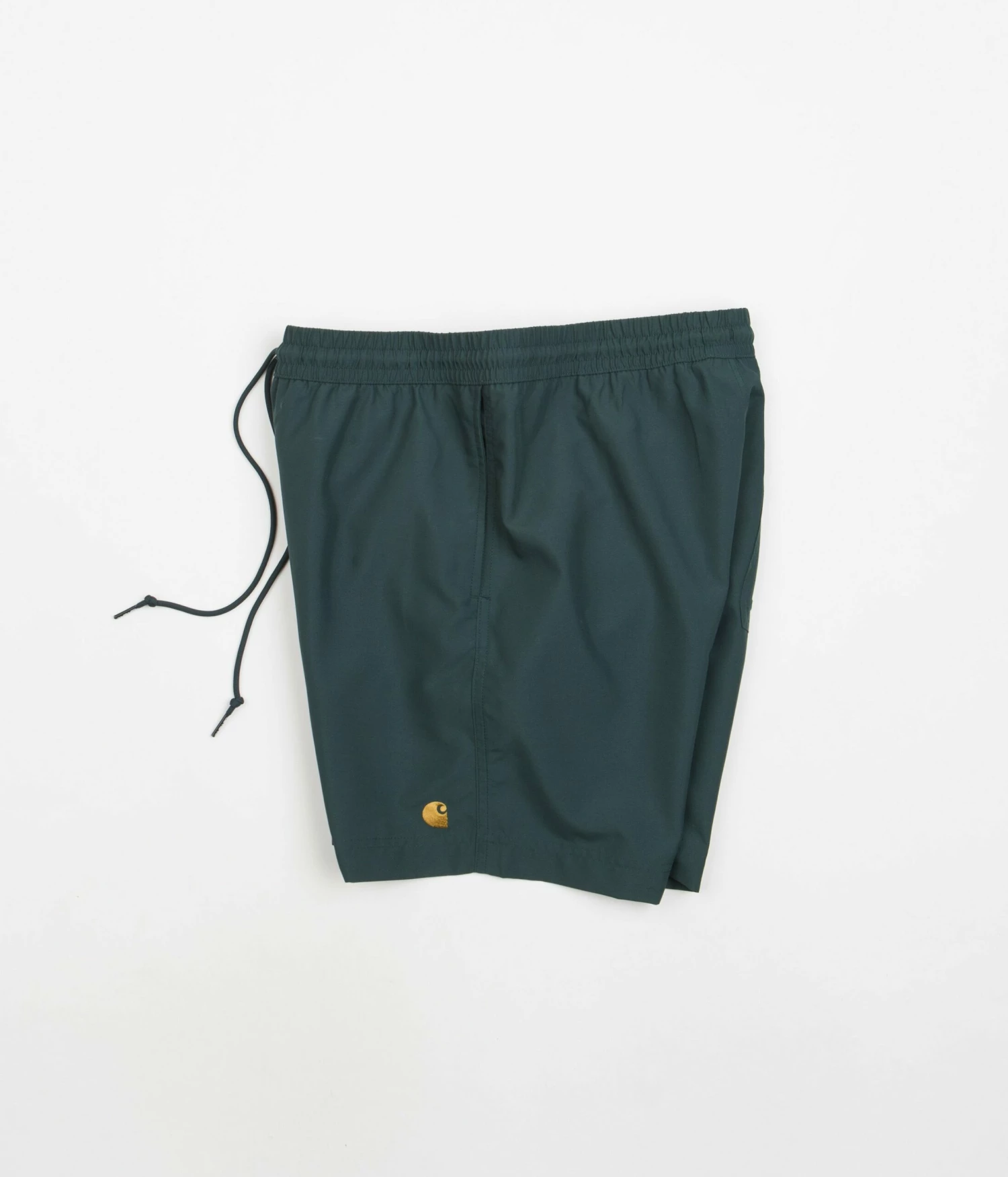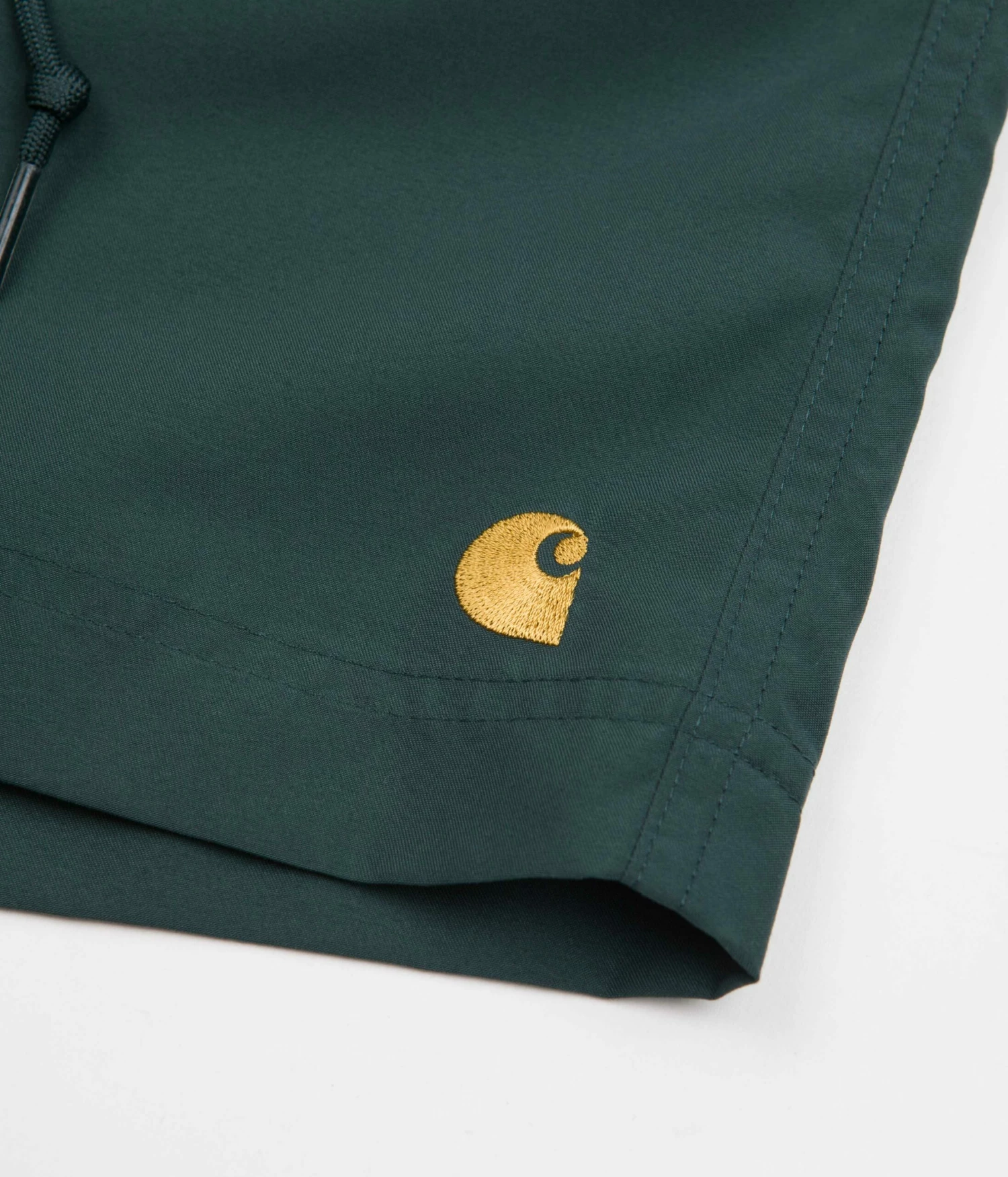 Carhartt Chase Swim Trunks in Botanic and Gold. Quick drying and water-repellent, these regular fitting Carhartt swim trunks are made from 100% polyester with an inner trunk lining. Featuring an elasticated drawstring waist, two side pockets and a single rear pocket with an integrated key loop, these botanical green swim shorts are finished with a golden ‘C’ logo sewn above the left cuff.