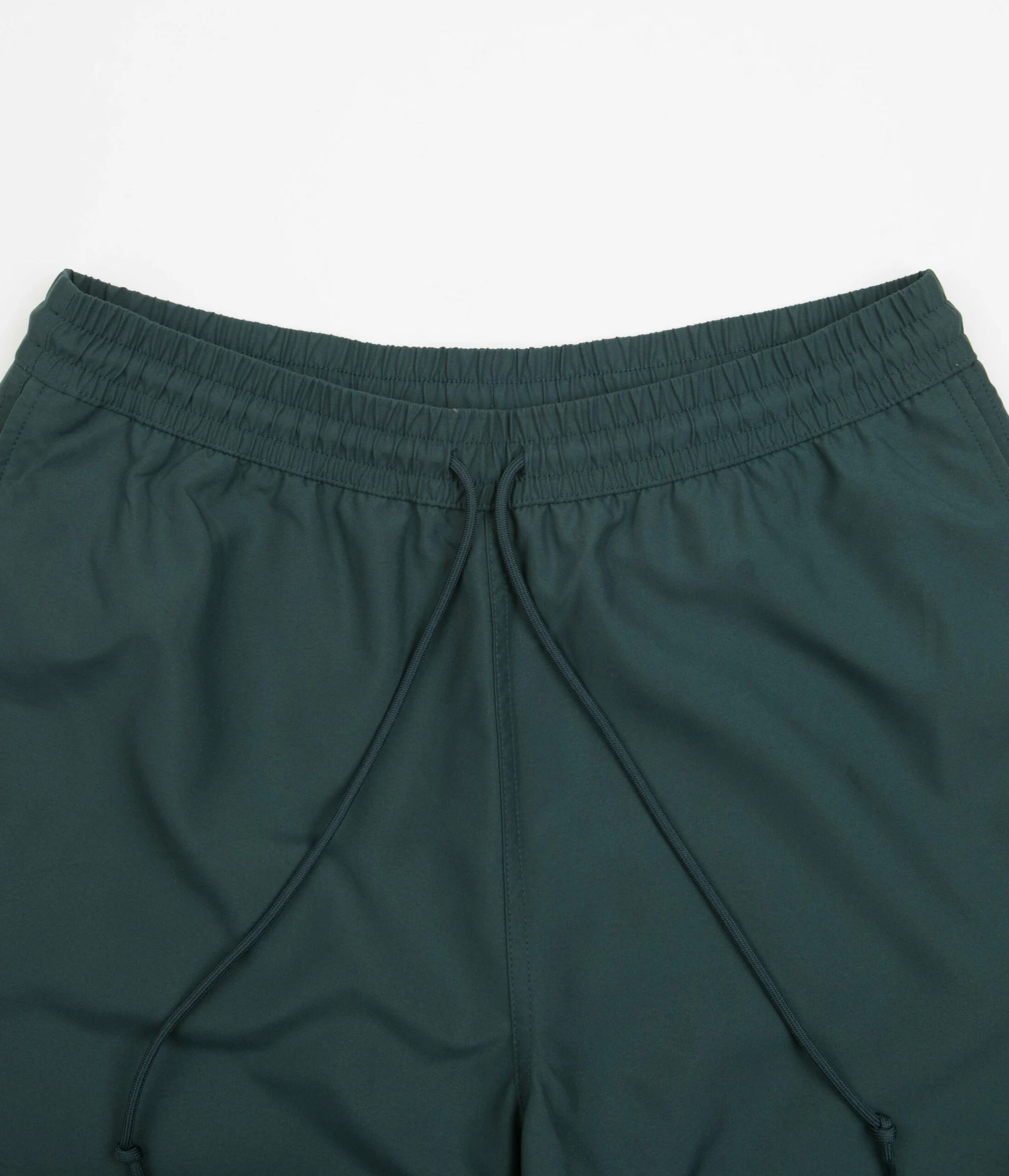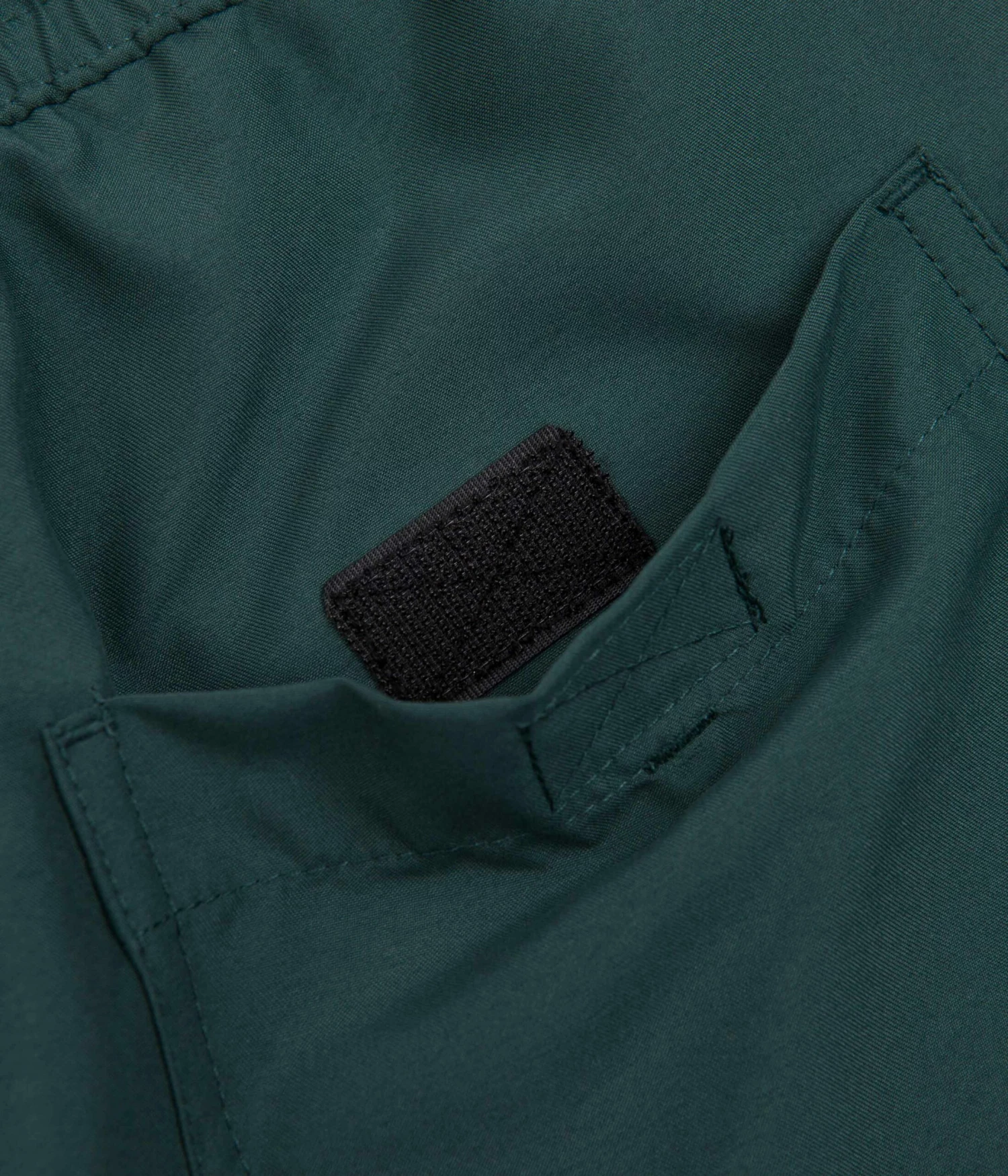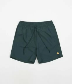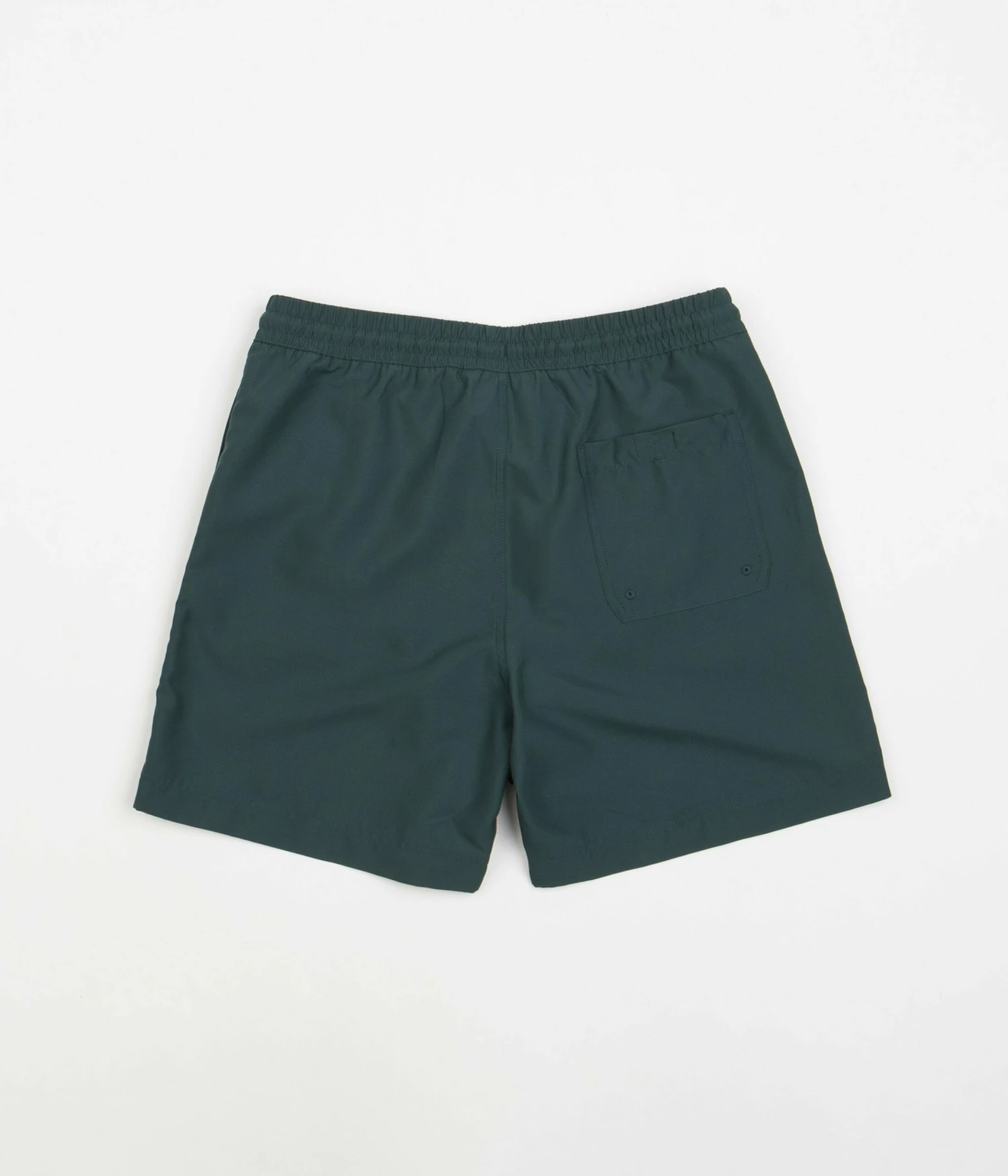 Carhartt Chase Swim Trunks in Botanic and Gold. Quick drying and water-repellent, these regular fitting Carhartt swim trunks are made from 100% polyester with an inner trunk lining. Featuring an elasticated drawstring waist, two side pockets and a single rear pocket with an integrated key loop, these botanical green swim shorts are finished with a golden ‘C’ logo sewn above the left cuff.