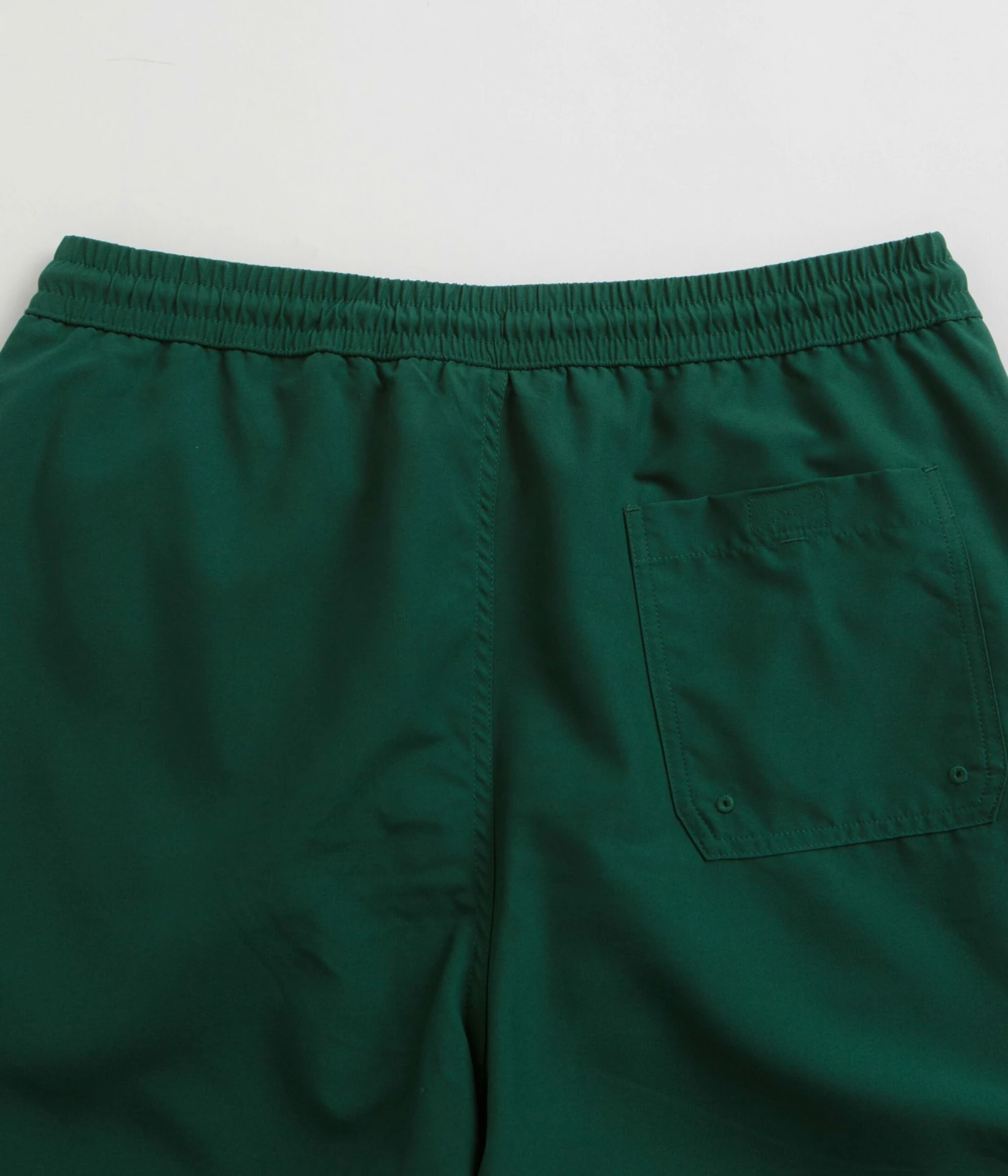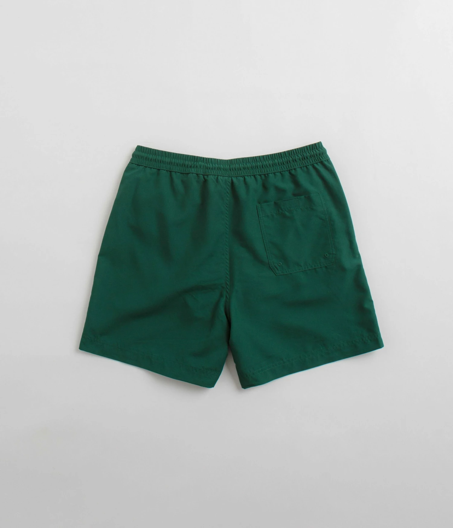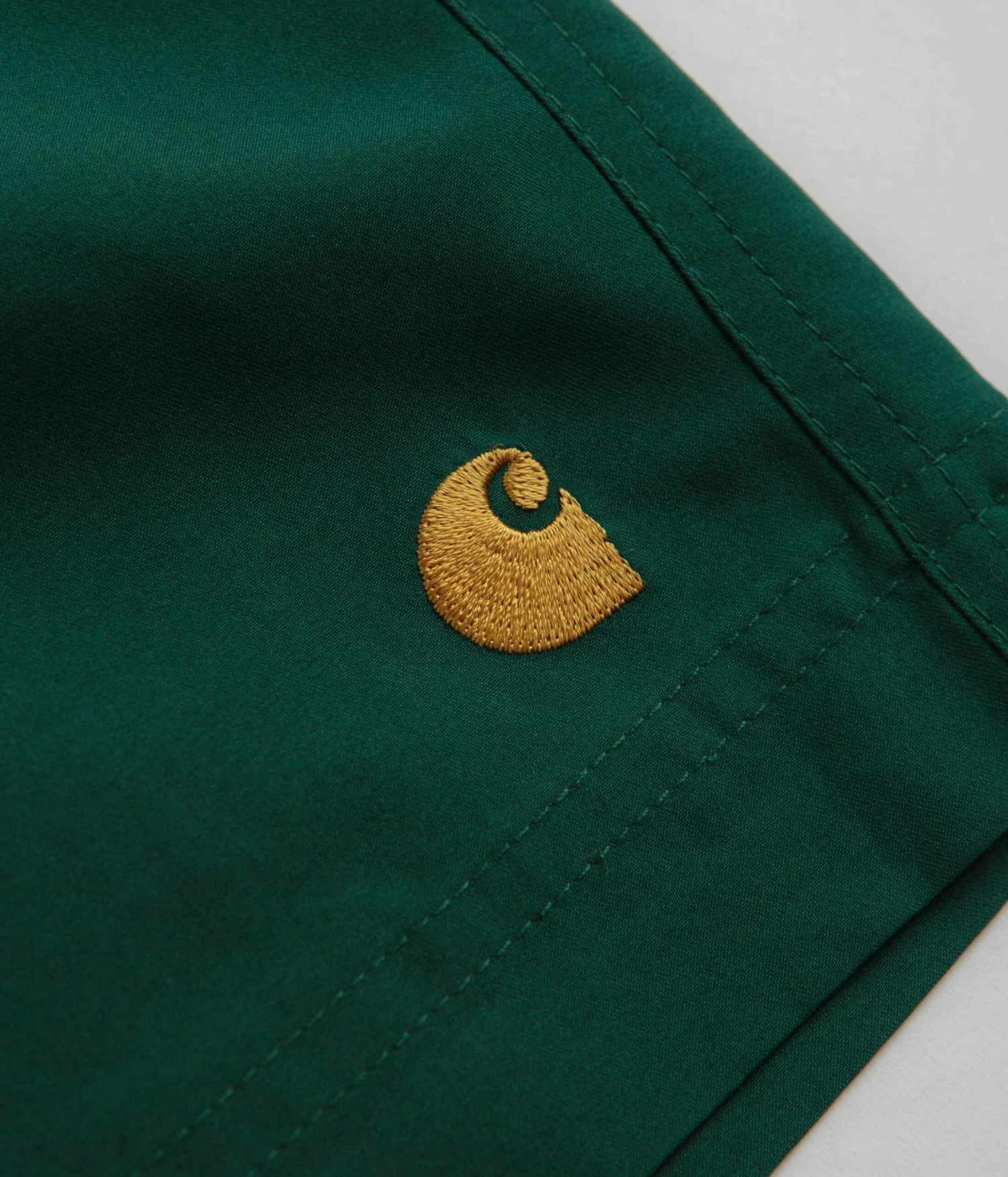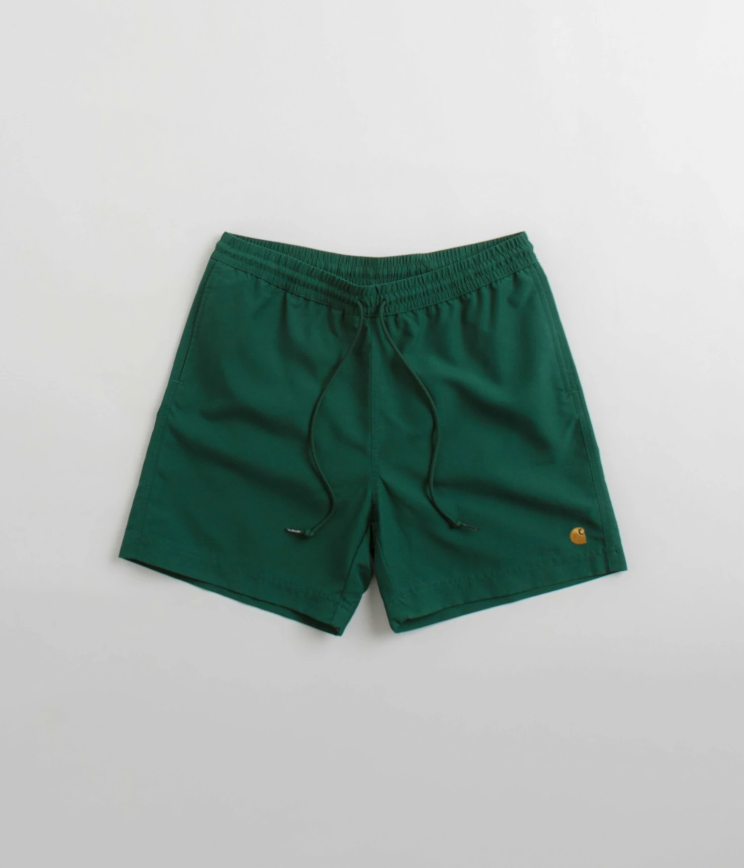 Carhartt Chase Swim Trunks in Chervil and Gold. Made from 100% polyester, these water-repellent Carhartt trunks are designed with an inner trunk and an elasticated drawstring waistband. Finished in a shade of green with two side pockets, a single rear pocket and with embroidered logo branding.