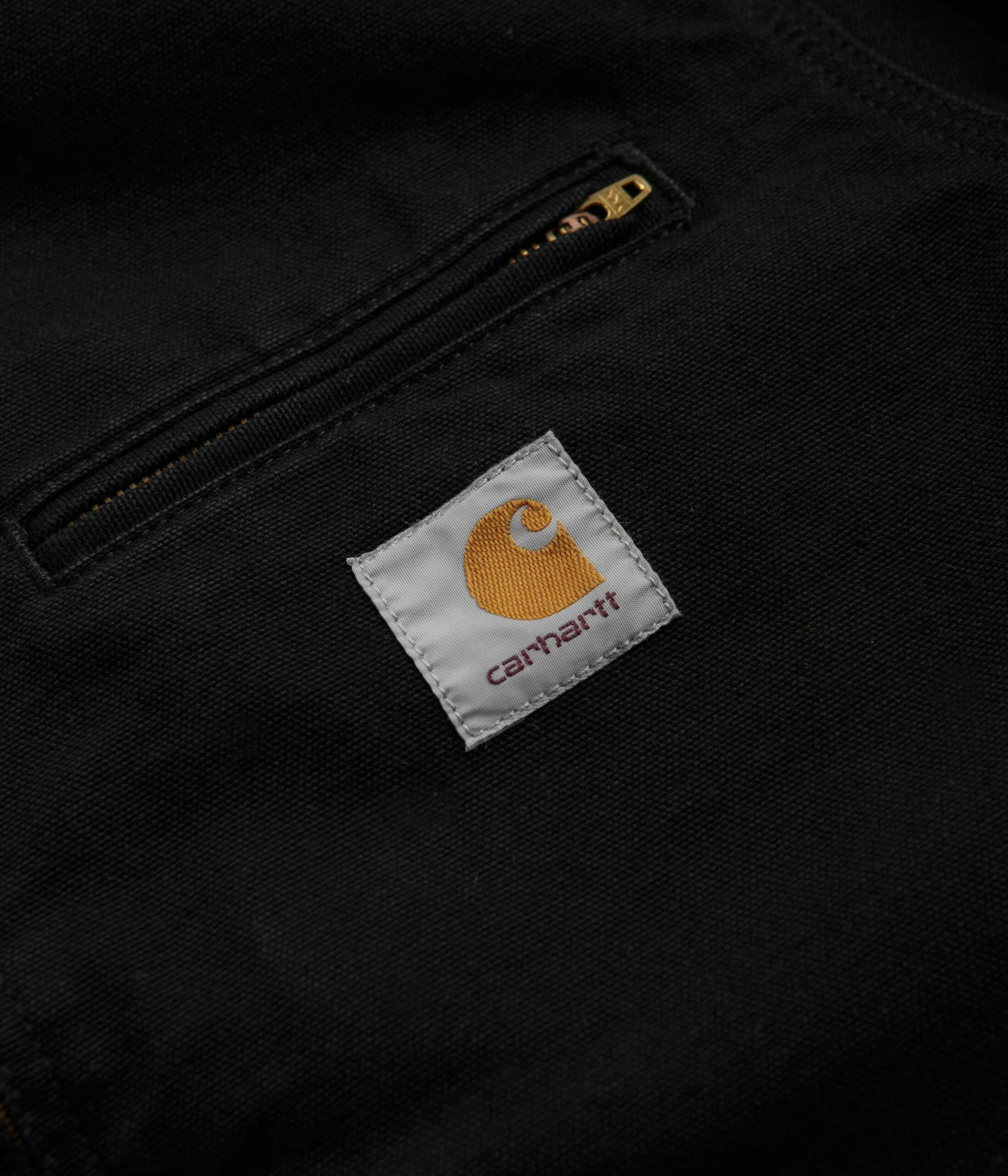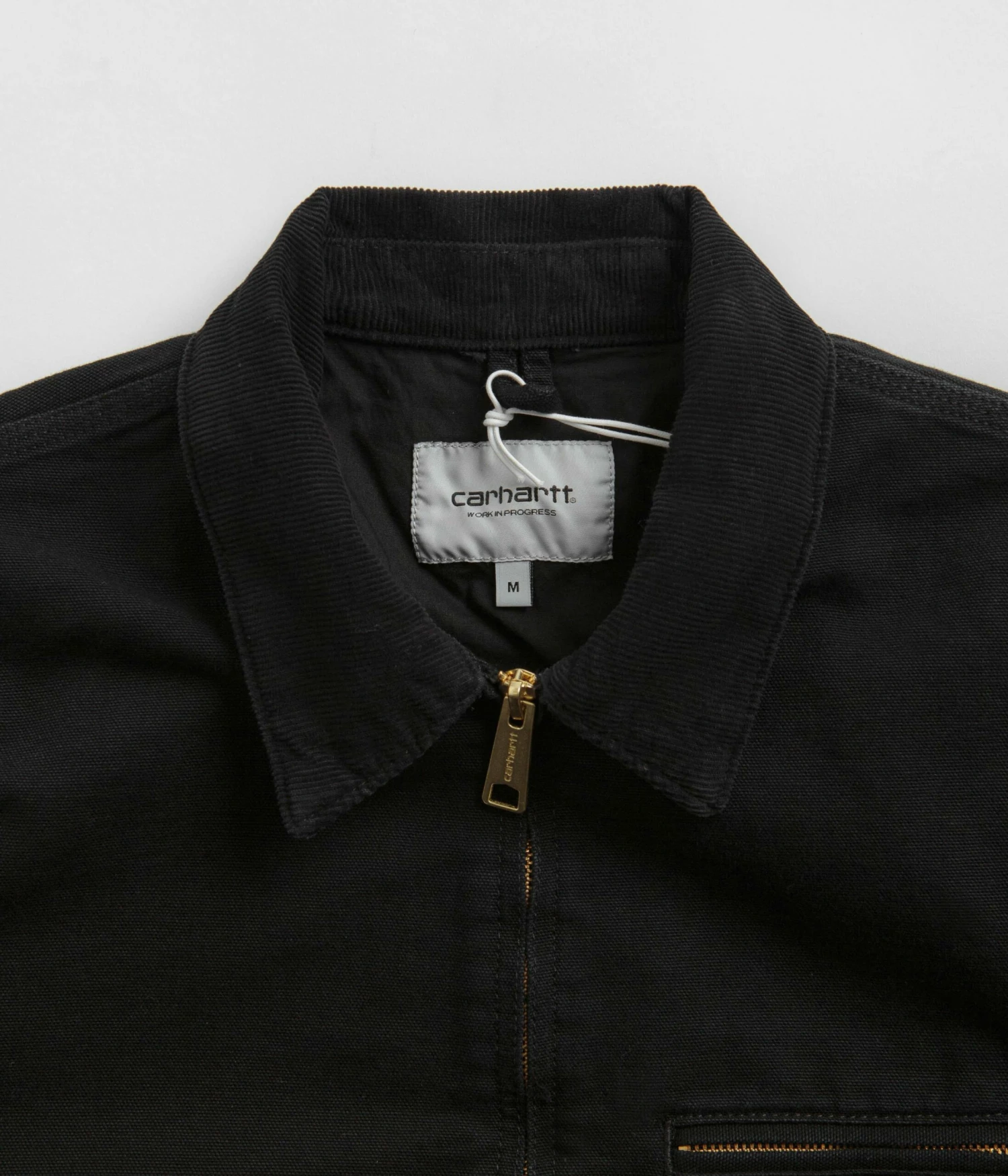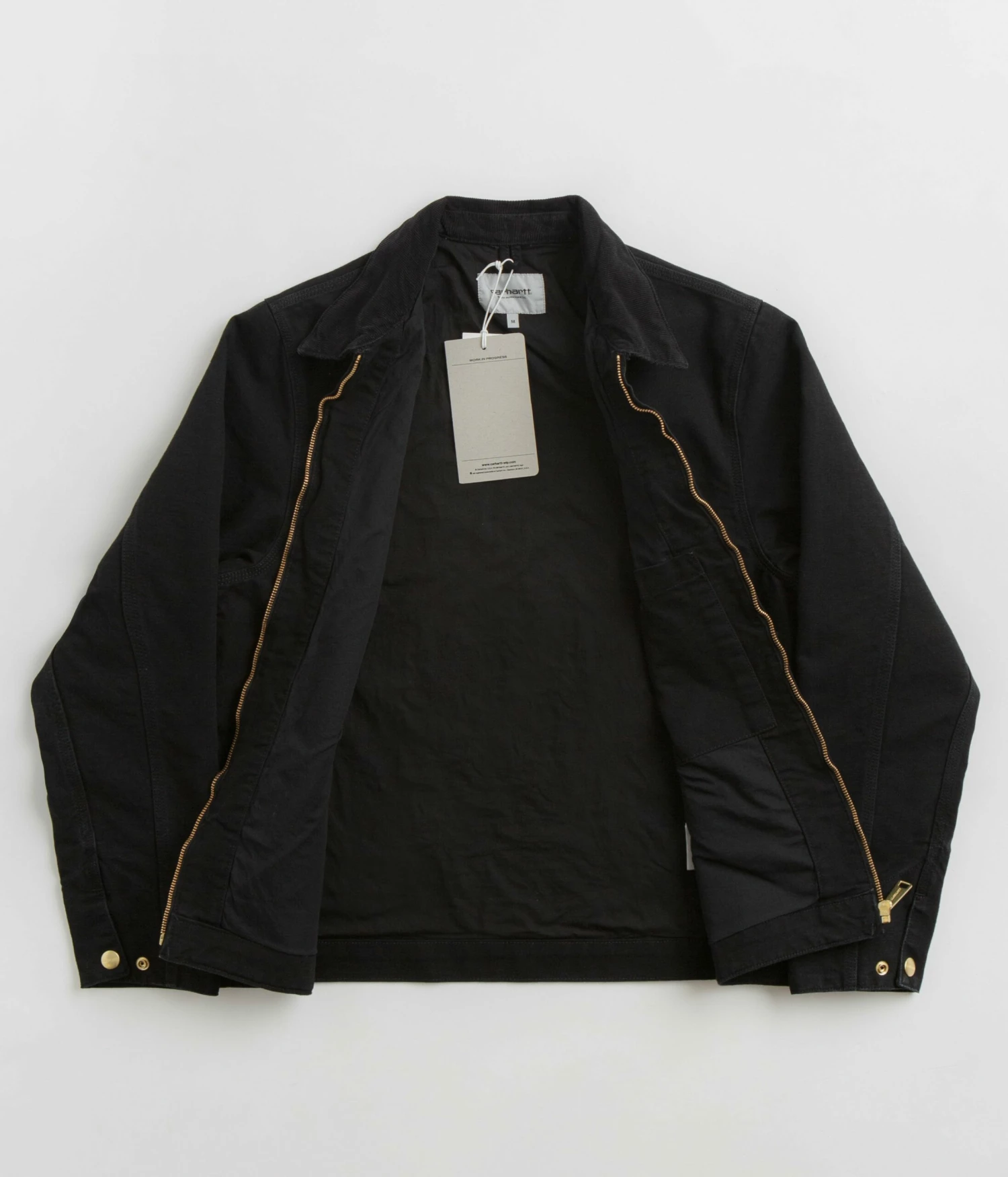 Carhartt Detroit Jacket in Black and Aged Canvas. Utility inspired and designed with a corduroy collar, this boxy fitting Carhartt jacket is made from 100% organic cotton ‘Dearborn’ canvas. Featuring a full length zipper fastening, nylon lined sleeves and a poplin lined body, this black Carhartt jacket is finished with two waist pockets, a zippered chest pocket and with woven flag label branding.