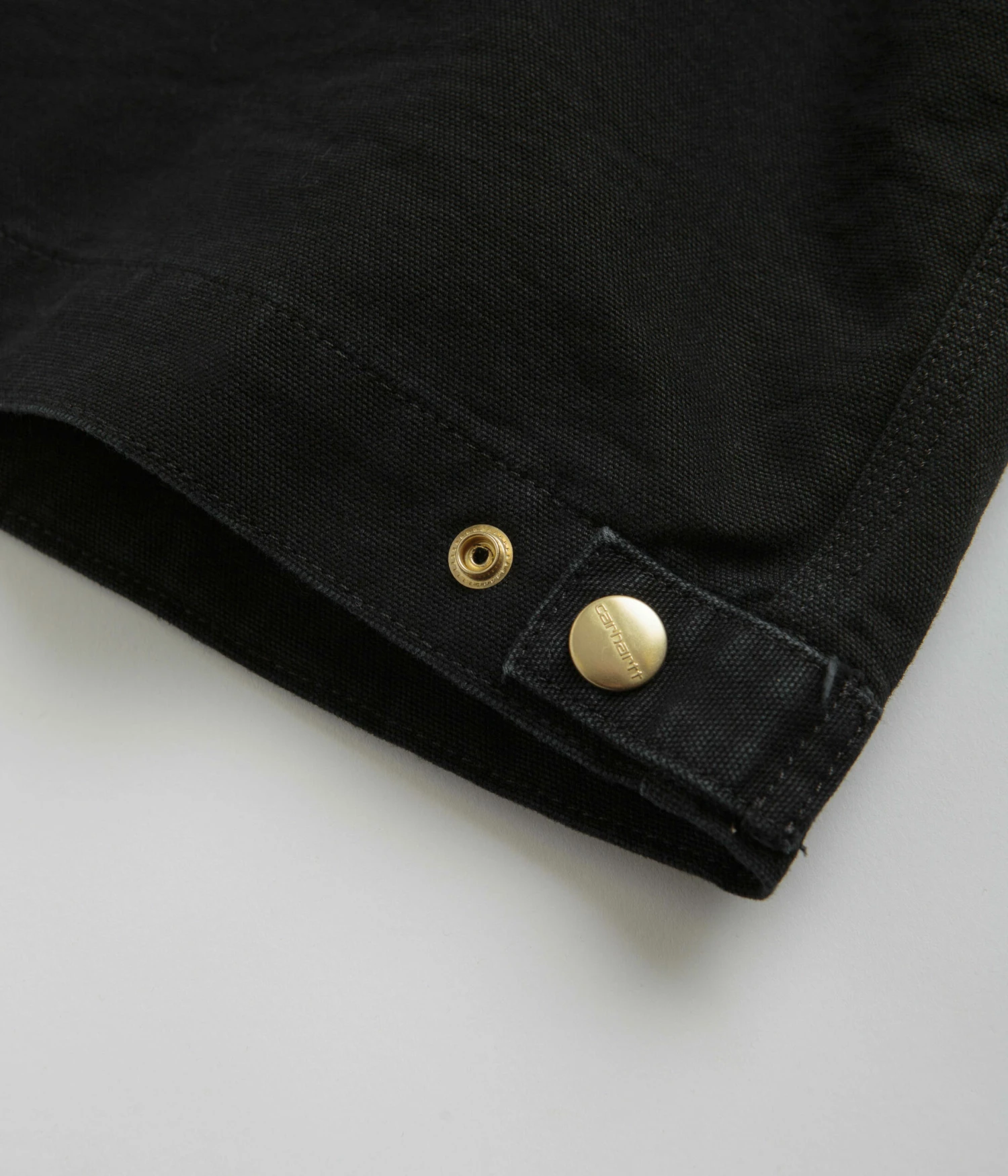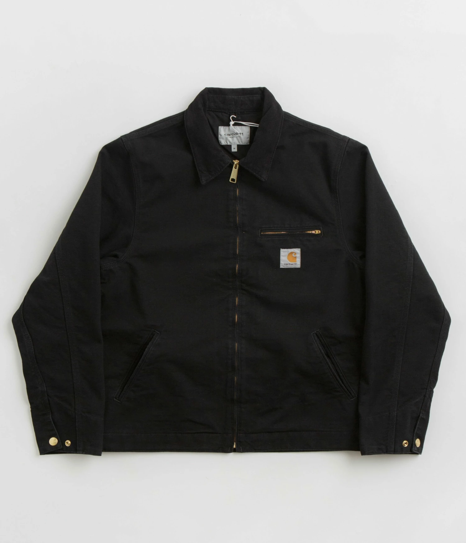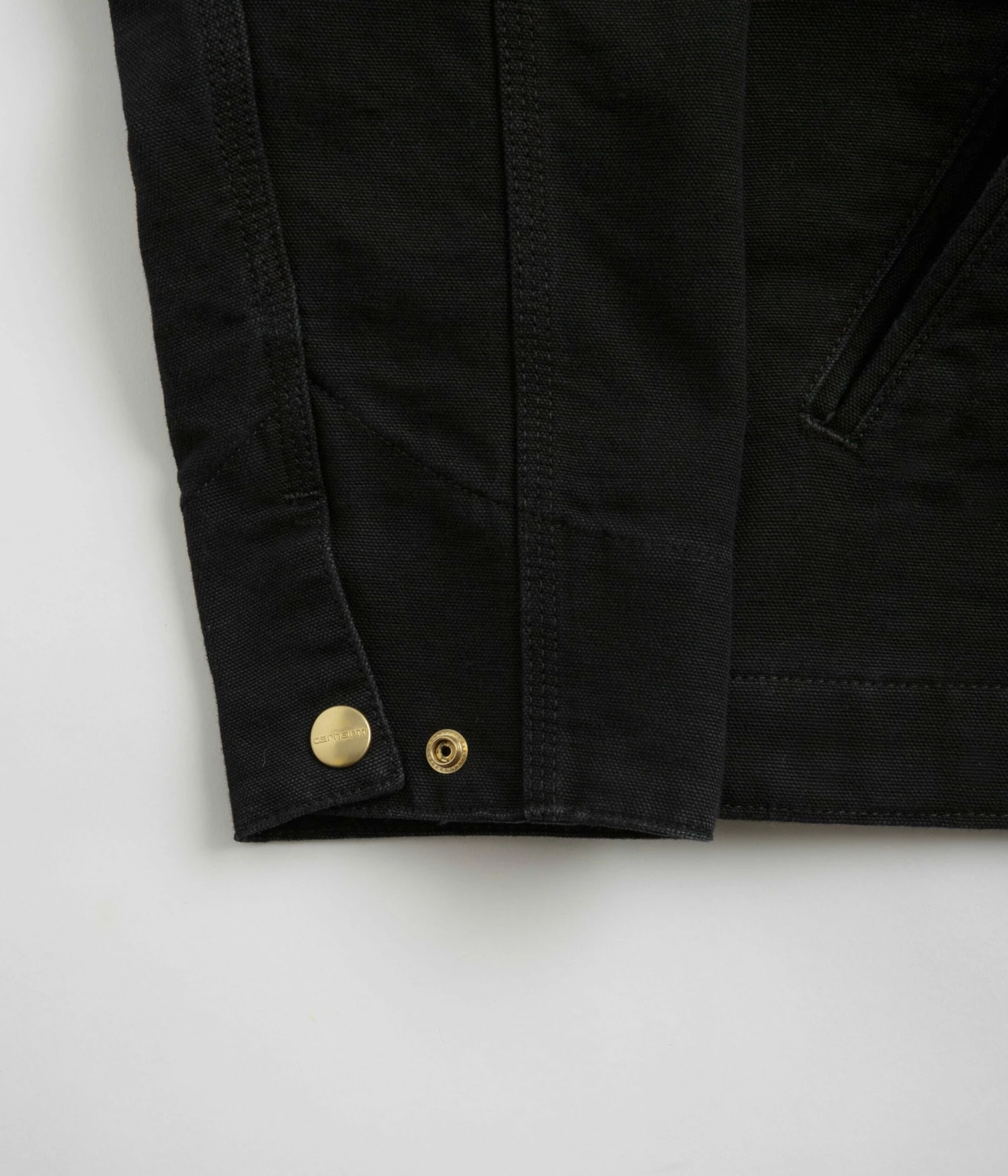 Carhartt Detroit Jacket in Black and Aged Canvas. Utility inspired and designed with a corduroy collar, this boxy fitting Carhartt jacket is made from 100% organic cotton ‘Dearborn’ canvas. Featuring a full length zipper fastening, nylon lined sleeves and a poplin lined body, this black Carhartt jacket is finished with two waist pockets, a zippered chest pocket and with woven flag label branding.