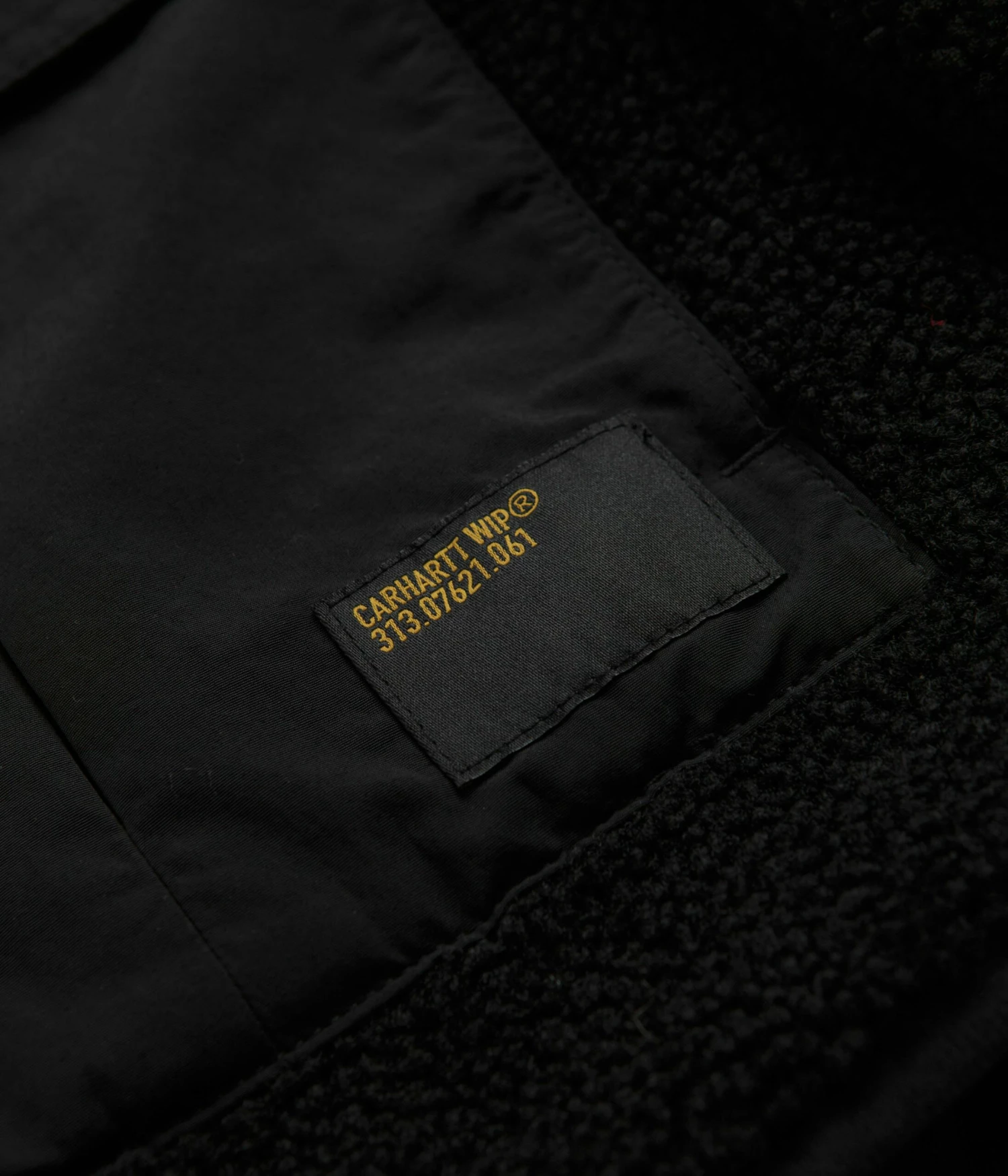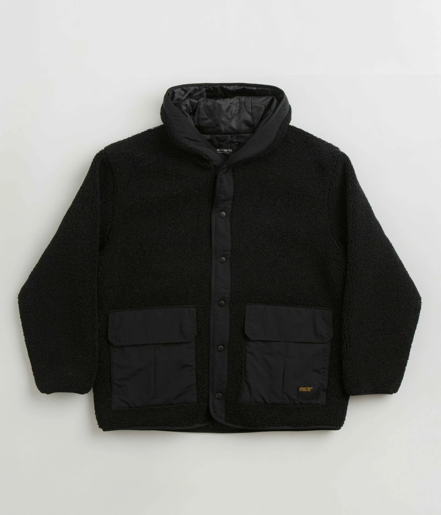 Carhartt Devin Hooded Liner Fleece in Black. Made from 100% polyester pile with a polyester-twill lining and an onion quilted insulation, this regular fitting Carhartt fleece is styled with a lined hood and a full length snap fastening. Featuring nylon-taffeta detailing, elasticated cuffs and a woven elastic hem, this black Carhartt liner is finished with two front pockets and with a military style flag label.