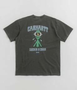 Carhartt Duckin T-Shirt in Black. Loose fitting and made from 100% cotton, this garment dyed Carhartt t-shirt arrives as part of the brand’s latest collection. Featuring a flexible rib knit collar and a straight cut hem, this black Carhartt t-shirt is finished with printed front and rear graphics.