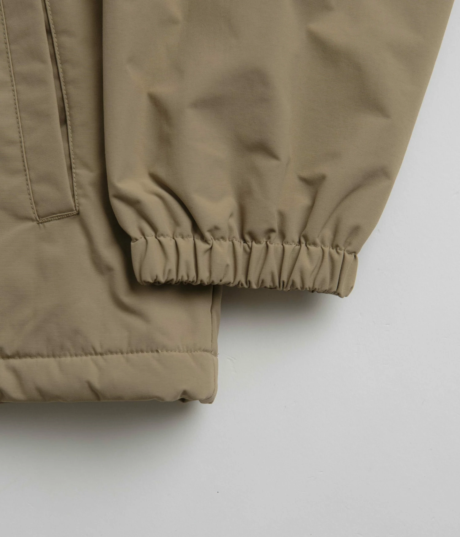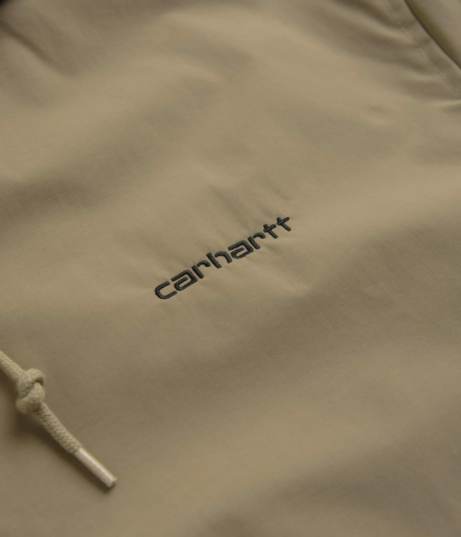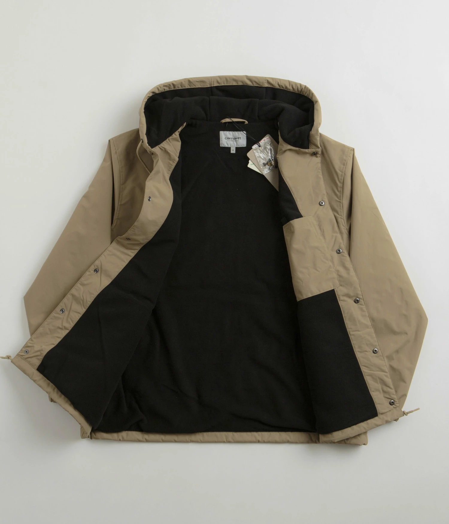 Carhartt Hooded Coach Jacket in Leather and Black. Varsity inspired and tailored to a regular fitting, this Carhartt jacket is made from 100% nylon Supplex® with a water-repellent exterior. Featuring a fleece lined inner, an adjustable drawstring hood, a full length snap placket, elasticated cuffs and an adjustable hem, this khaki brown Carhartt jacket is finished with two waist pockets and embroidered logo branding.