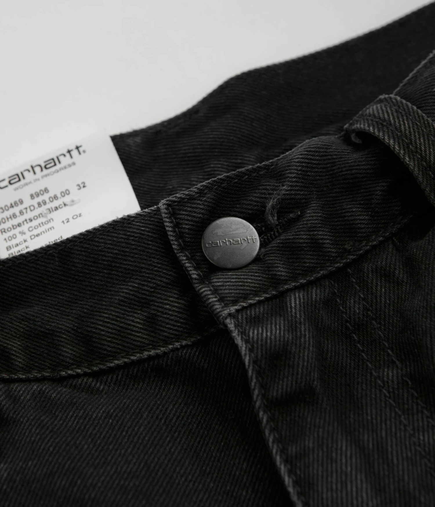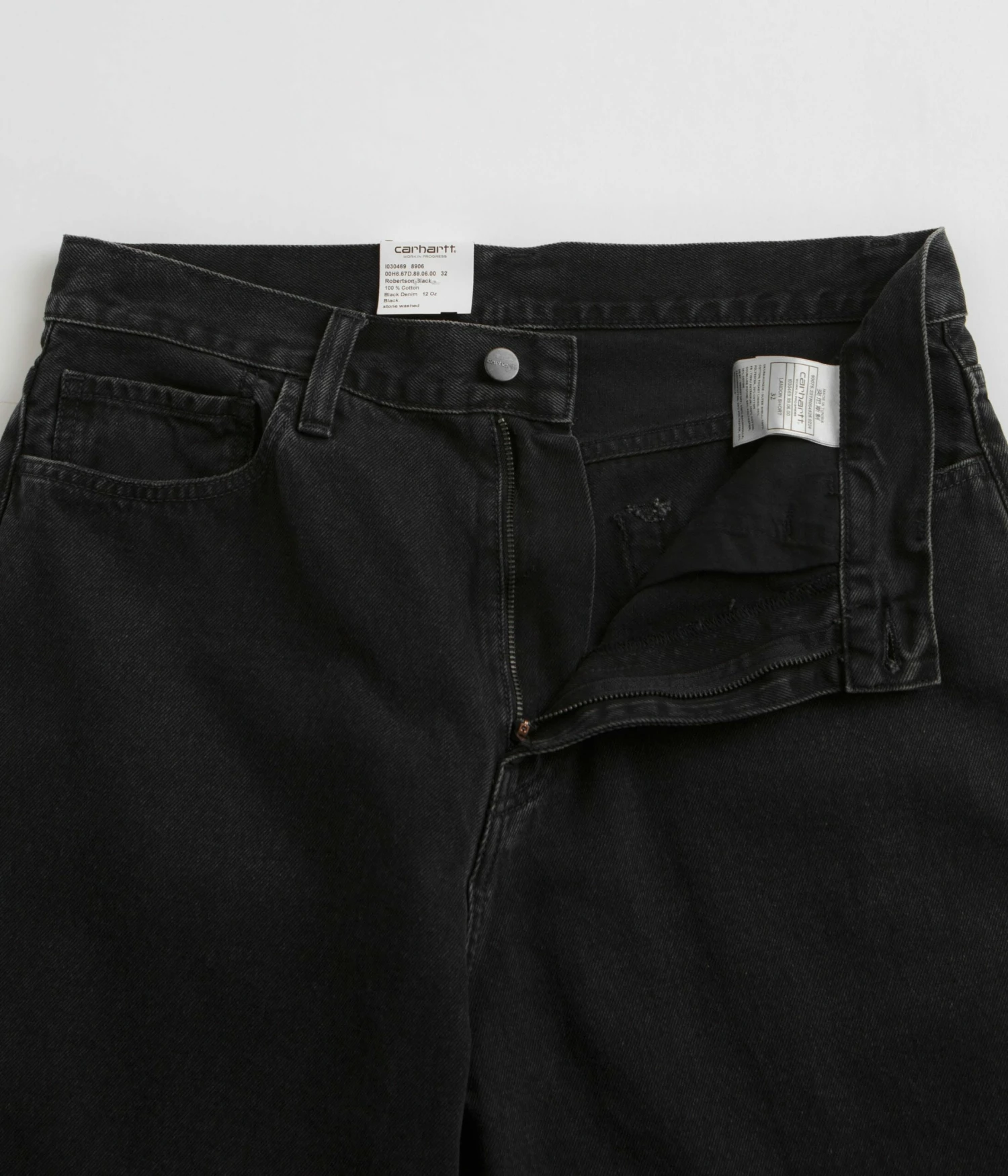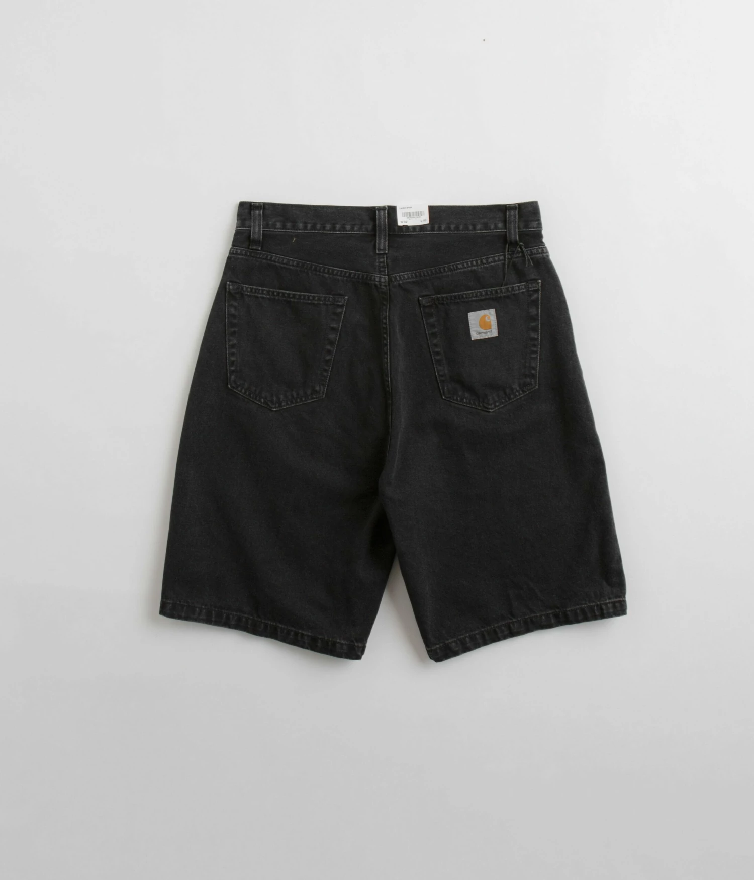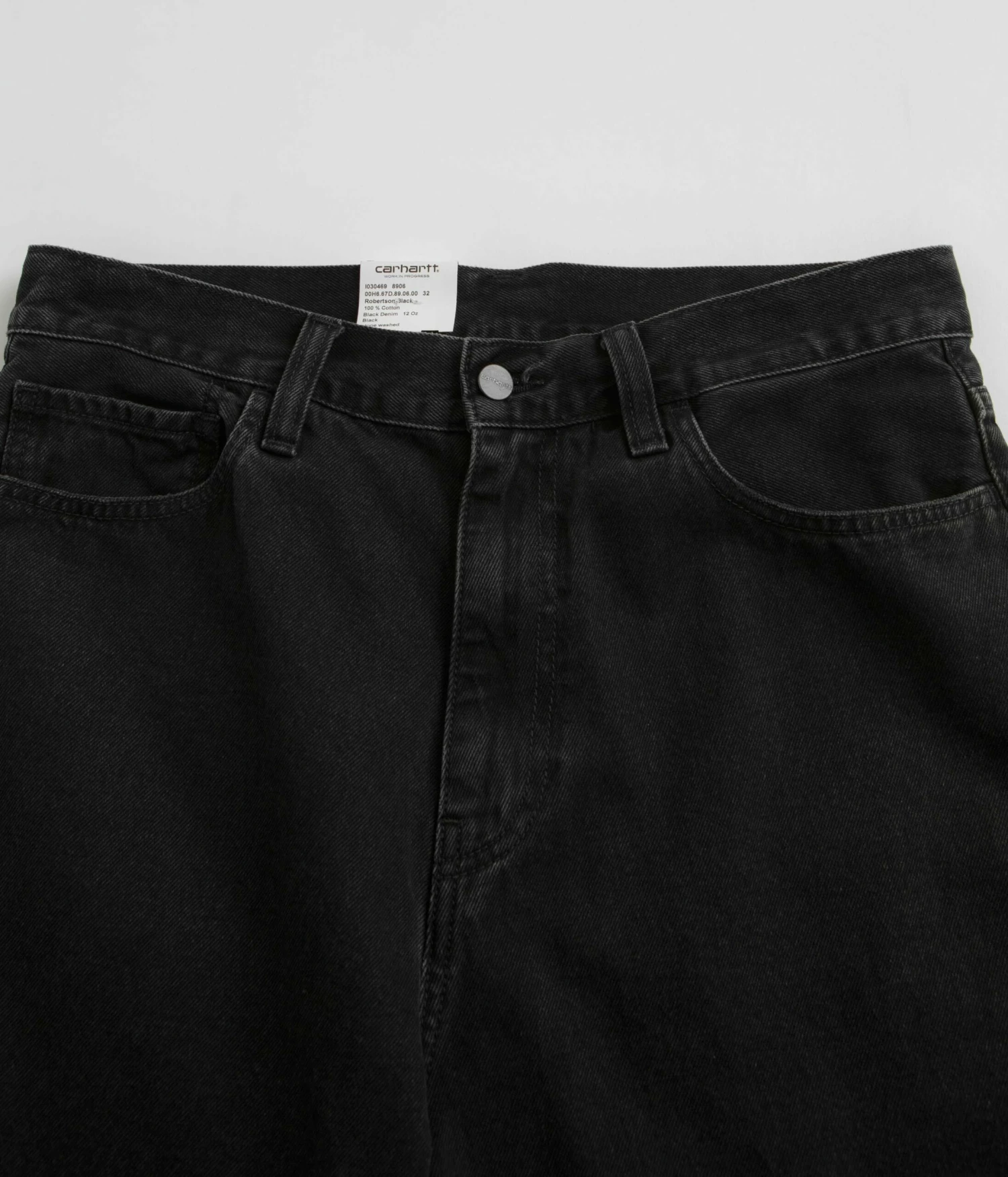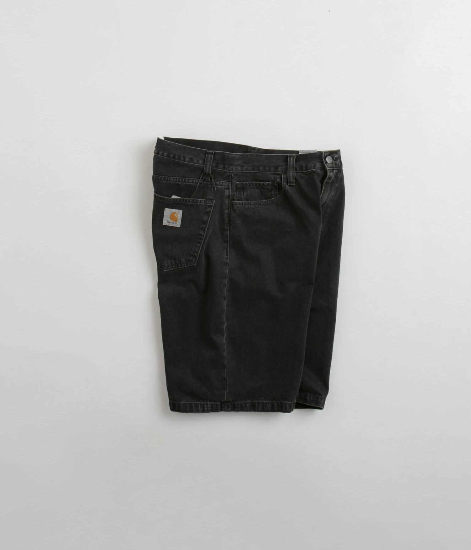 Carhartt Landon Shorts in Black Stone Washed. Stone washed and tailored to a loose fitting, these Carhartt shorts are made from 100% cotton ‘Robertson’ denim. Featuring a regular waist and a single button secured zipper fly, these black Carhartt shorts are finished with four classic pockets and with woven flag label branding.