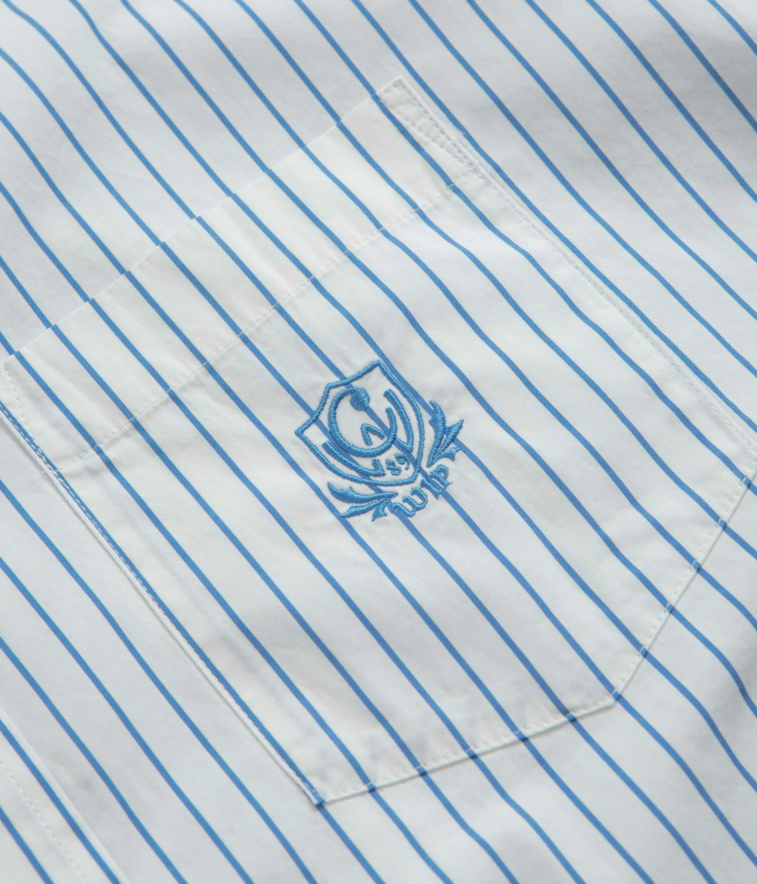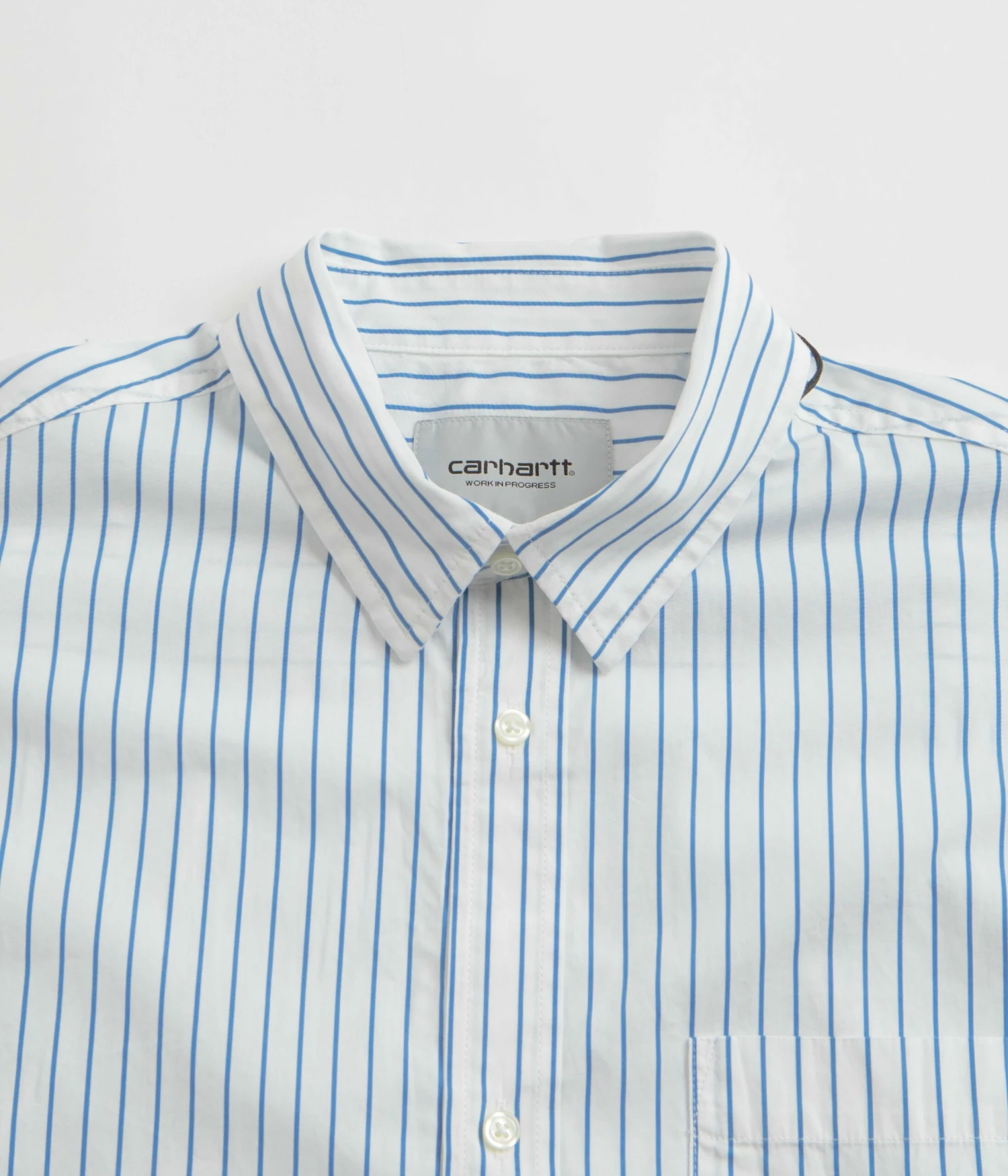 Carhartt Linus Stripe Poplin Shirt in Bleach and White. Loose fitting and made from 100% cotton poplin, this striped Carhartt shirt is garment washed with a yarn dyed pattern. Featuring a classic stand collar, a full length button fastening, adjustable cuffs and a curved hem, this white and blue striped Carhartt shirt is finished with a single left chest pocket and with embroidered logo branding.