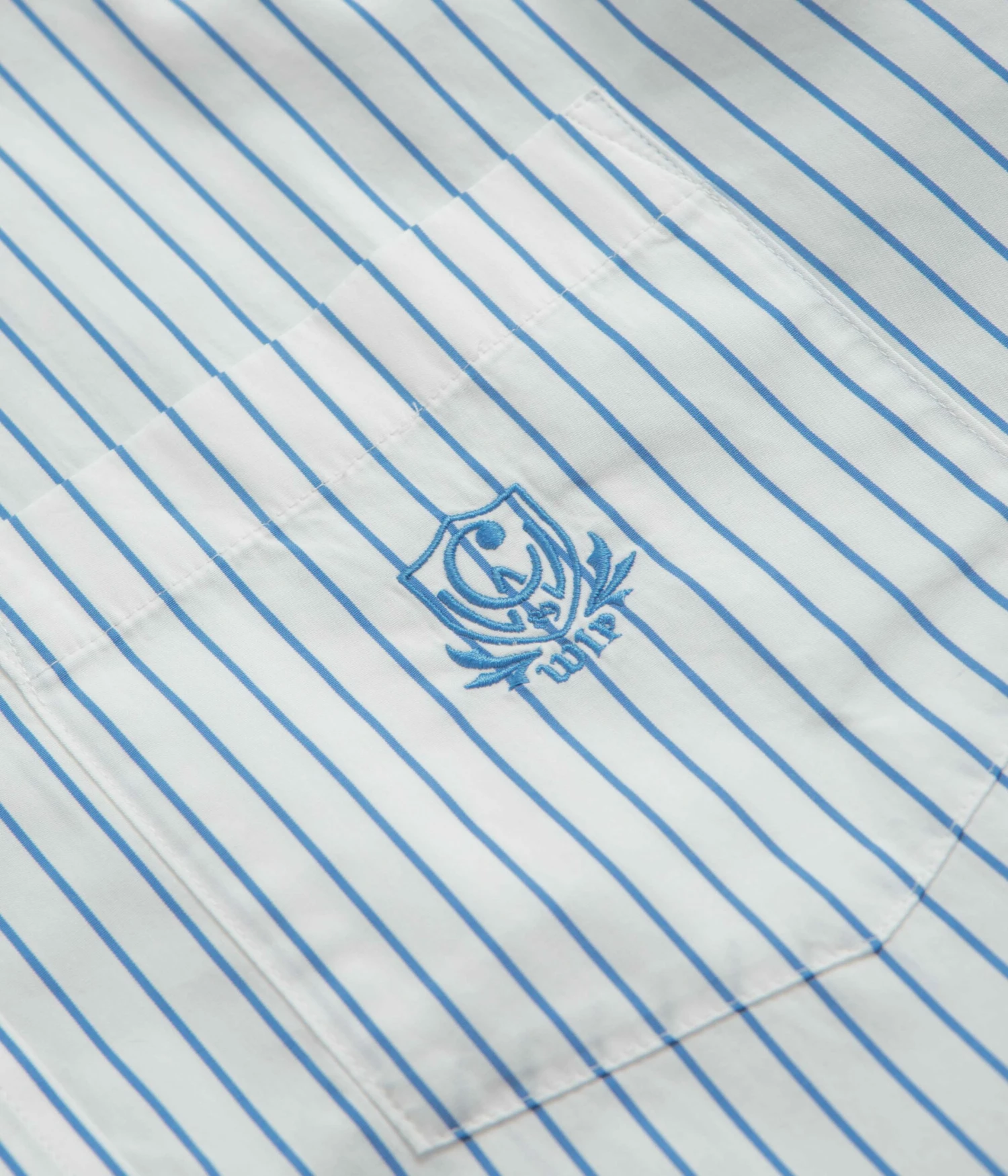 Carhartt Linus Stripe Poplin Short Sleeve Shirt in Bleach and White. Made from 100% cotton poplin with a yarn dyed stripe, this loose fitting Carhartt shirt is styled with a full length button fastening. Featuring a classic stand collar and a curved hem, this striped white Carhartt shirt is finished with a single chest pocket and with embroidered logo branding.