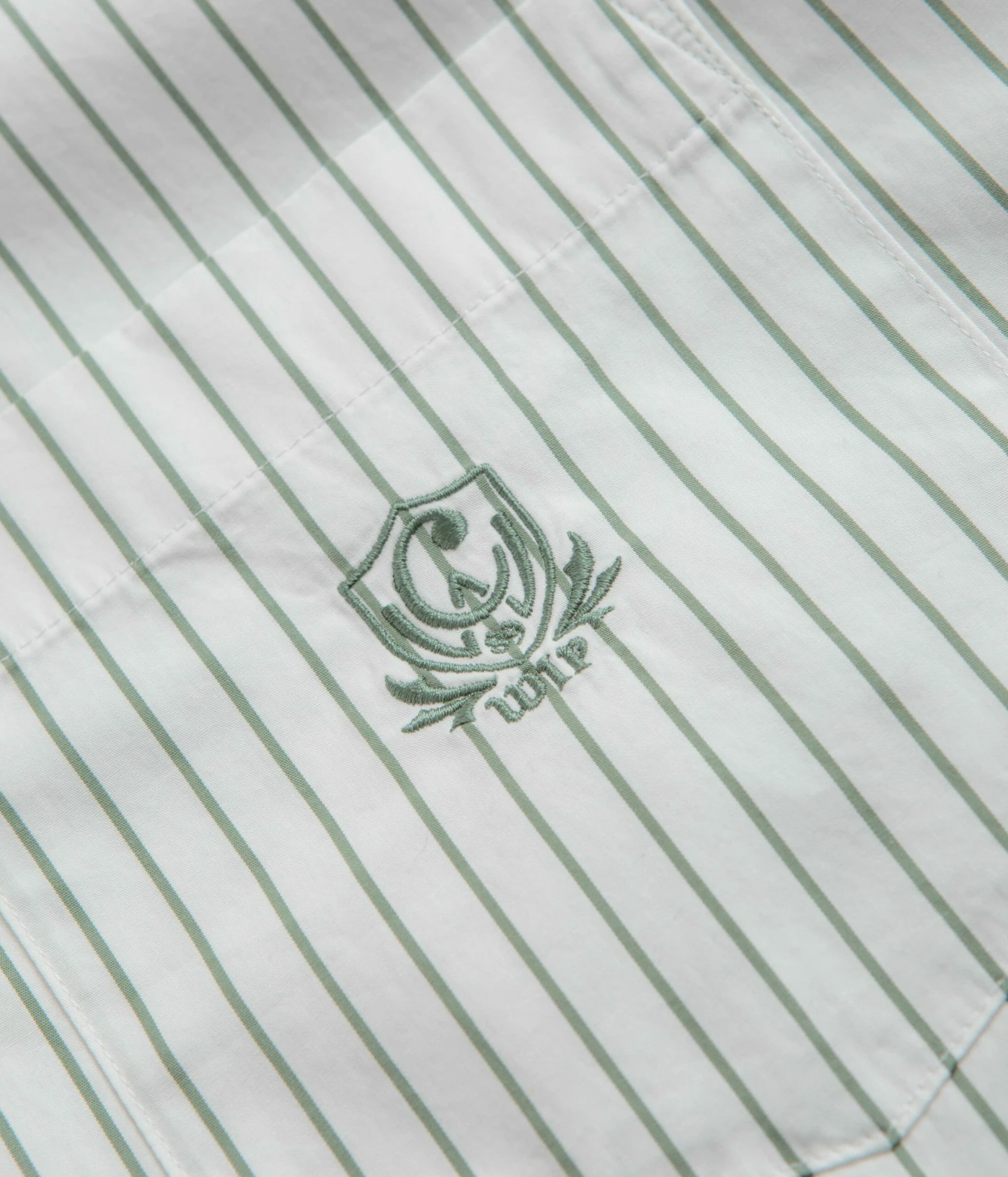 Carhartt Linus Stripe Poplin Short Sleeve Shirt in Park and White. Loose fitting and made from 100% cotton poplin, this garment dyed Carhartt shirt is designed with a full length button fastening. Featuring a stand collar and a curved hem, this green striped Carhartt shirt is finished with a single chest pocket and with embroidered logo branding.