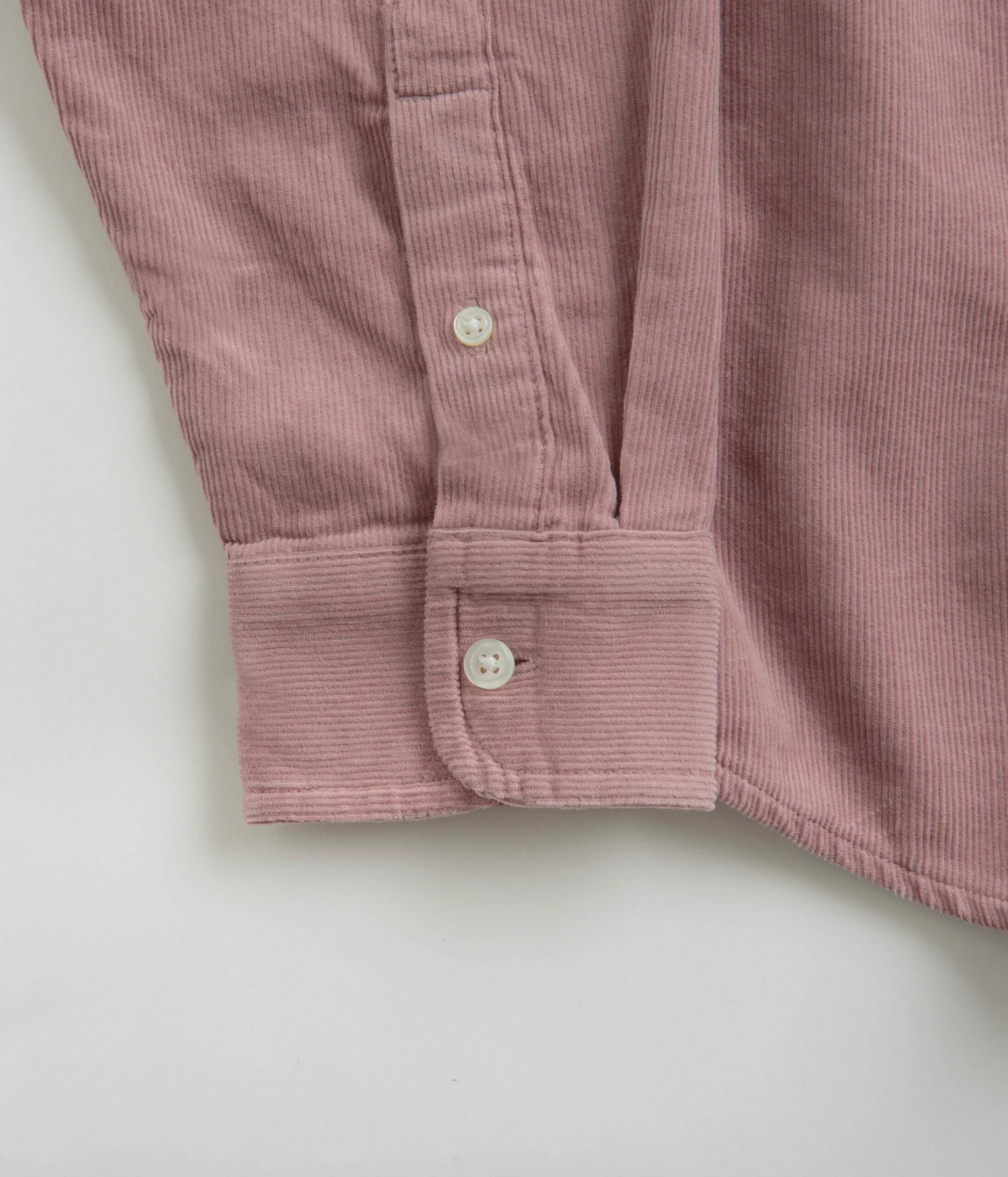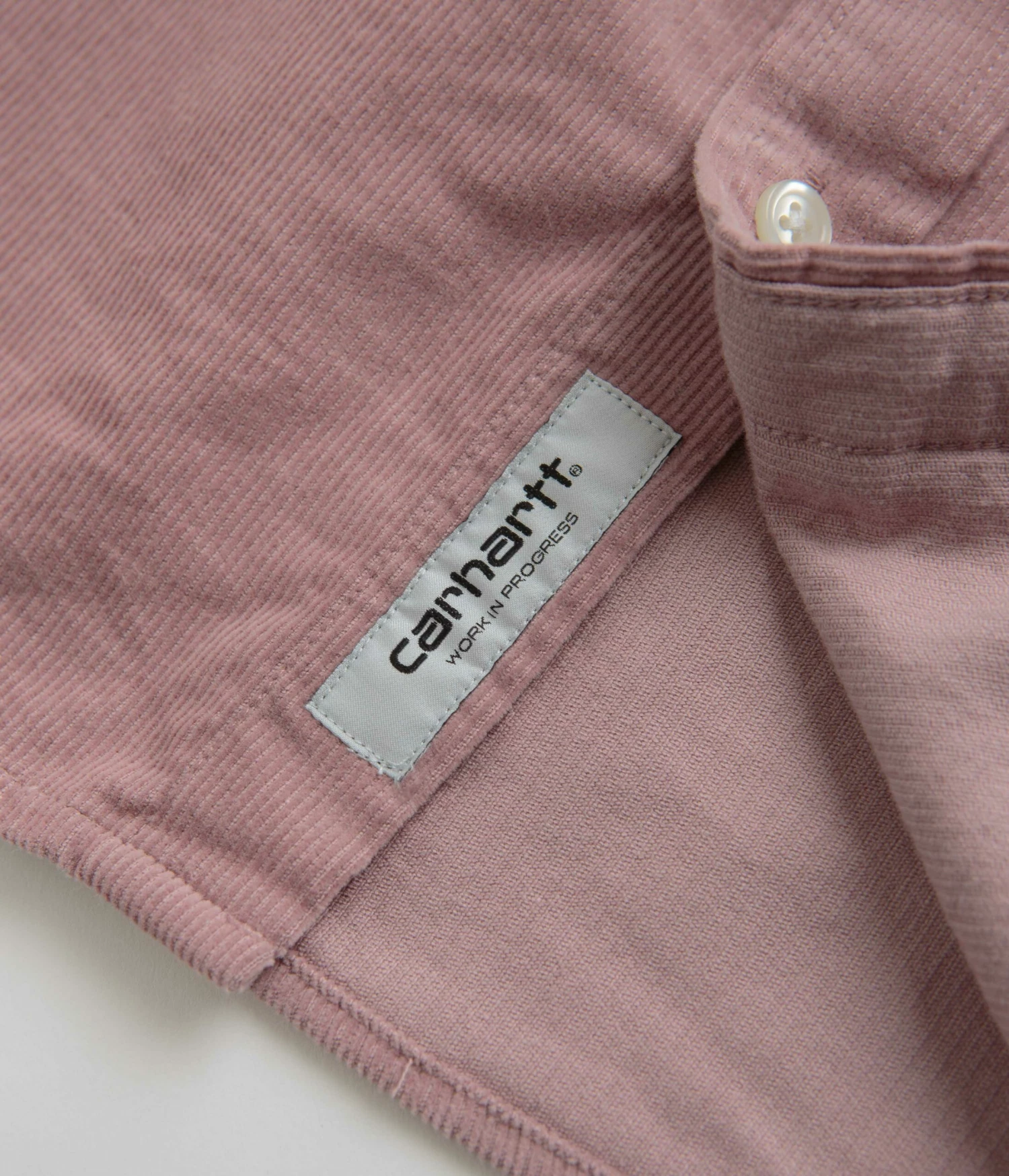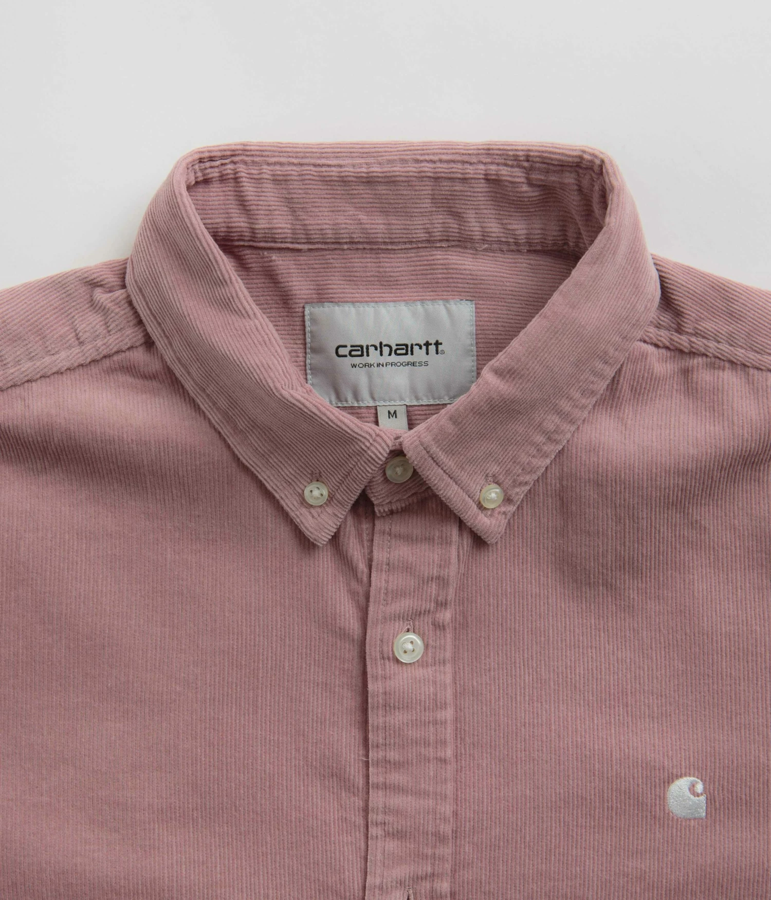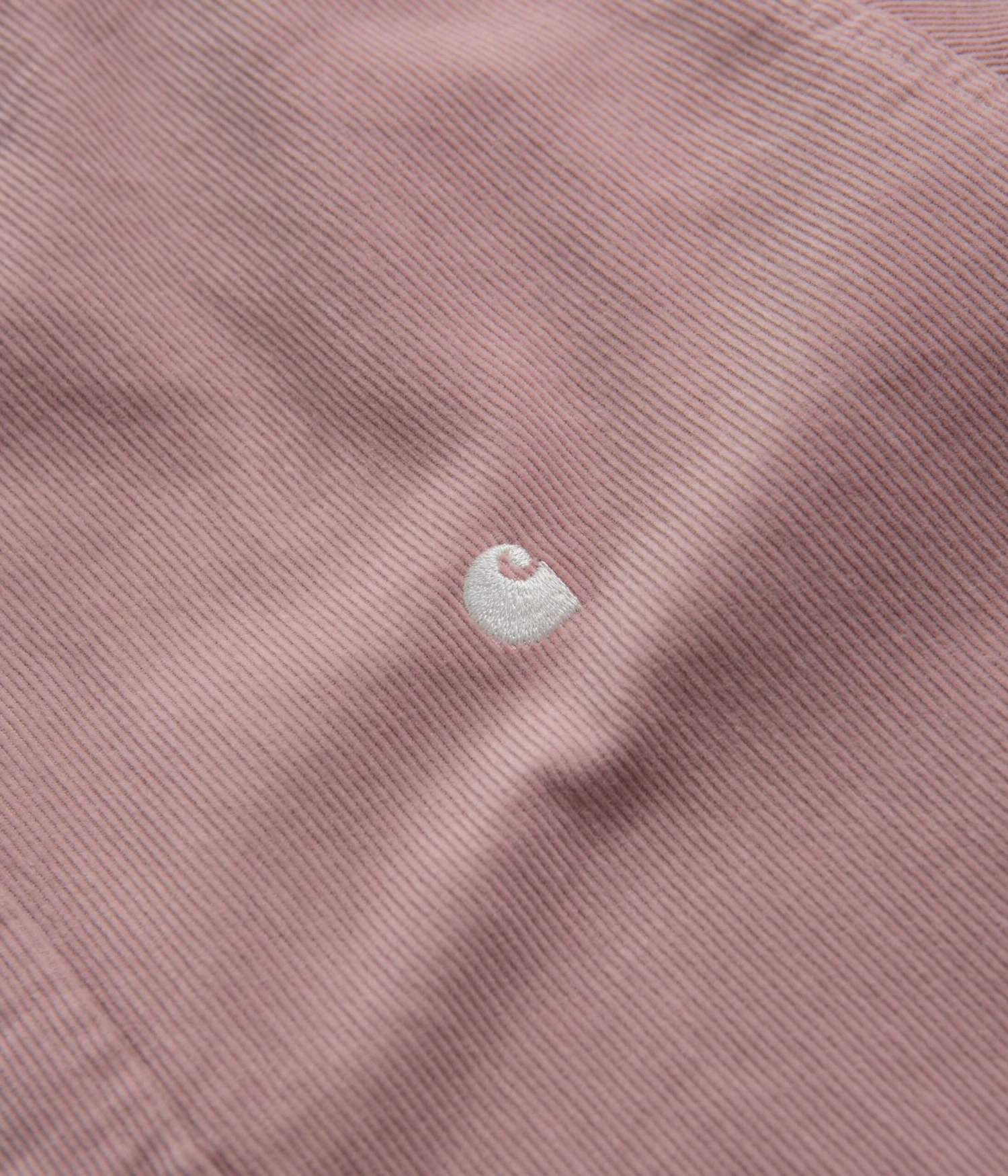 Carhartt Madison Fine Cord Shirt in Glassy Pink and Wax. Regular fitting and made from 100% cotton corduroy, this colour block Carhartt shirt is designed with a fine, 16-wale fabrication. Featuring a button-down collar, a full length button fastening and with adjustable cuffs, this pink Carhartt shirt is finished with a curved hem and with an embroidered left chest logo.
