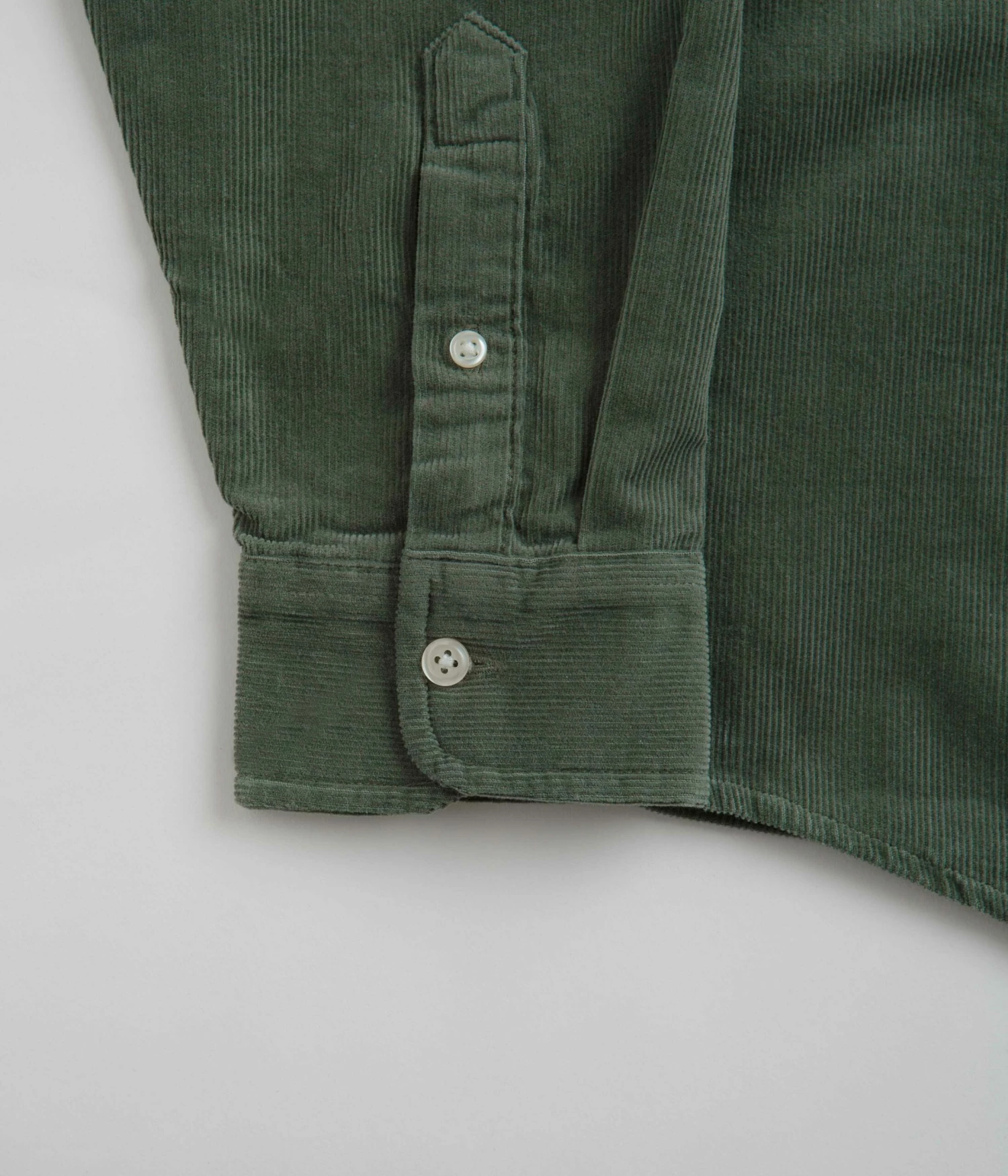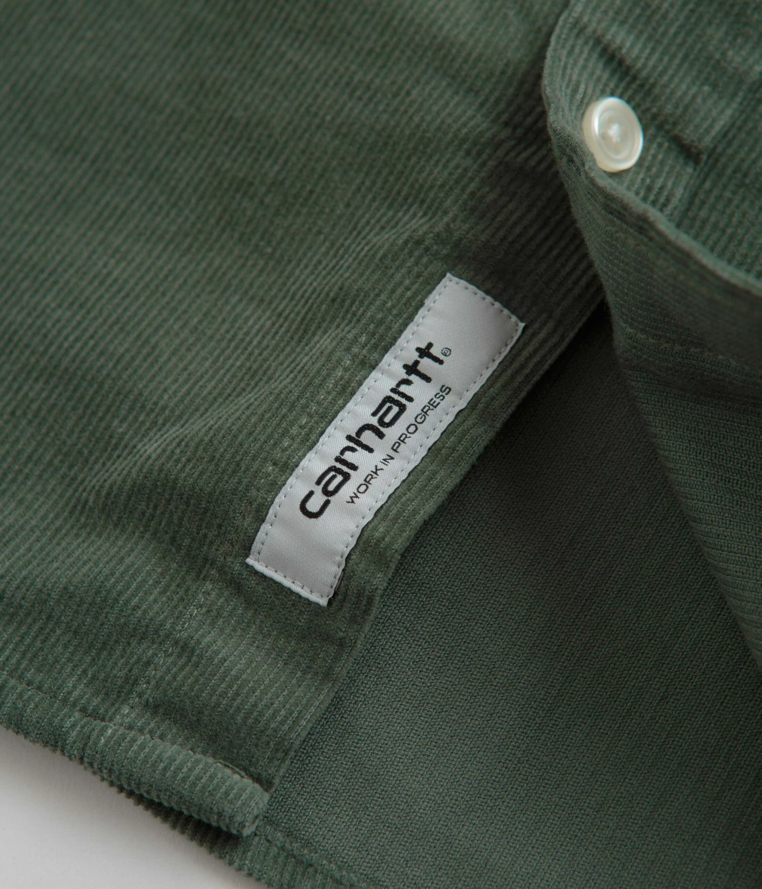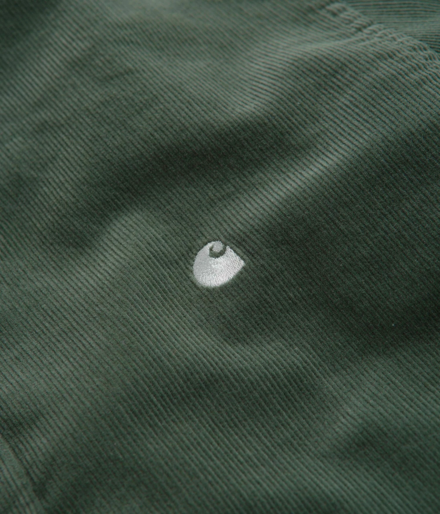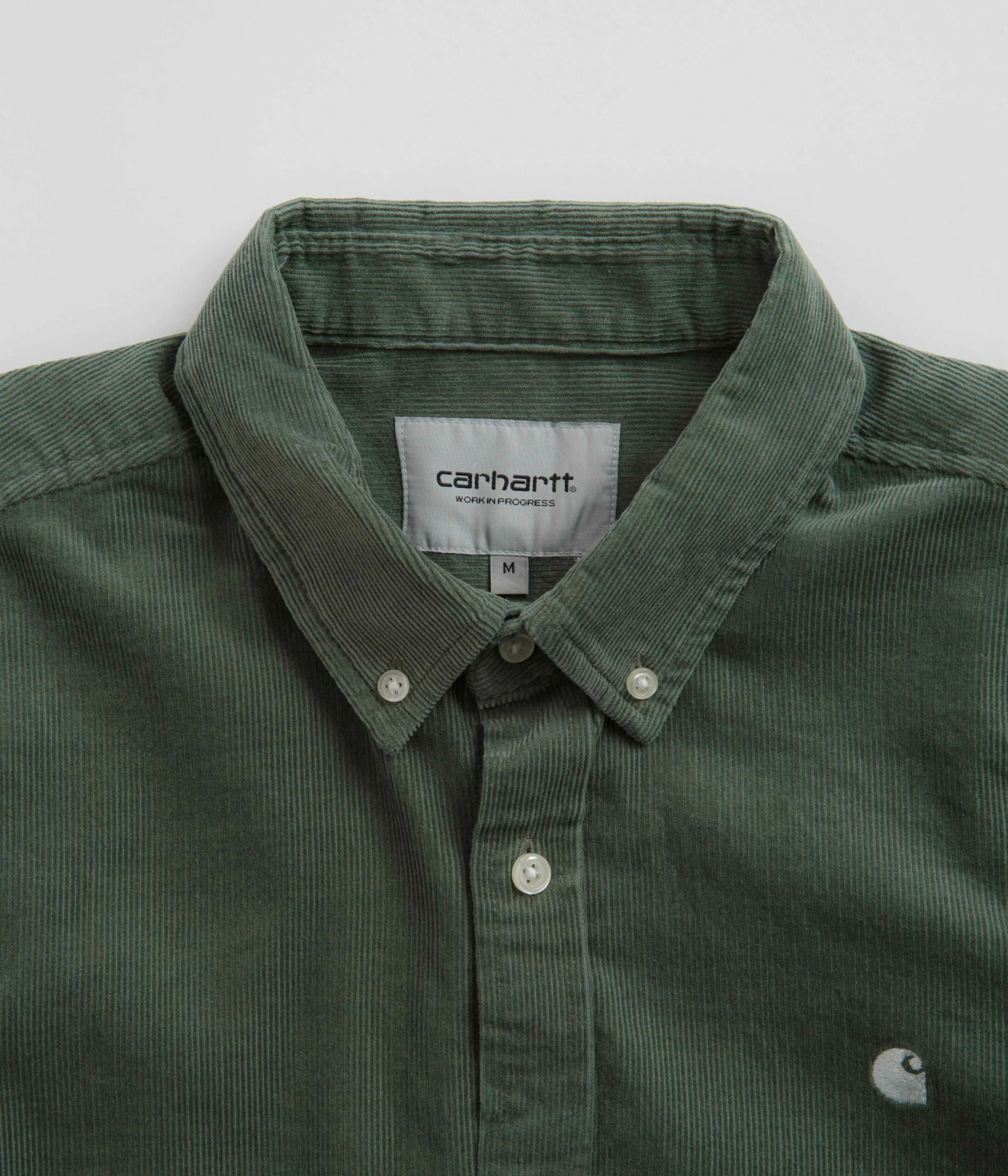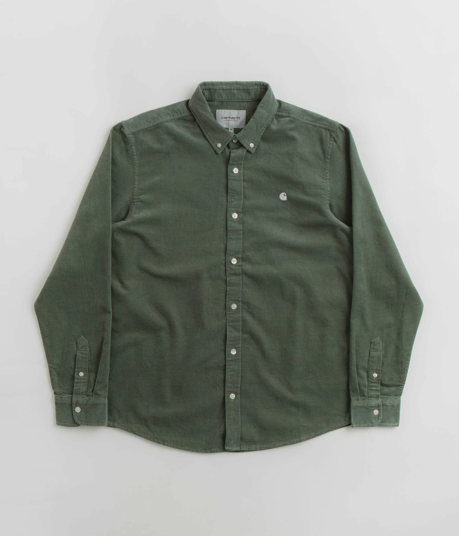 Carhartt Madison Fine Cord Shirt in Park and Wax. Part of the brand’s latest release, this regular fitting Carhartt shirt is made from 100% cotton corduroy. Featuring a button down collar, a full length button fastening, a curved hem and a garment dye fabrication, this green Carhartt shirt is finished with a fine, 16-wale construction and with an embroidered left chest logo.