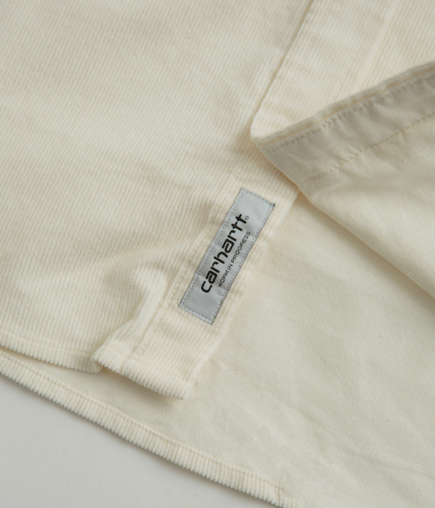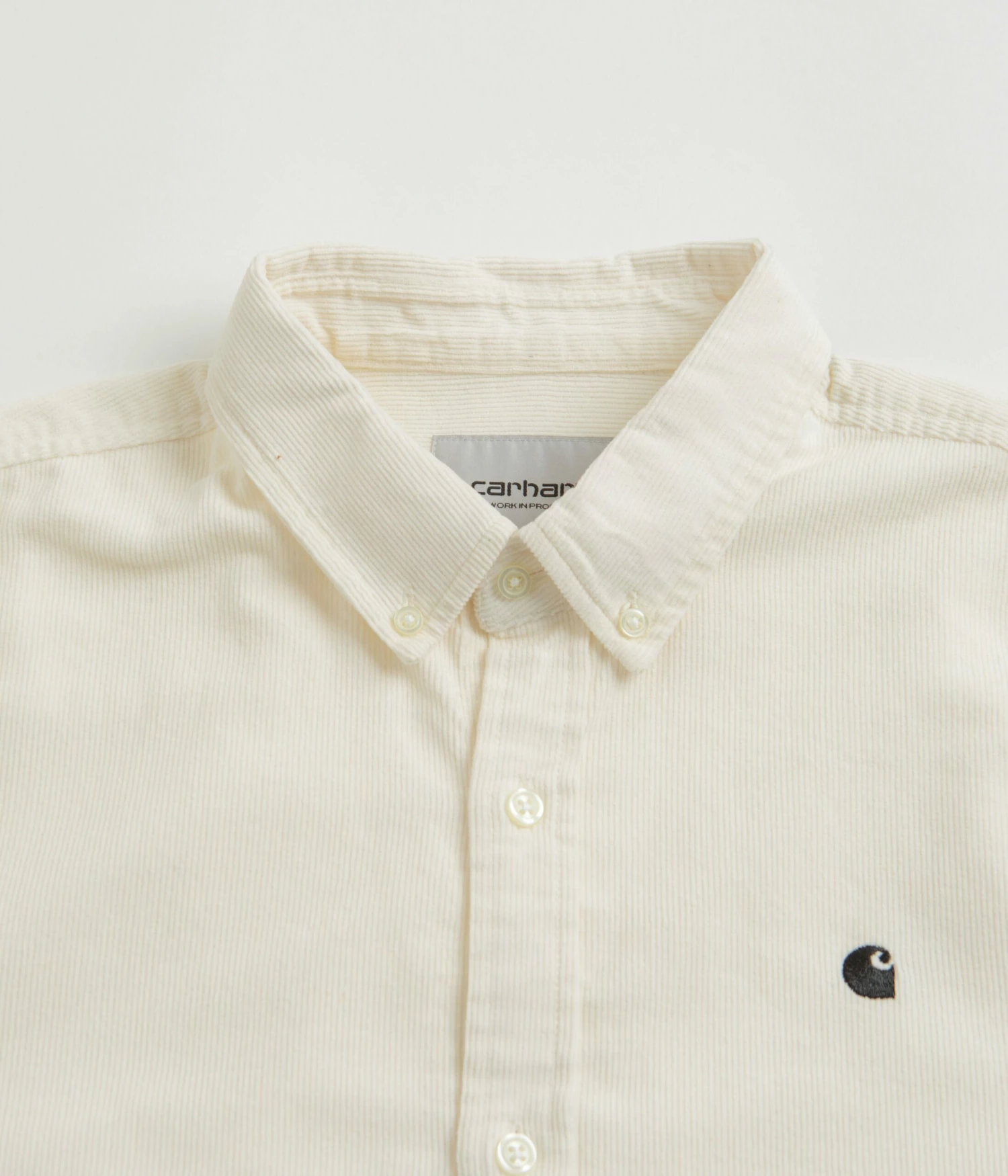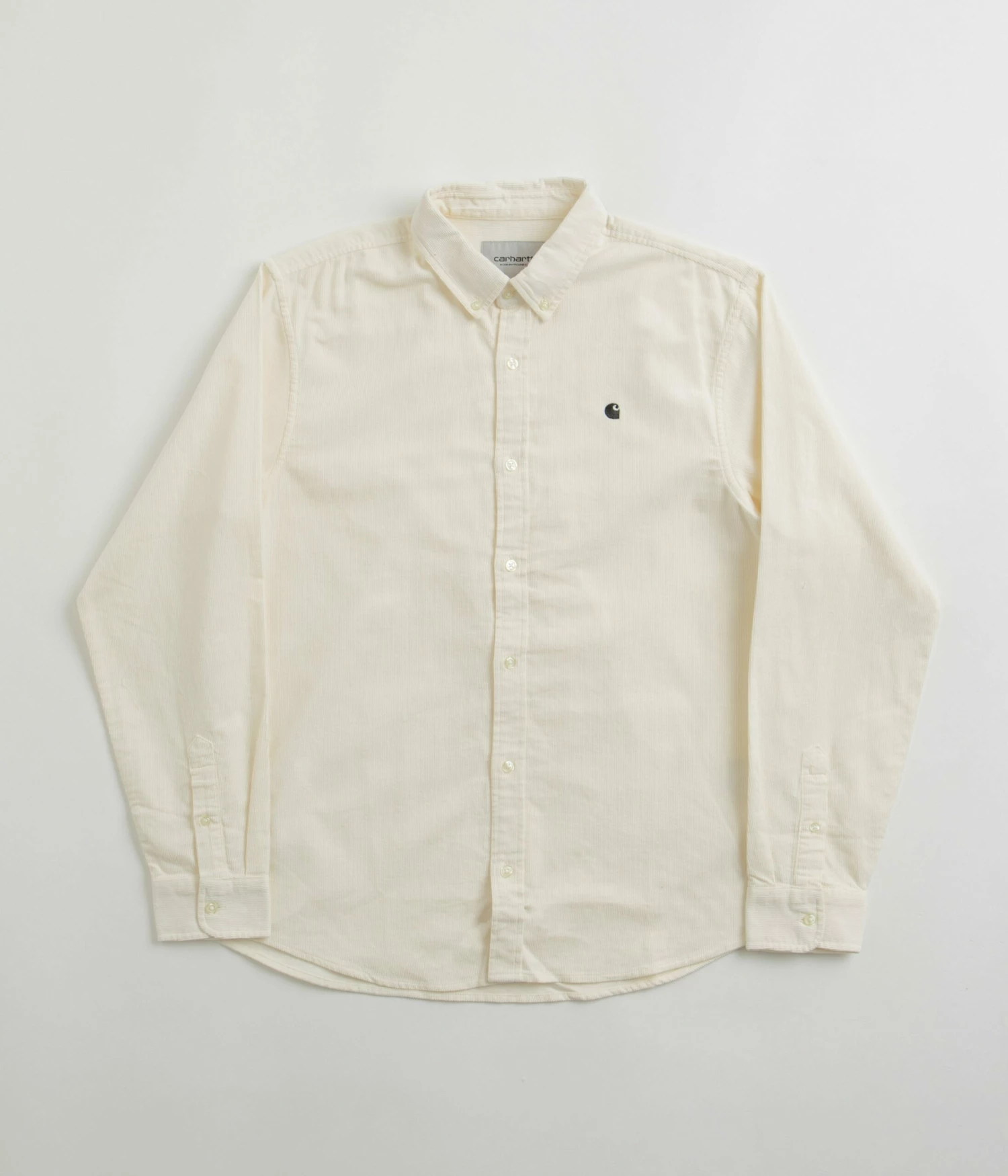 Madison Fine Cord Shirt in Wax and Black. Crafted from 100% cotton corduroy with a resilient 16-wale composure and durable 6.5oz construction, this workwear inspired Carhartt shirt is tailored to a regular fit with a garment washed finish for added archival influence. Styled with a button-down collar and button adjustable cuffs, this refined everyday staple also features a contoured high-low hemline and a full length buttoned placket for quick and easy styling. Signed off with a crisp white embroidered C-wave motif sewn across the left chest and with traditional ‘Carhartt’ branding sewn across the inner neckline.