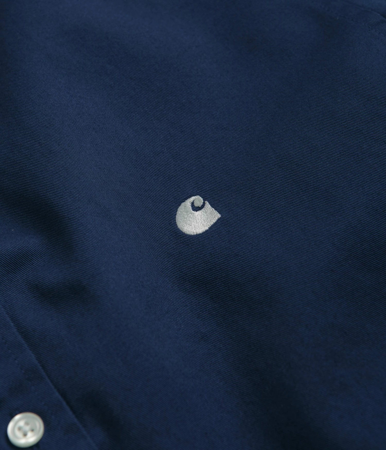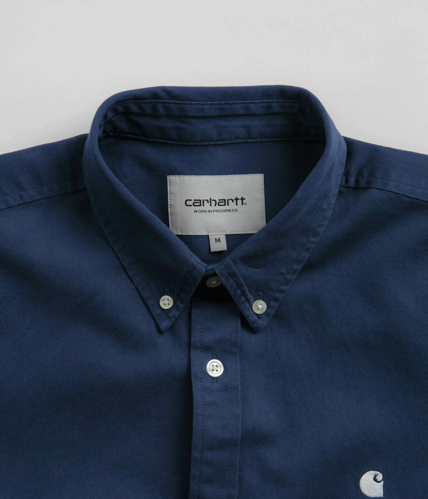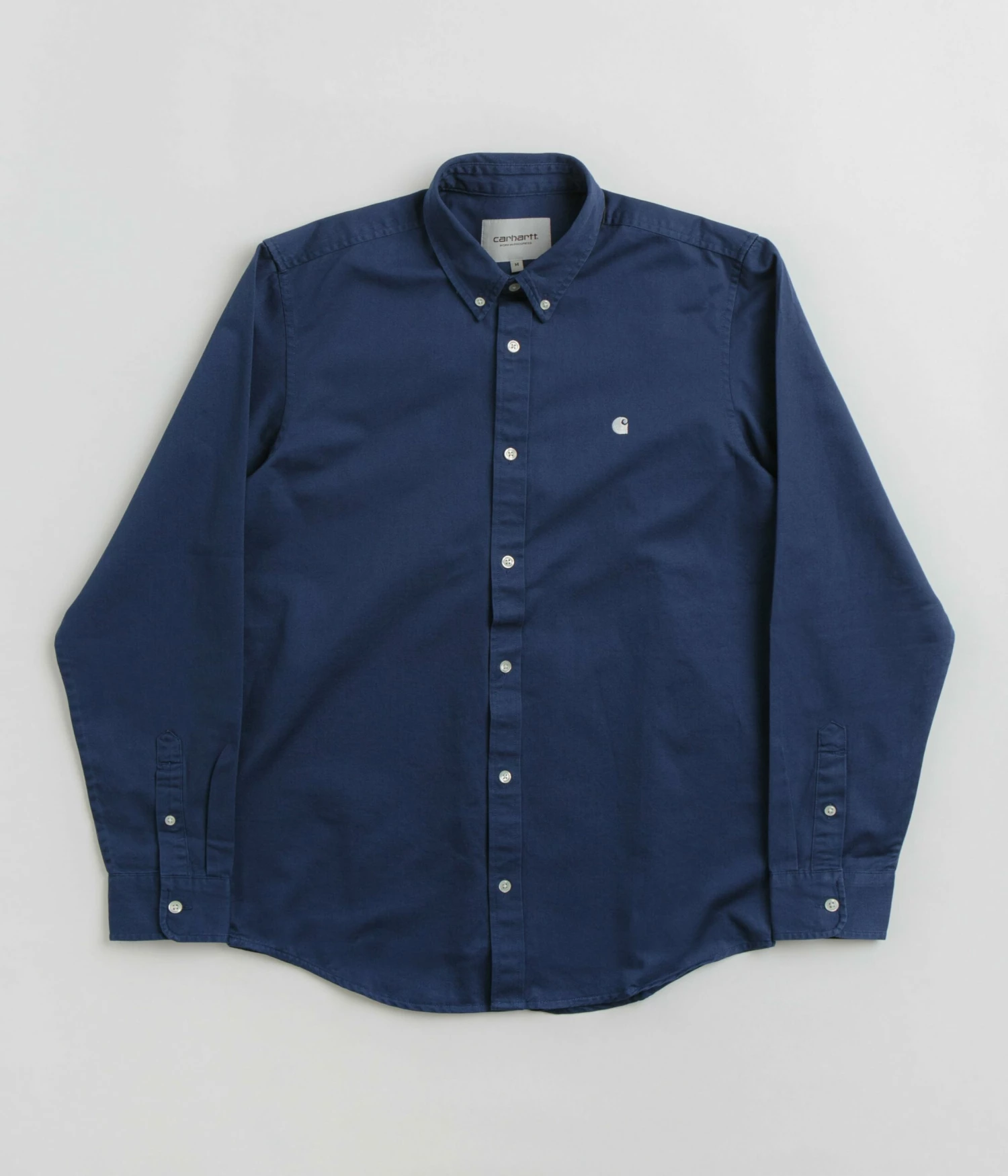 Carhartt Madison Shirt in Elder and White. Made from 100% cotton twill, this Carhartt shirt is designed with a button-down collar, a full length button fastening and a heavy garment wash. Finished with adjustable cuffs and a curved hem, this navy Carhartt shirt also features a contrasting left chest embroidered logo.