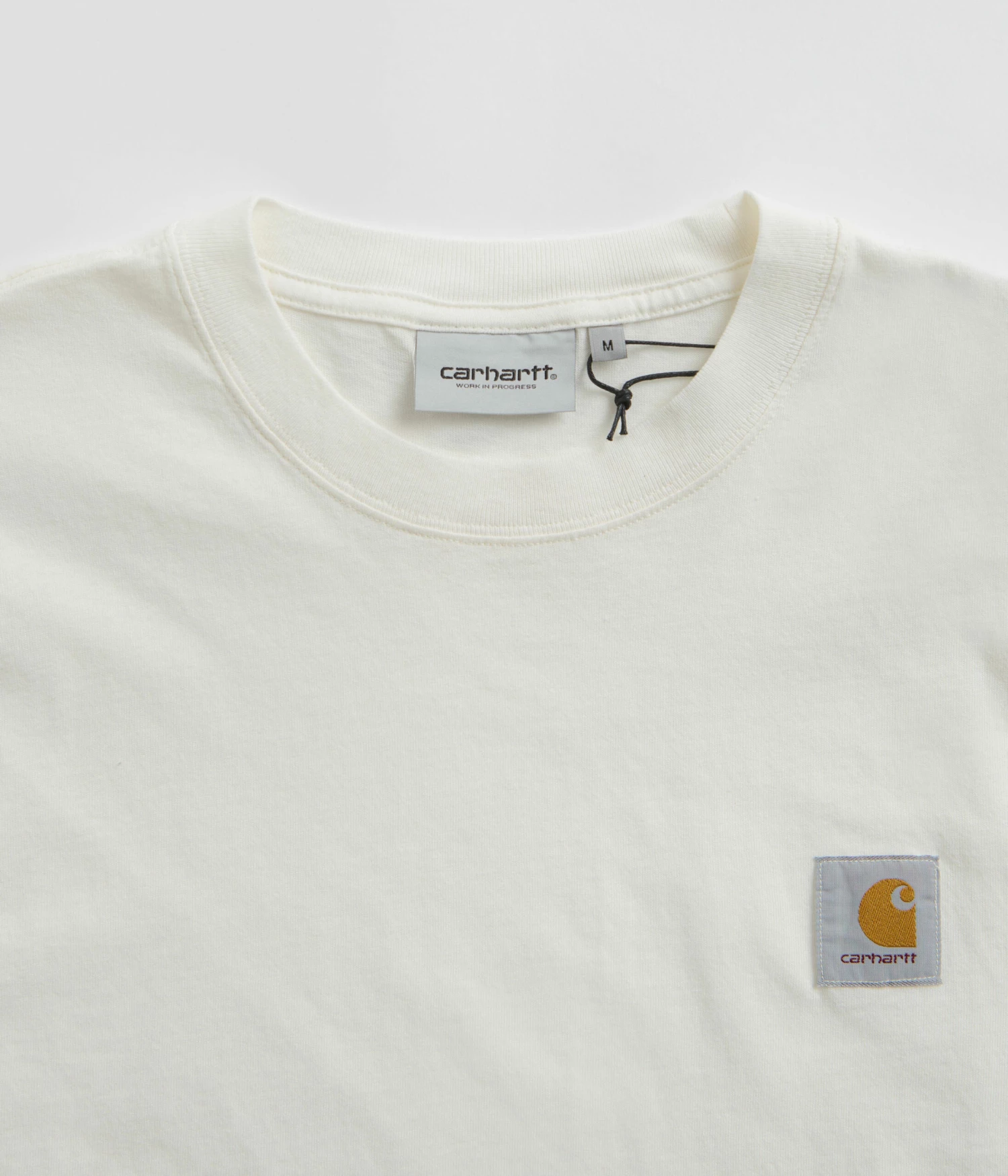 Carhartt Nelson T-Shirt in Wax. Seen here in a garment dyed shade, this loose fitting Carhartt t-shirt is made from 100% cotton single jersey. Featuring a flexible rib knit collar and a straight cut hem, this wax Carhartt t-shirt is finished with a dyed flag label sewn across the left chest.