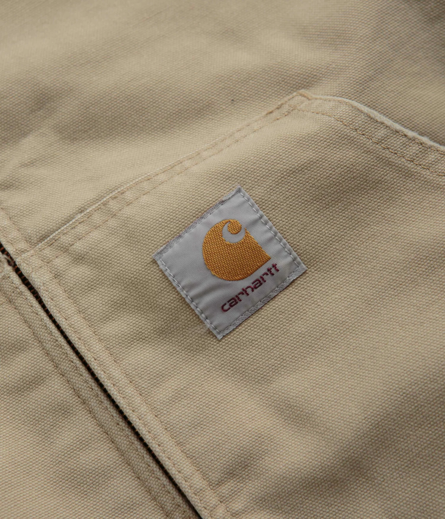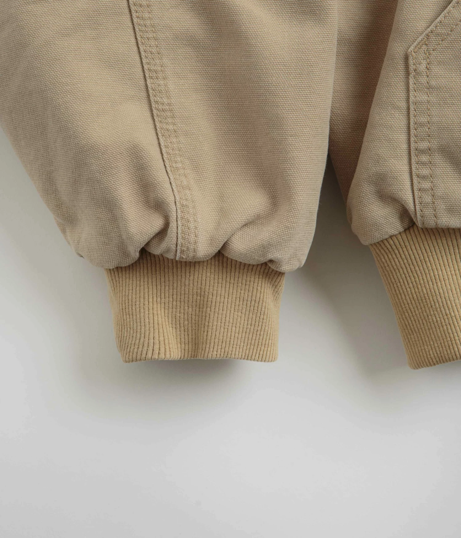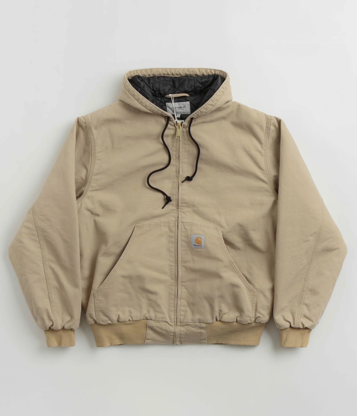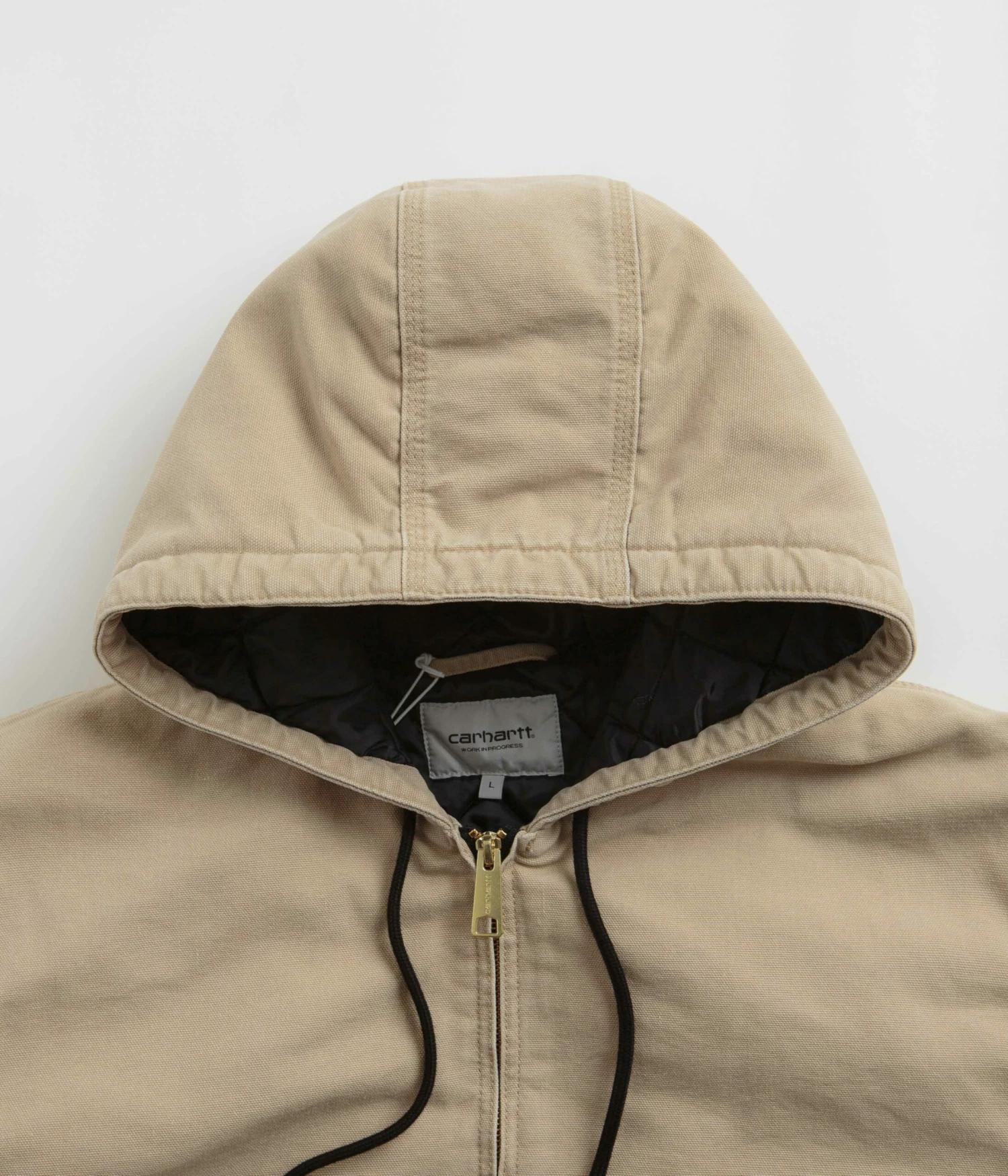 Carhartt OG Active Jacket in Dusty Hamilton Brown. Putting their own spin on a classic sportswear design, this Carhartt jacket has been inspired by activewear pieces but is equipped with a diamond quilted lining for increased warmth and comfort. Cut to an original loose fit through the body from an aged 12oz organic cotton ‘Dearborn’ canvas to allow for layering, the seams have been triple stitched to ensure a high level of durability whilst soft ribbed cuffs have been positioned around the edge of the body and long sleeves to provide a close, flexible fit. The front is fastened by a full length zip closure and above the hood also features a diamond quilted lining and can be adjusted in size using external black toggle cord adjusters. At the waist a kangaroo pouch pocket has been split across either side of the body with side entry points that mean it can also be used as a hand warmer compartment.