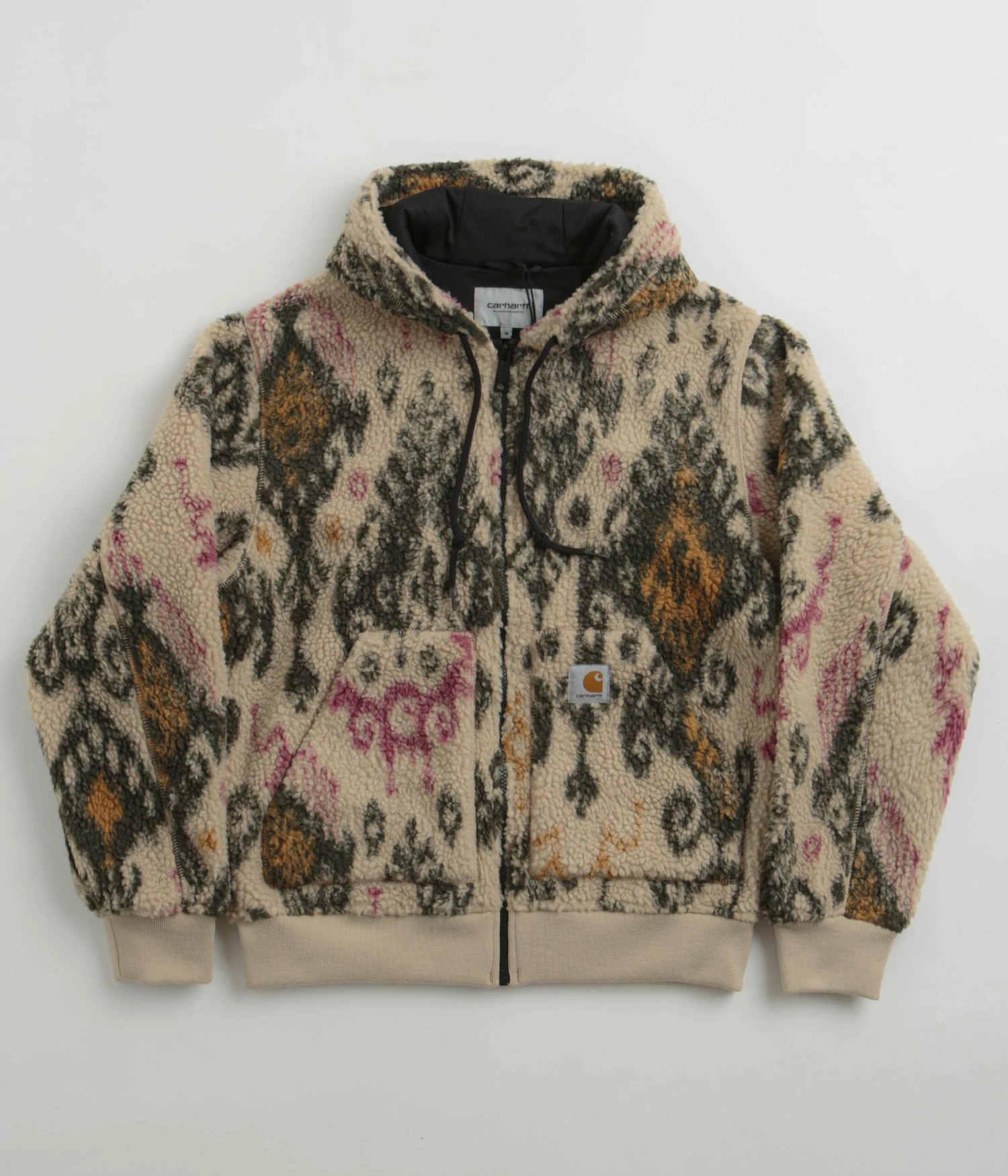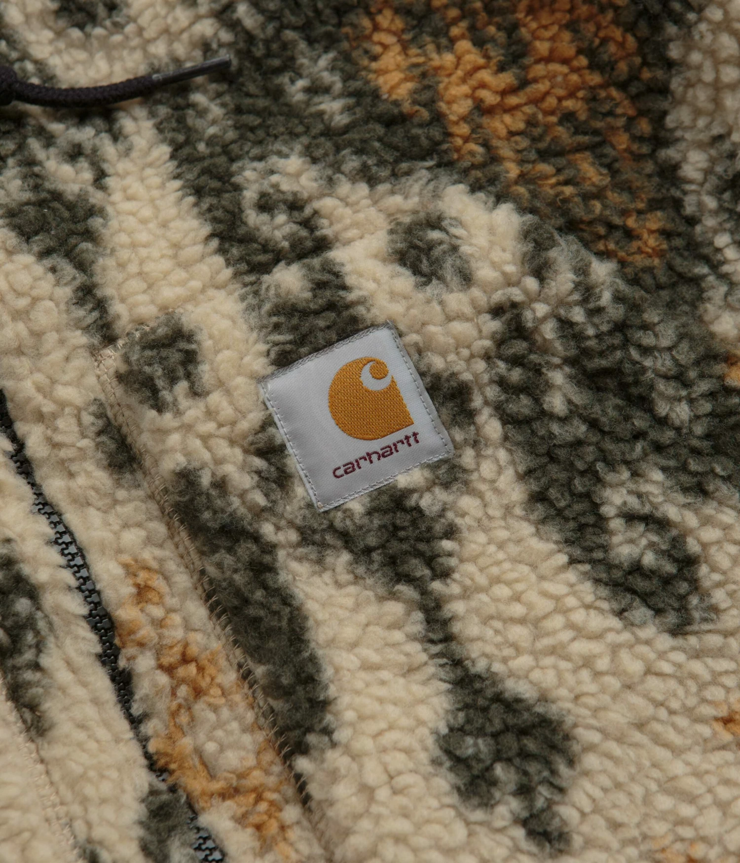 Carhartt OG Active Liner Fleece in Baru Jacquard and Wall. Tailored to a regular fitting from 100% polyester jacquard, this mesh lined Carhartt fleece is styled with a nylon-taffeta lined sleeves and a full length zipper fastening. Featuring a lined hood, rib knit cuffs and a woven elastic hem, this patterned Carhartt fleece is finished with two waist pockets and with embroidered flag label branding.