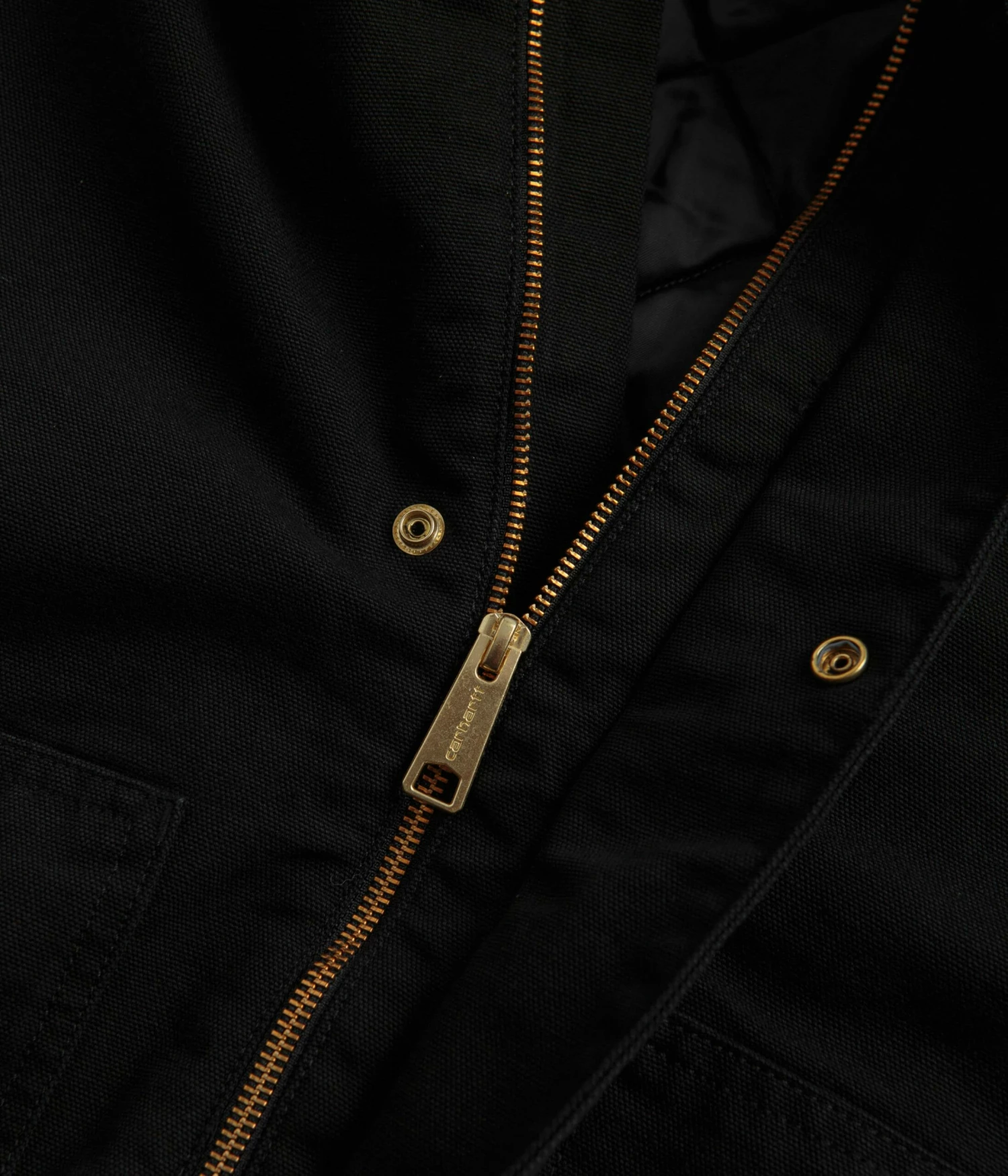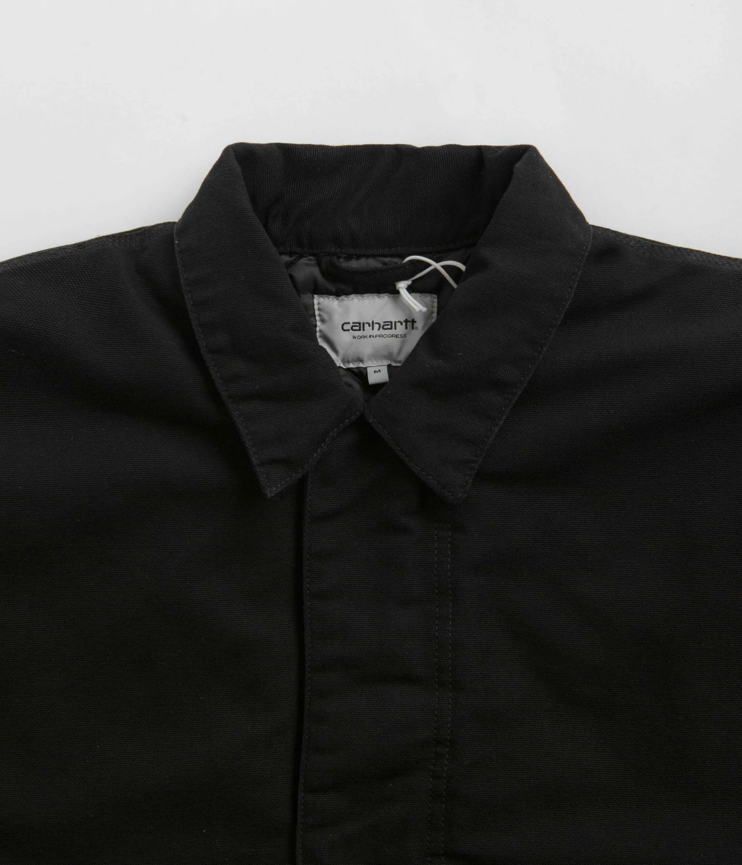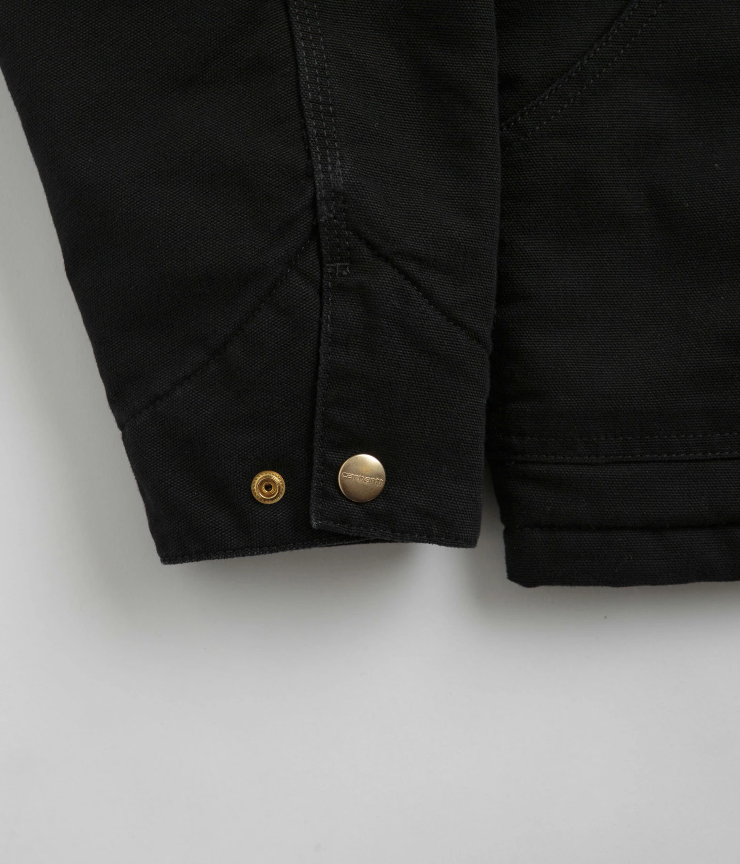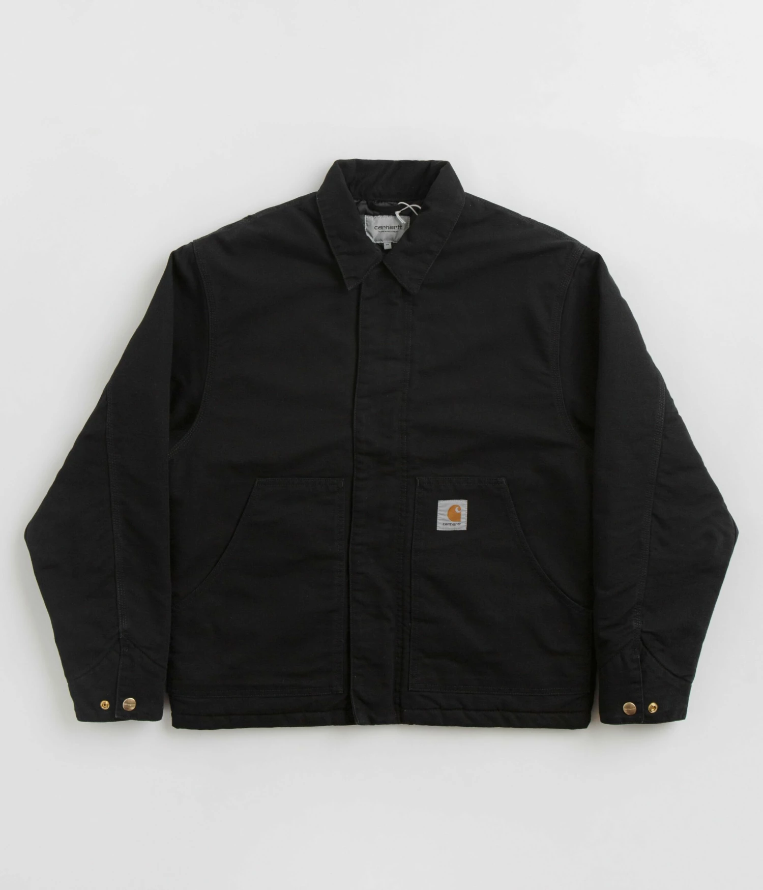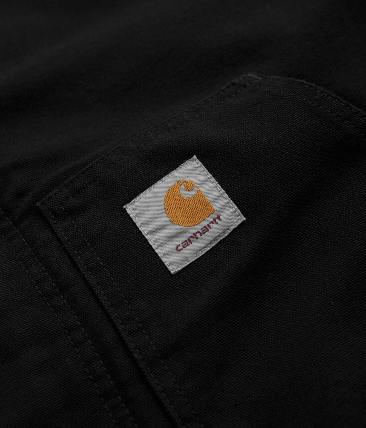 Carhartt OG Arcan Jacket in Black. Part of the brand’s Icons Reworked collection, this Carhartt jacket is made from 100% organic cotton ‘Dearborn’ canvas with a nylon-diamond quilted lining. Tailored to an original loose fitting with triple stitched seams and a full length zipper fastening, this black Carhartt jacket is finished with a protective storm placket fold, two waist pockets and embroidered flag label branding.