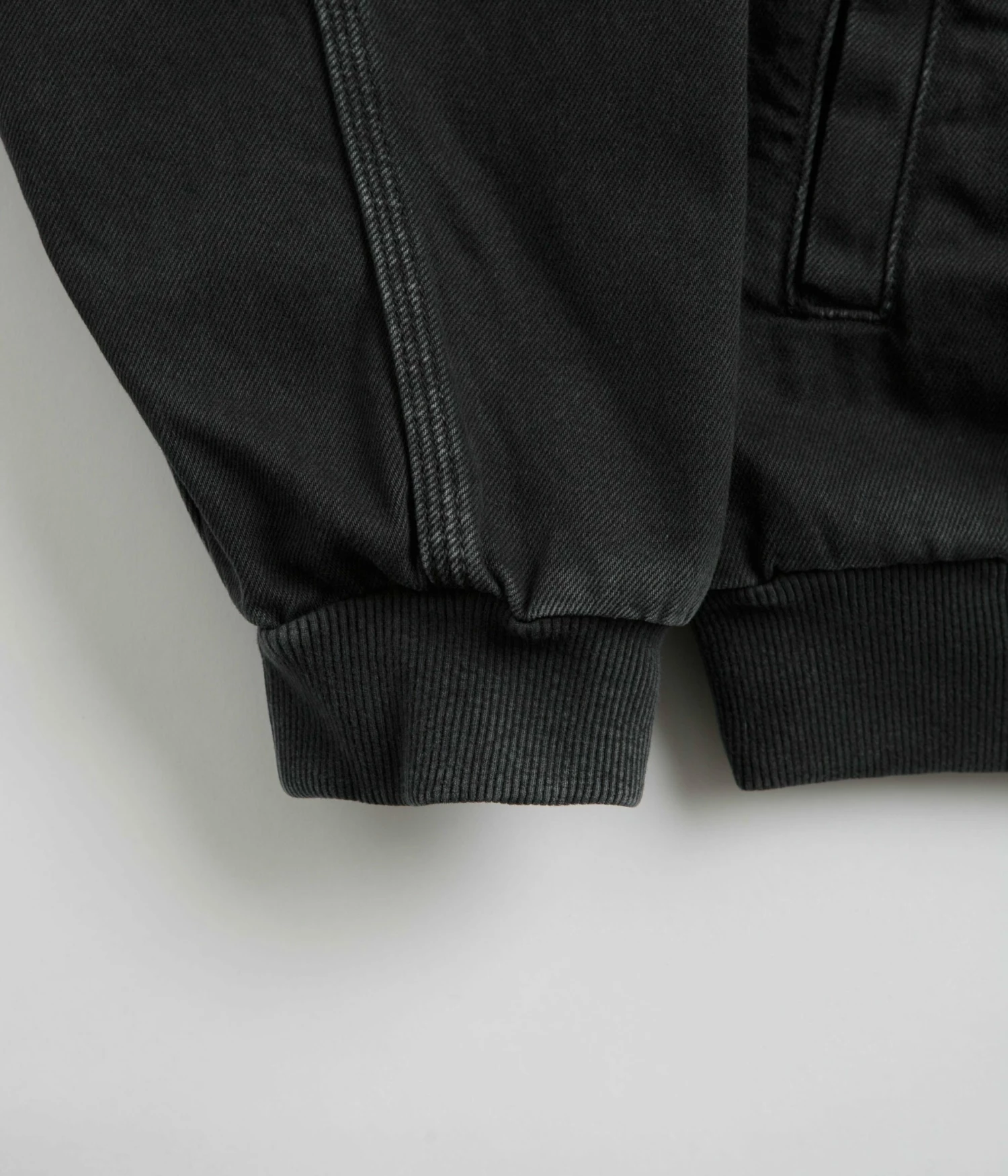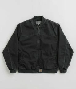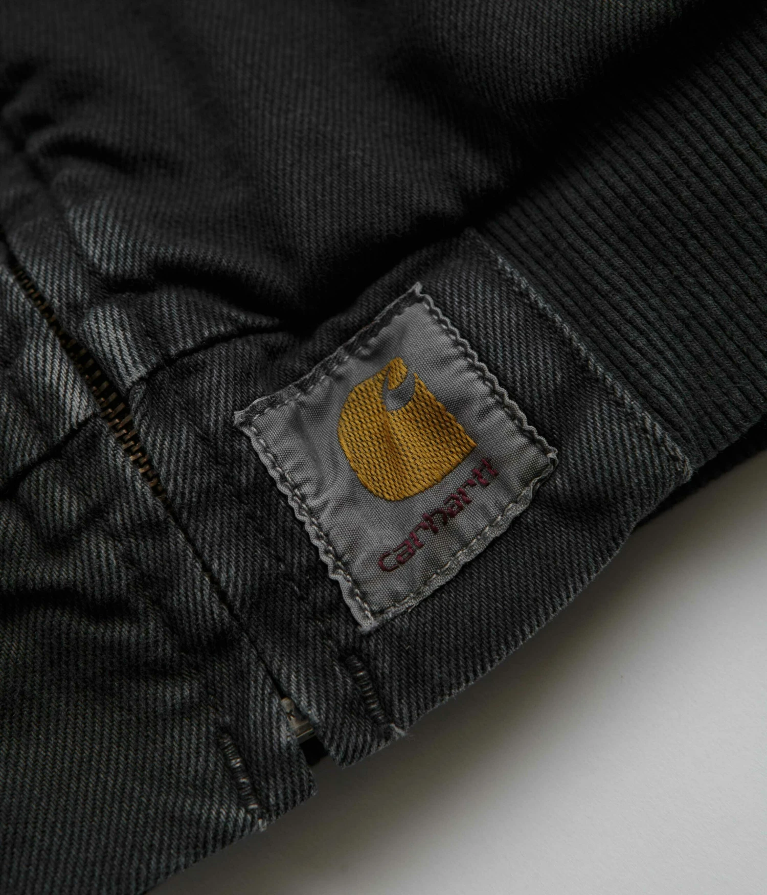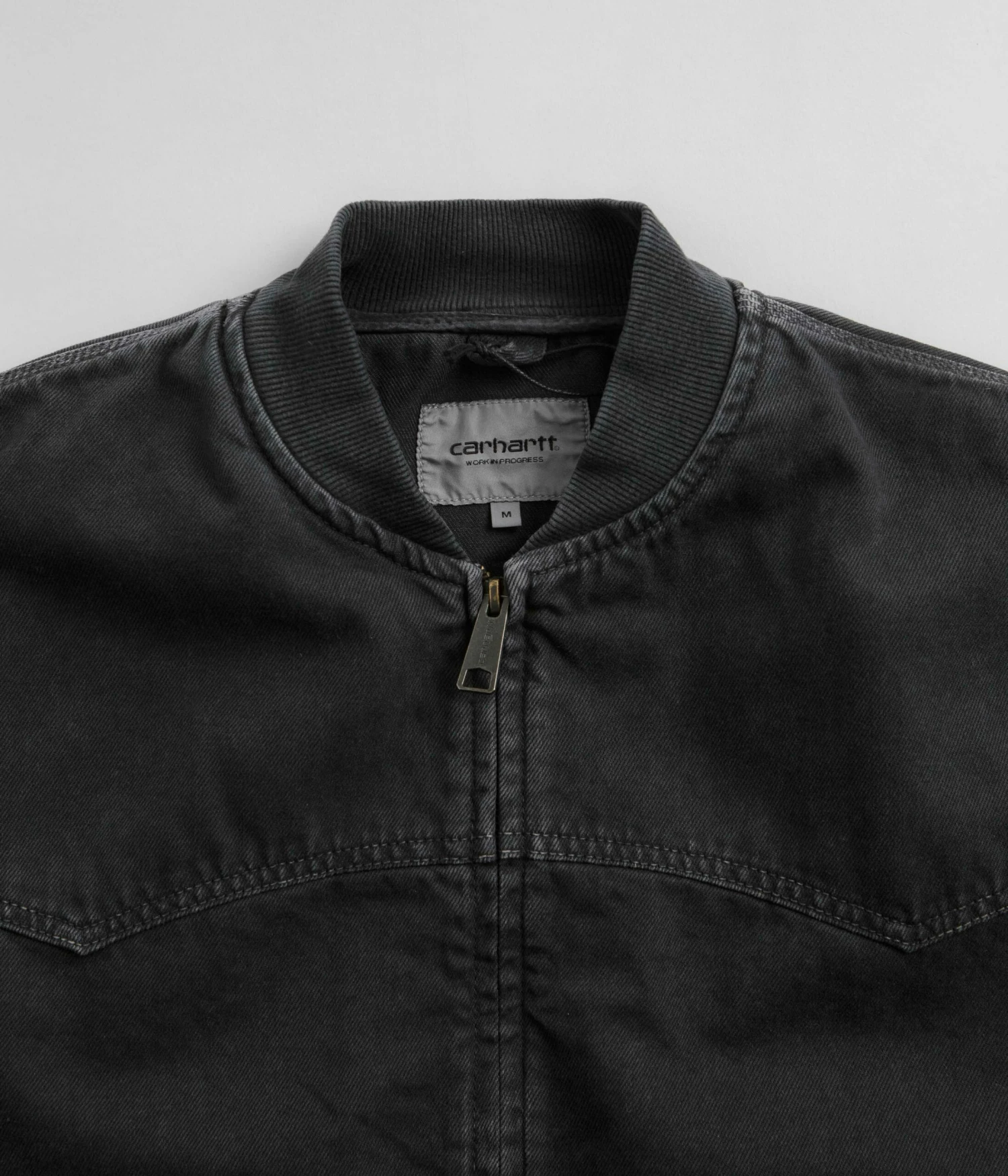 Carhartt OG Santa Fe Bomber Jacket in Stone Dyed Black. Tailored to an original loose fitting from 100% cotton ‘Clark’ twill, this stone dyed and unlined Carhartt jacket is designed with a bomber-style collar and triple stitched seams. Featuring ribbed cuffs, a full length zipper fastening and a woven elastic hem, this black Carhartt bomber jacket is finished with two waist pockets and woven flag label branding.