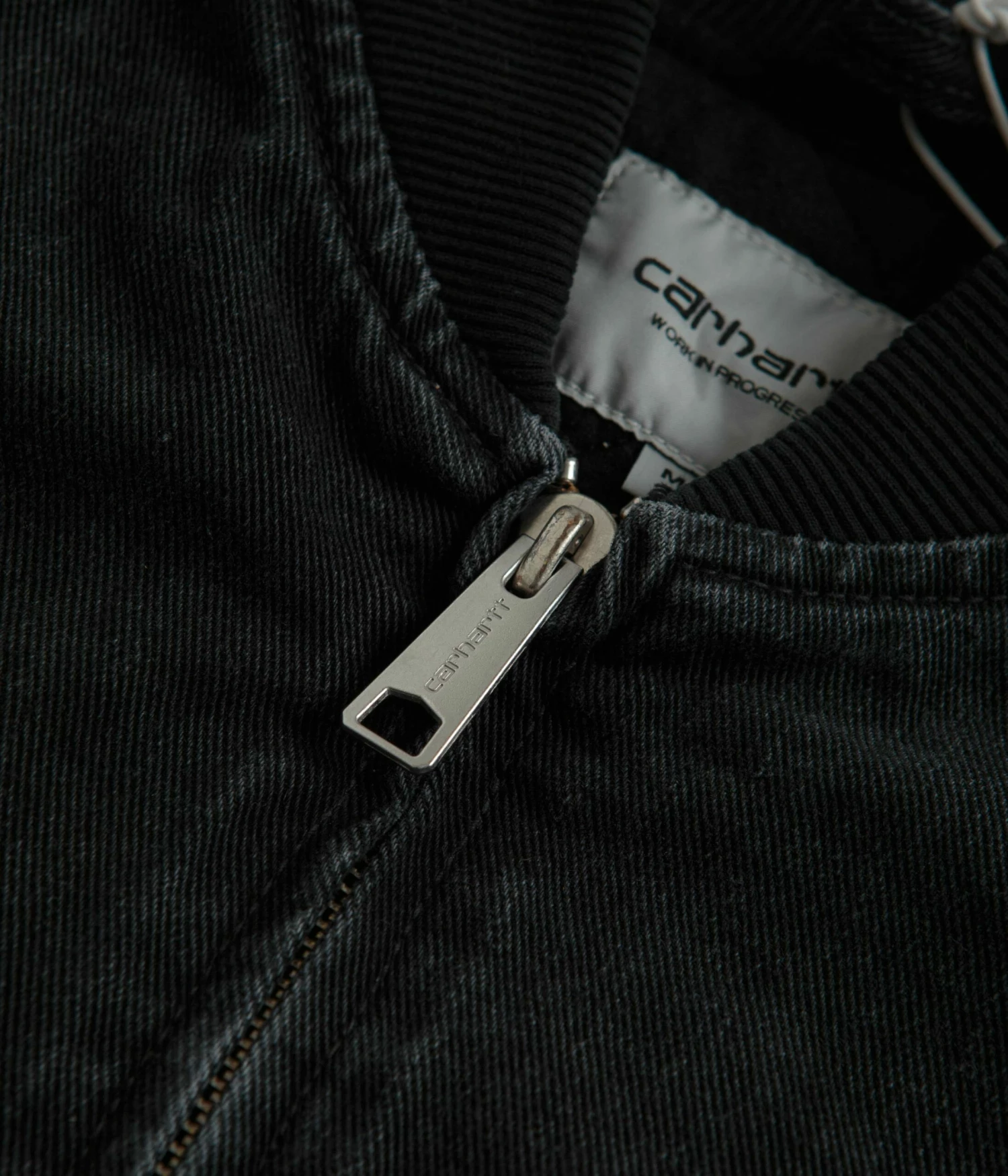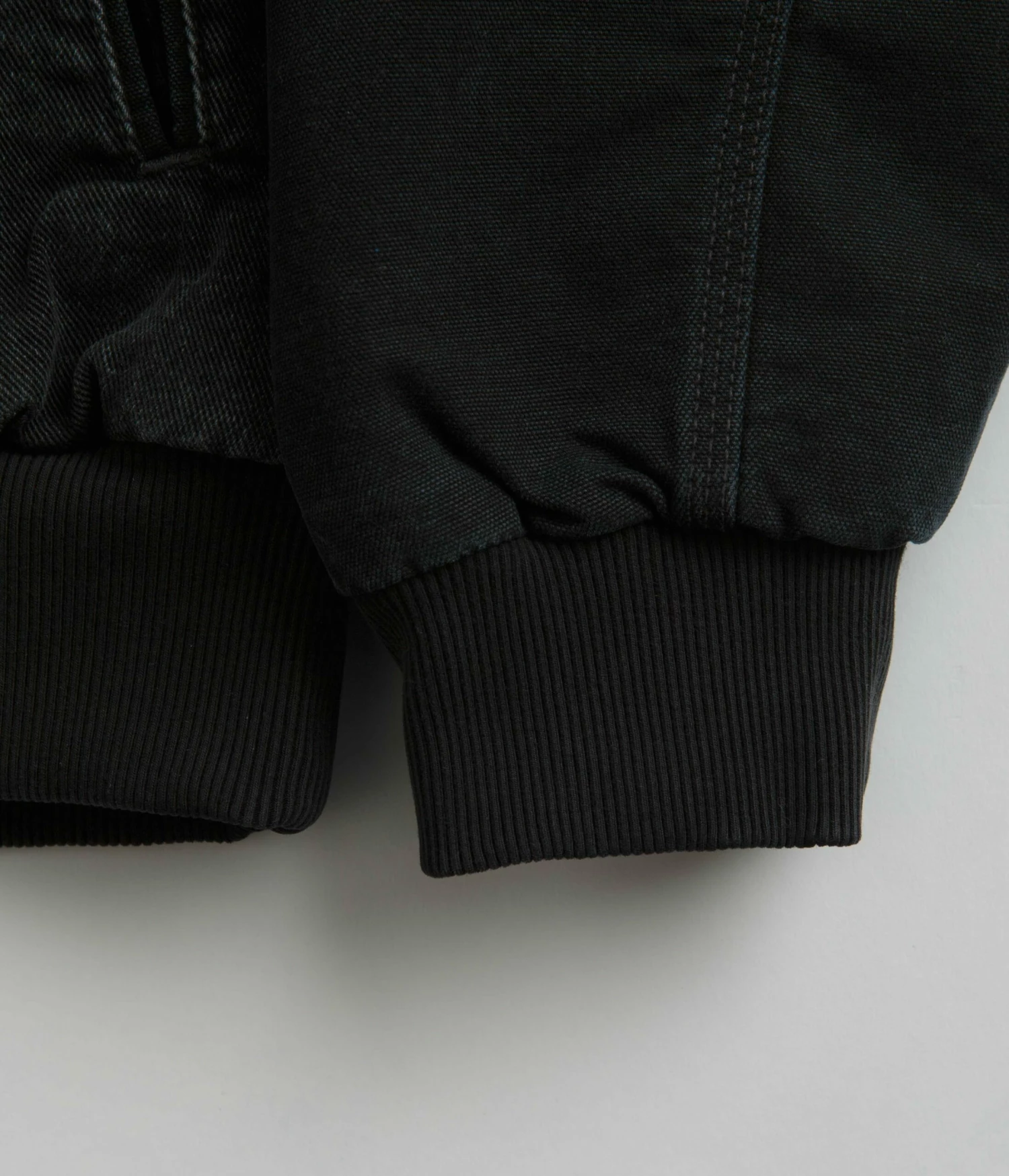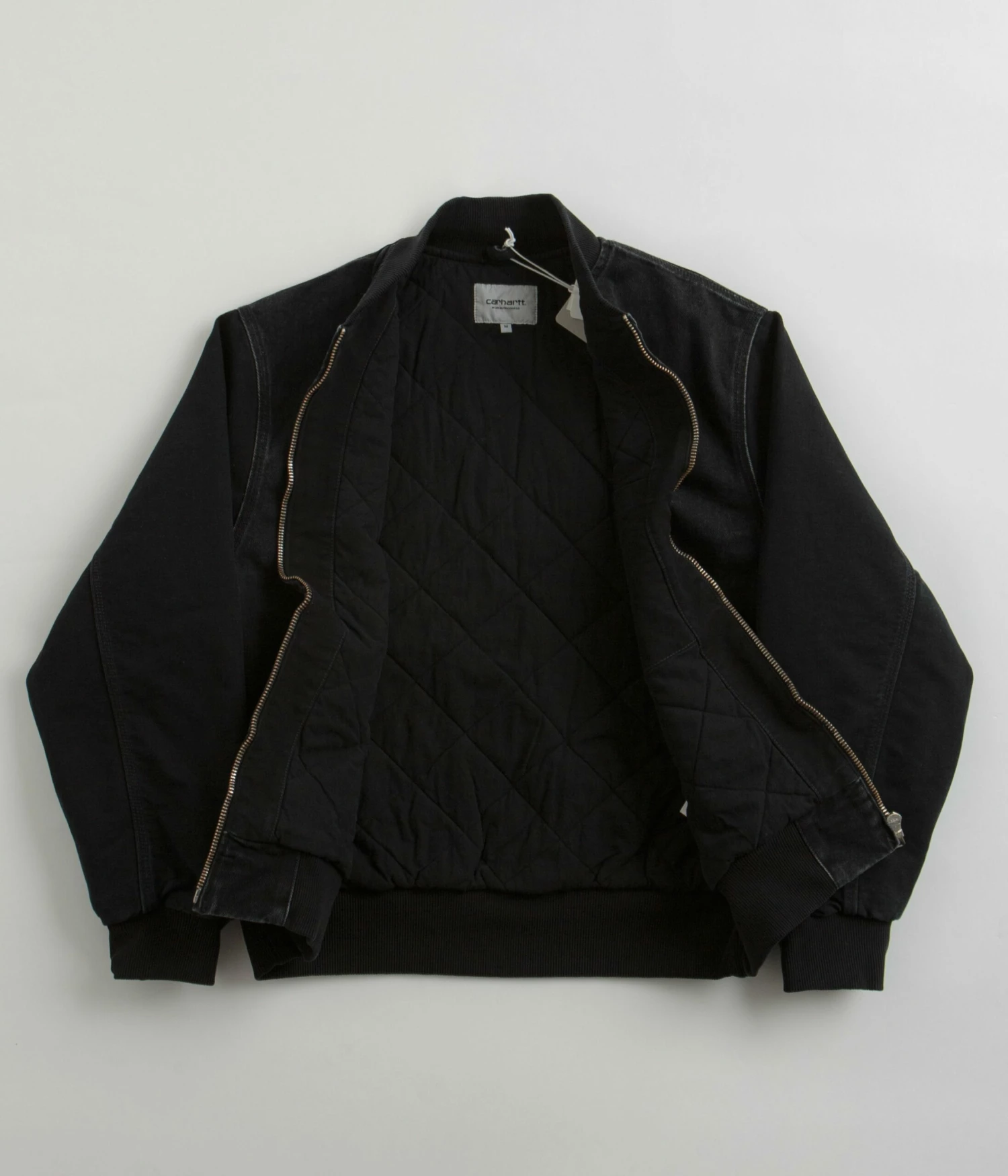Carhartt Paxon Bomber Jacket in Black. Workwear inspired and tailored to a balloon-style fitting, this Carhartt jacket is designed with an organic cotton ‘Maitland’ and ‘Dearborn’ canvas construction. Featuring a stone washed finish, a diamond-quilted lining and a full length zipper fastening, this black Carhartt jacket is finished with a bomber-style collar, ribbed cuffs, a woven elastic hem, two waist pockets and with embroidered logo branding.