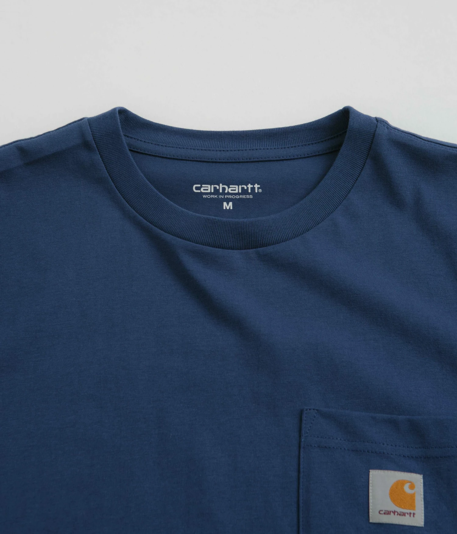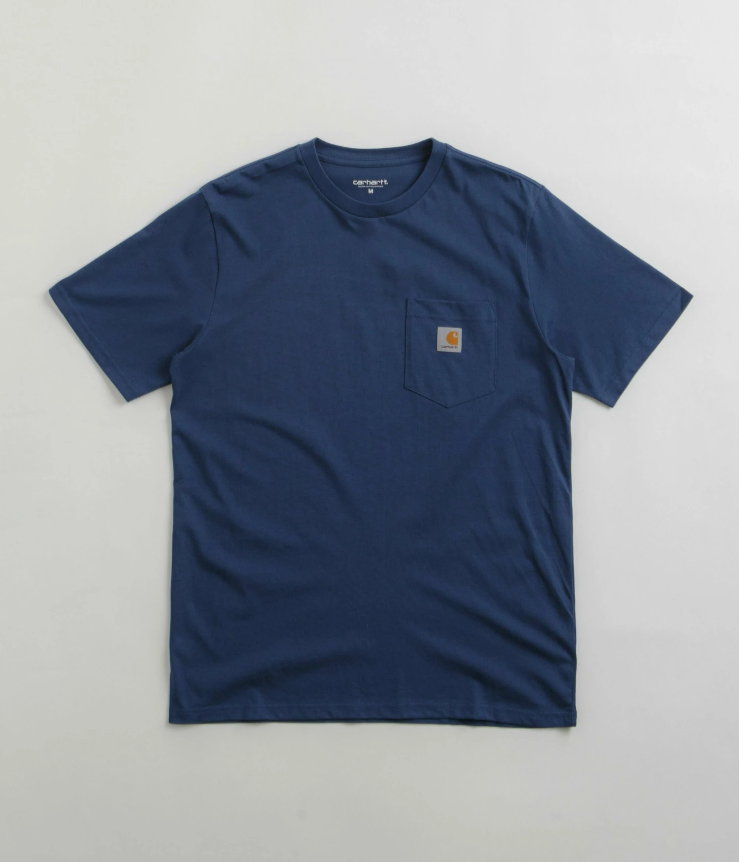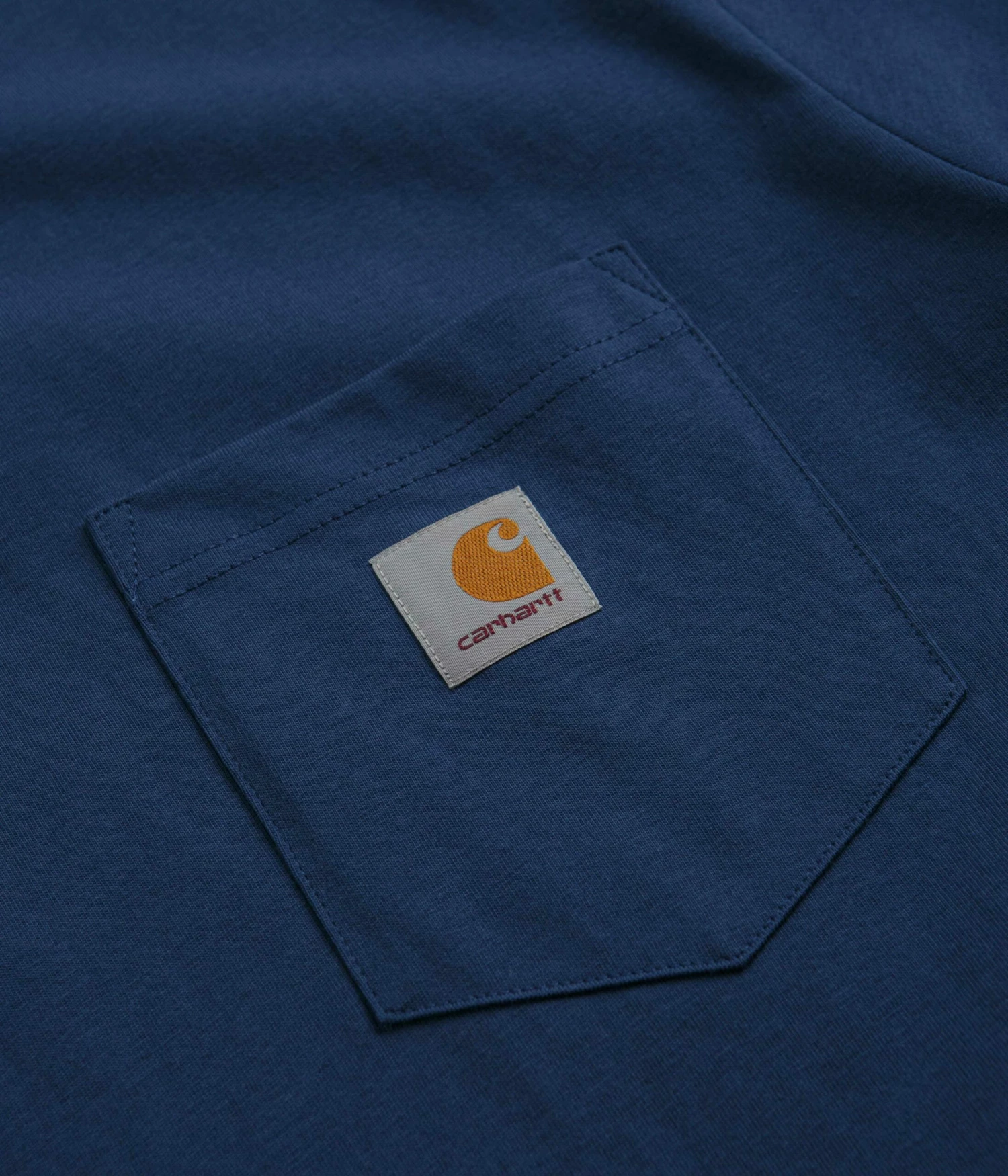 Carhartt Pocket T-Shirt in Elder and White. Made from 100% cotton, this regular fitting Carhartt t-shirt is designed with a classic crew collar and a straight cut hem. Finished in a shade of navy with a single left chest pocket and woven flag label branding.