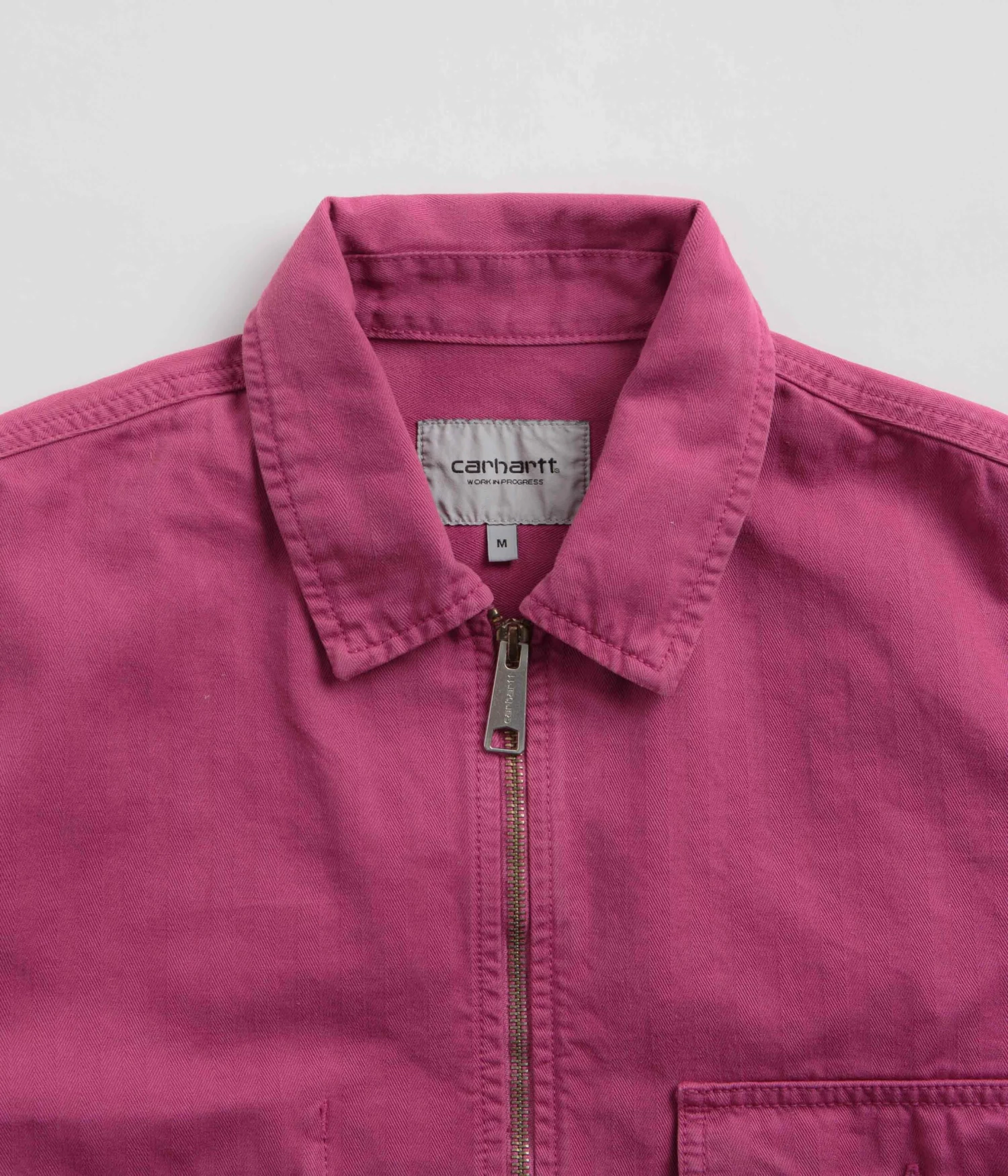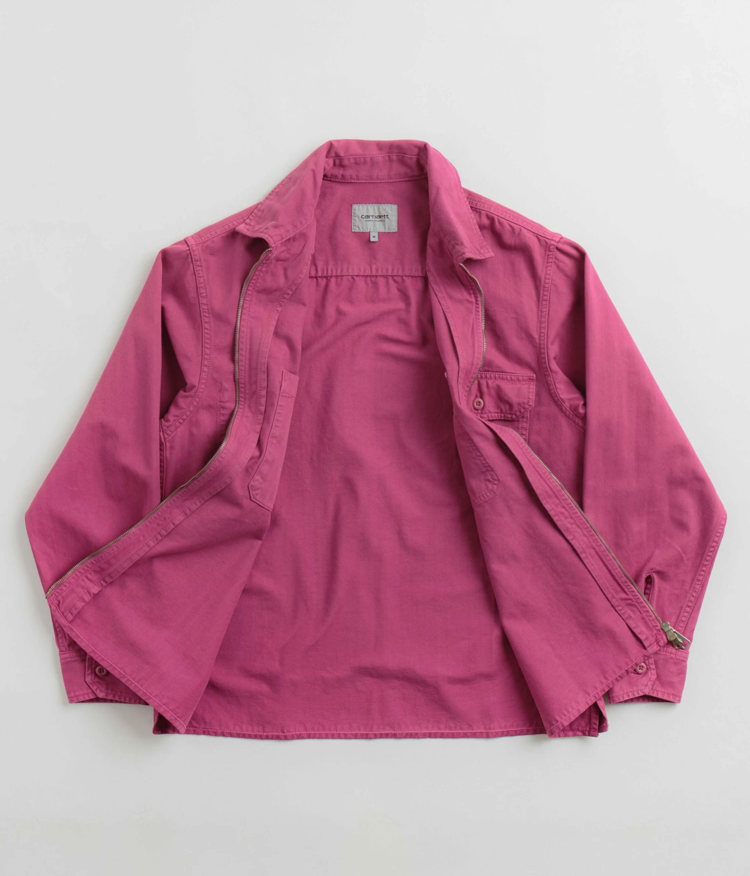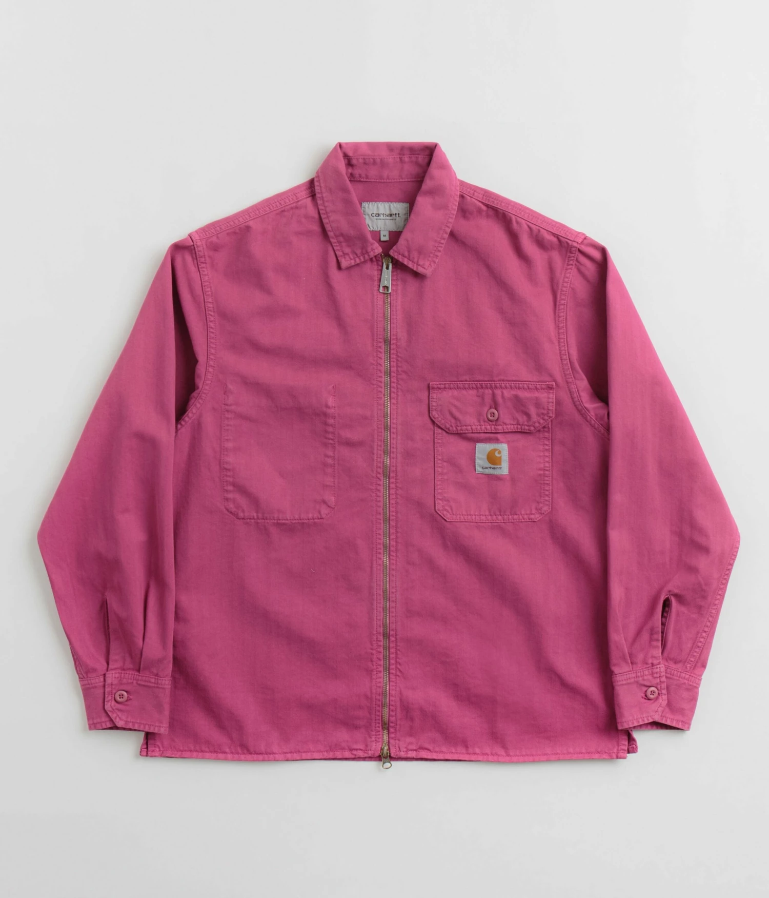 Carhartt Rainer Shirt Jacket in Magenta and Gold. Workwear inspired and designed with a two-way zipper fastening, this garment dyed Carhartt jacket is made from 100% cotton ‘Redmond’ herringbone. Featuring a fold down collar, adjustable cuffs and a reinforced hem, this pink Carhartt jacket is finished with an inner chest pocket, an external chest pocket and with woven flag label branding.