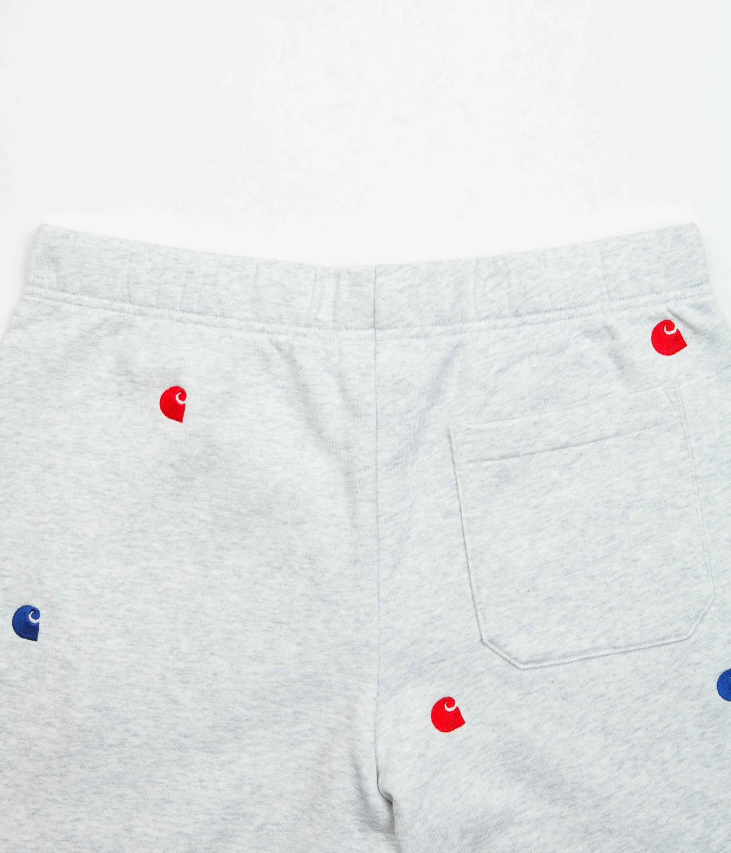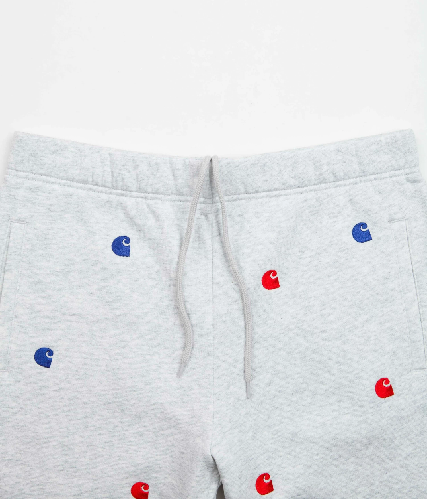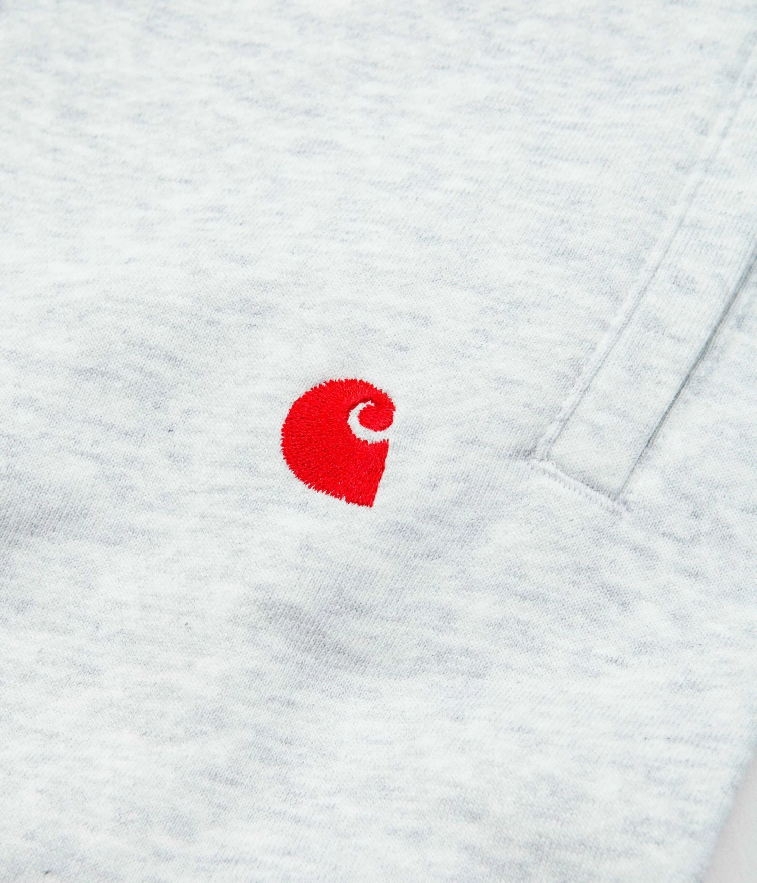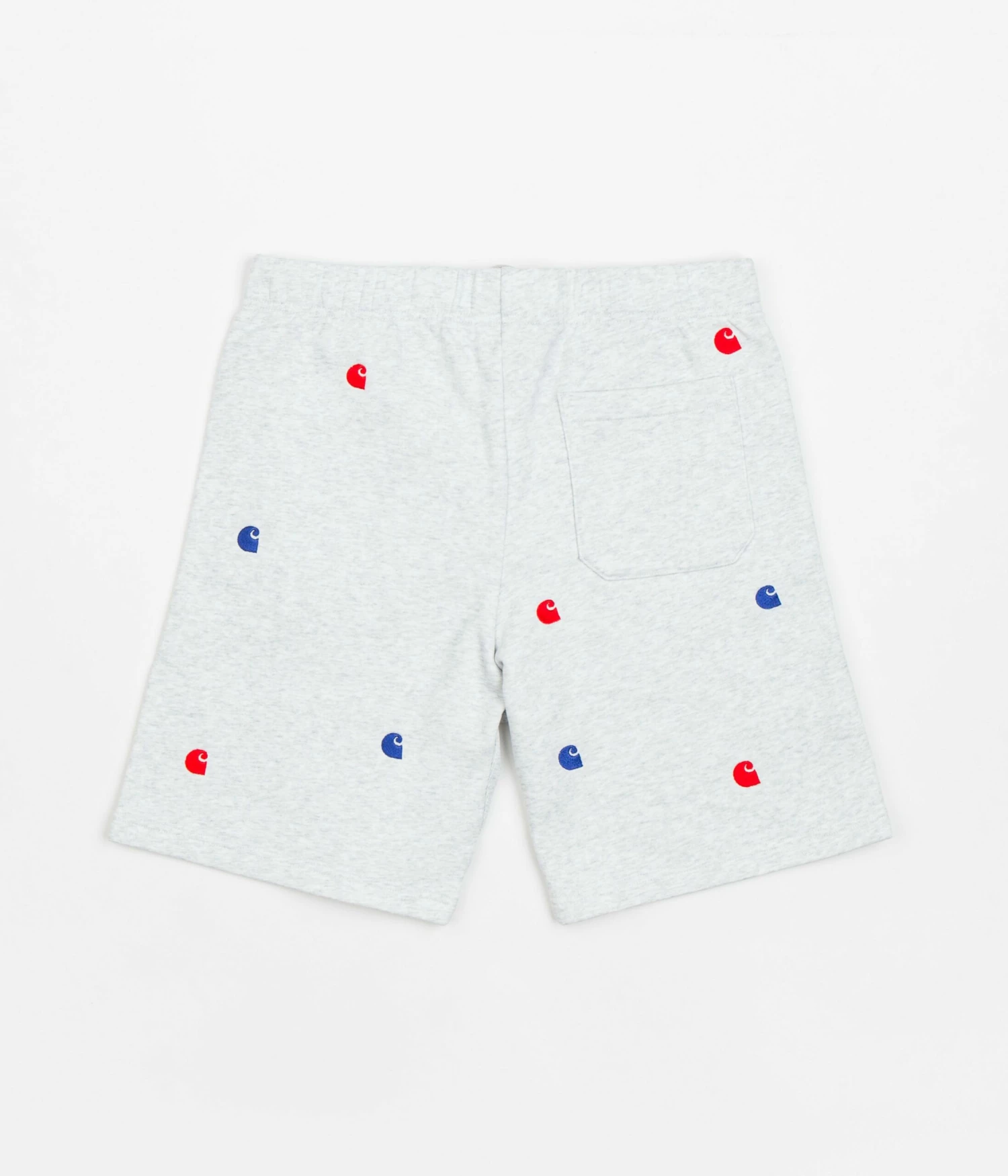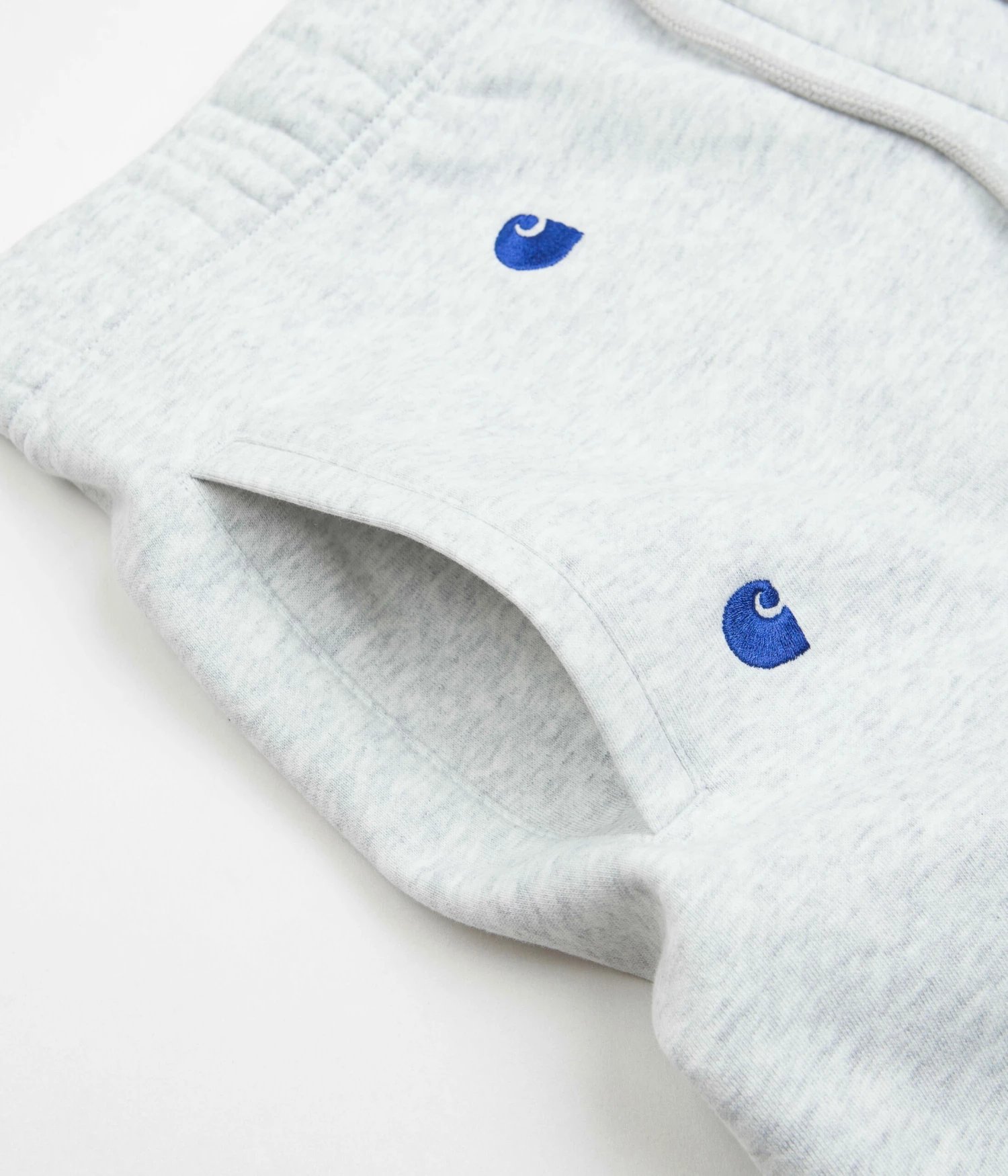 Carhartt Seek Sweat Shorts in Ash Heather. Tailored to a loose fitting from 100% cotton sweater, these brushed lined Carhartt shorts are styled with an adjustable waistband and a reinforced crotch insert. Finished in a shade of heather grey, these above-knee Carhartt sweat shorts are finished with two side pockets, a single rear patch pocket and with all-over ‘C’ logo embroidery.