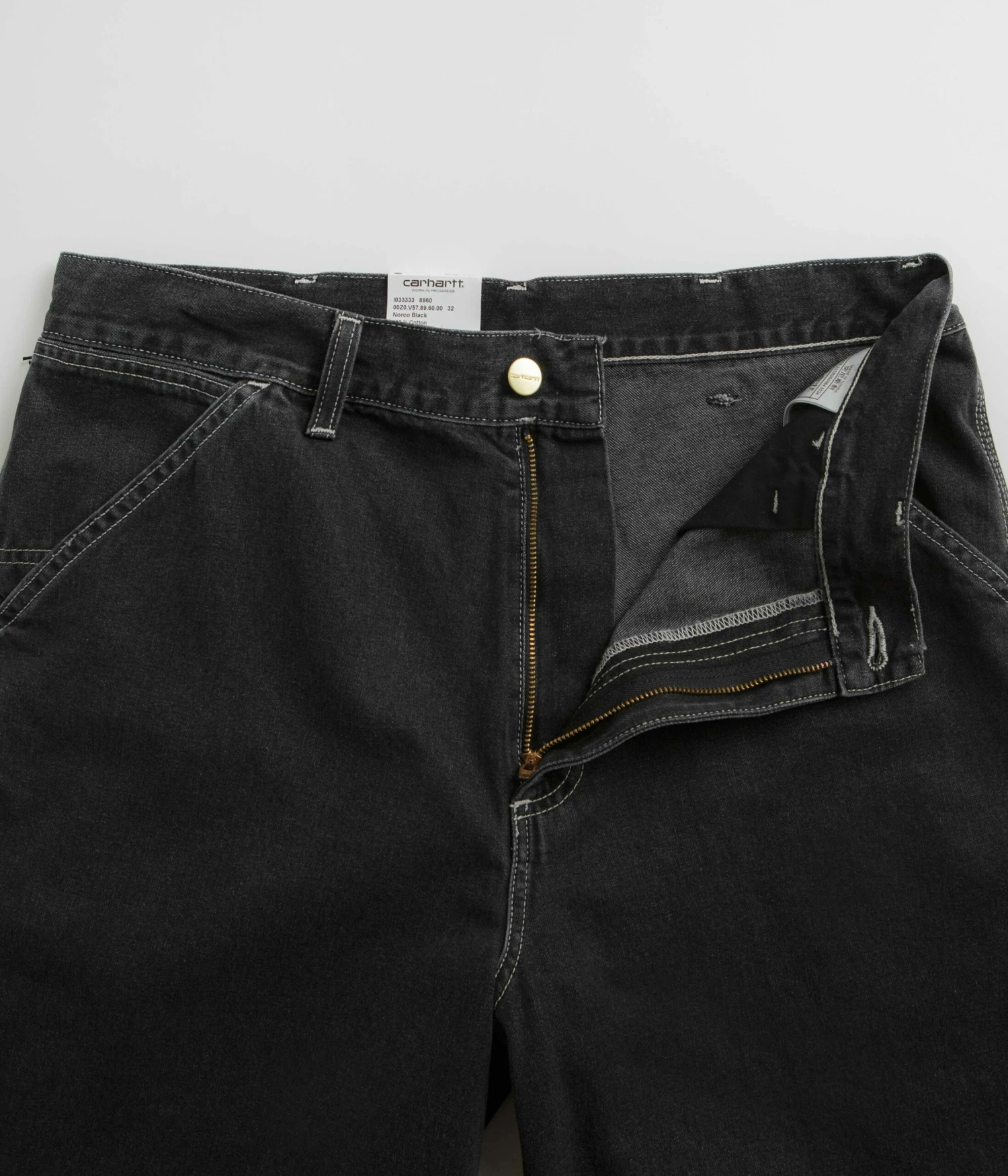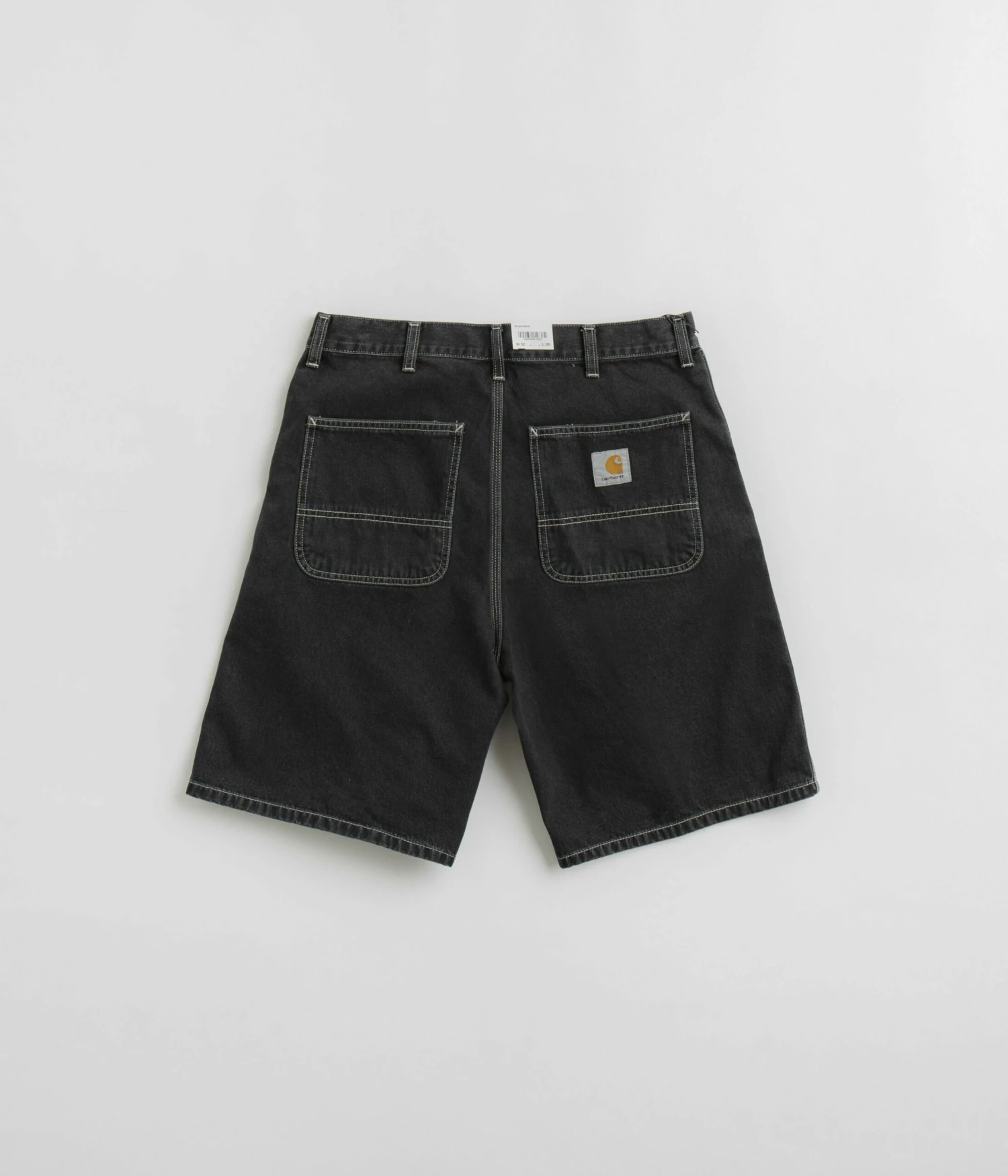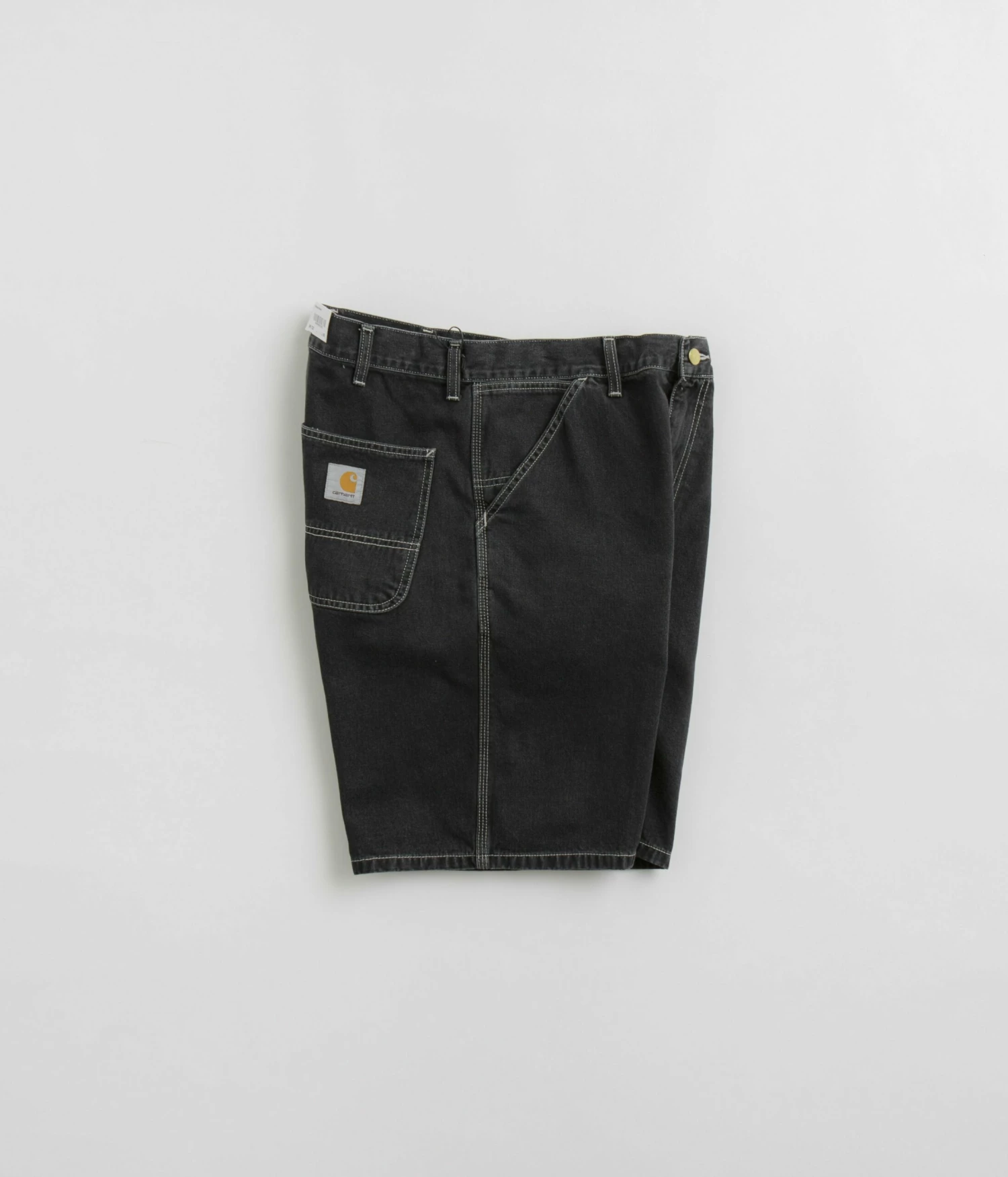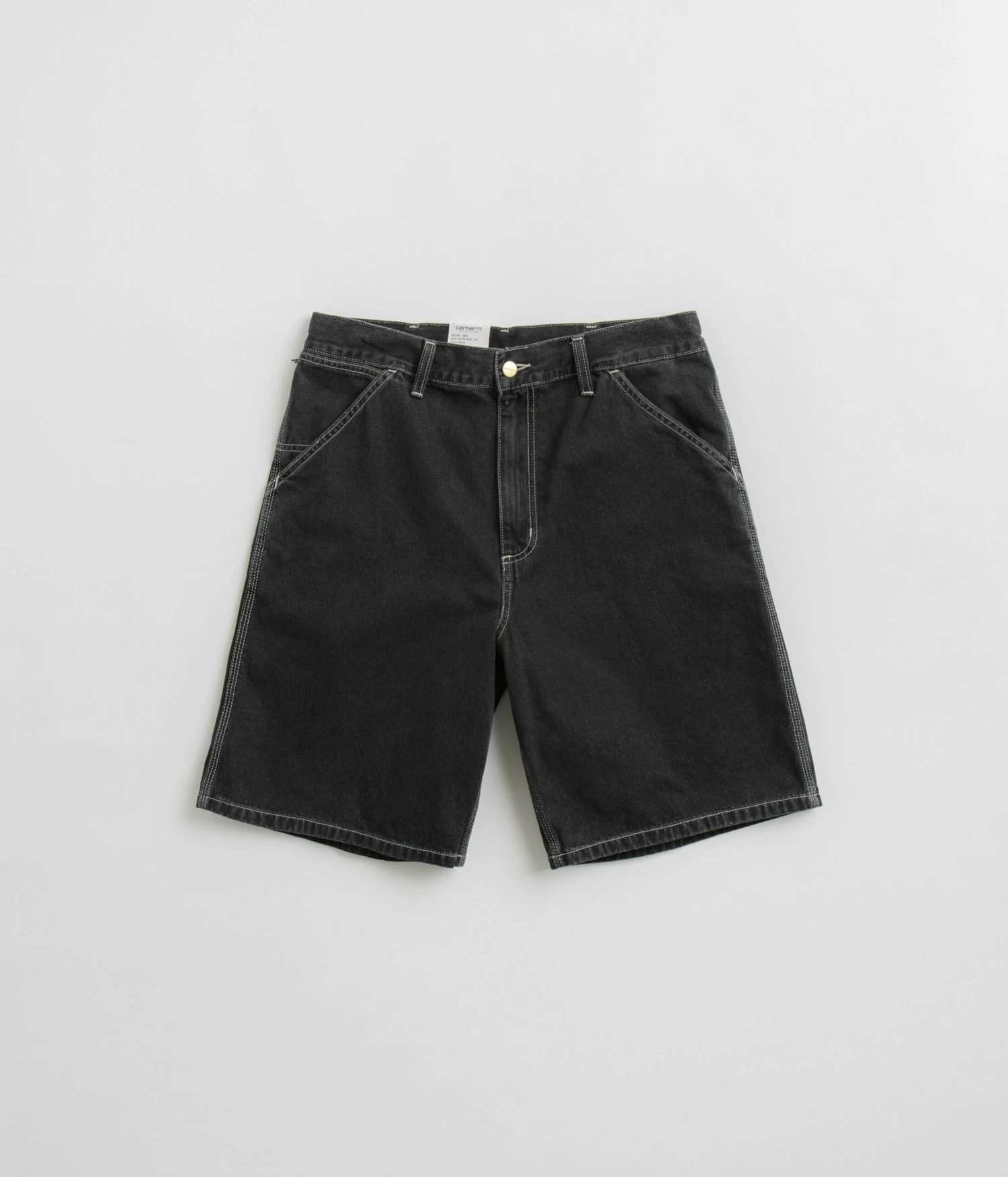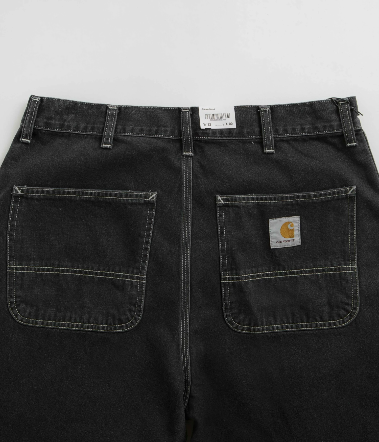 Carhartt Simple Shorts in Heavy Stone Washed Black. Made from 100% cotton ‘Norco’ denim, these knee length Carhartt shorts are tailored to a relaxed fitting with a belt loop waistband. Featuring a single button secured zipper fly, these washed black Carhartt shorts are finished with two waist pockets, two rear pockets and with woven flag label branding.