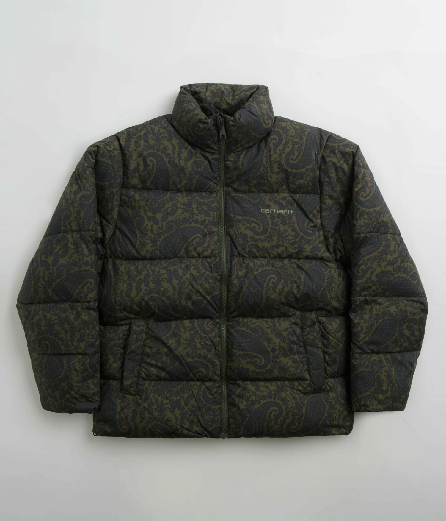 Carhartt Springfield Jacket in Paisley Print, Plant and Black. Tailored to a regular fitting from 100% recycled polyester taffeta, this patterned Carhartt jacket is styled with a water-repellent exterior and an artificial down filling. Featuring a full length zipper fastening, elasticated cuffs and an adjustable hem, this paisley print Carhartt jacket is finished with two waist pockets and printed left chest branding.