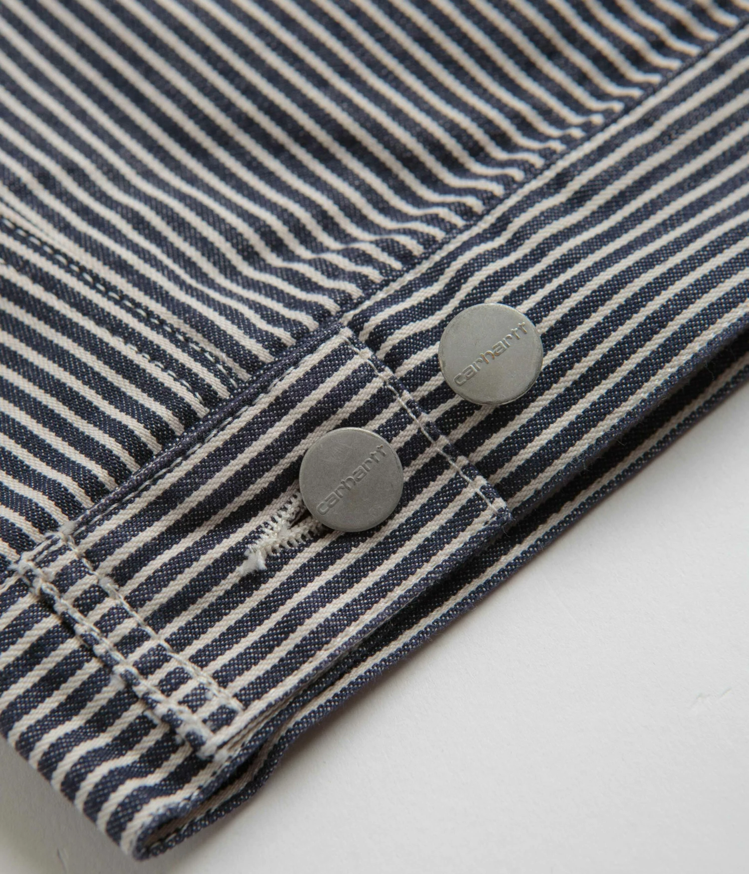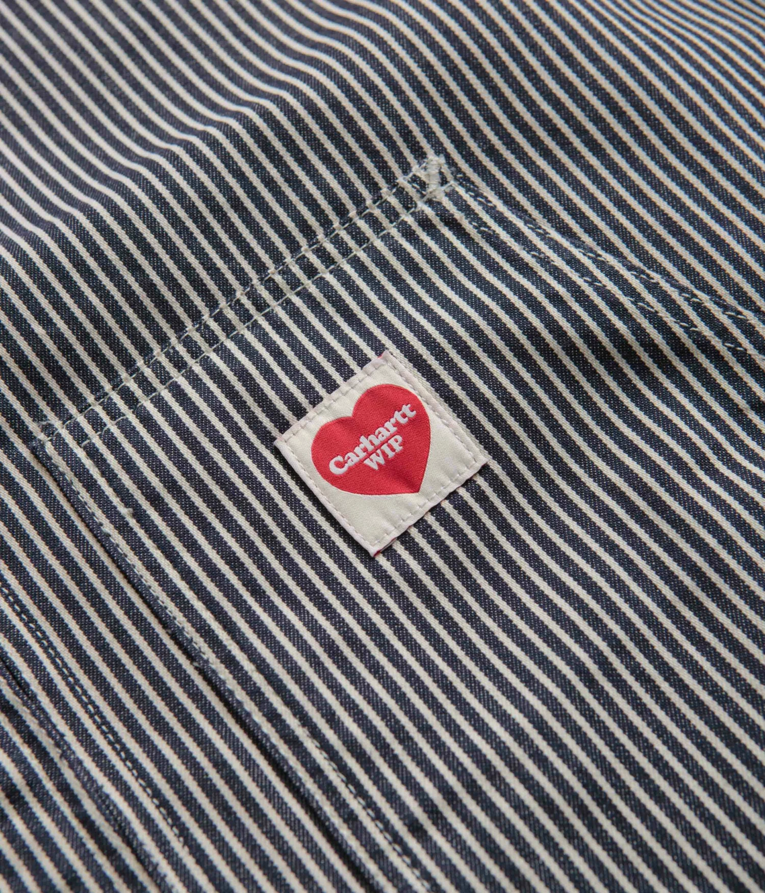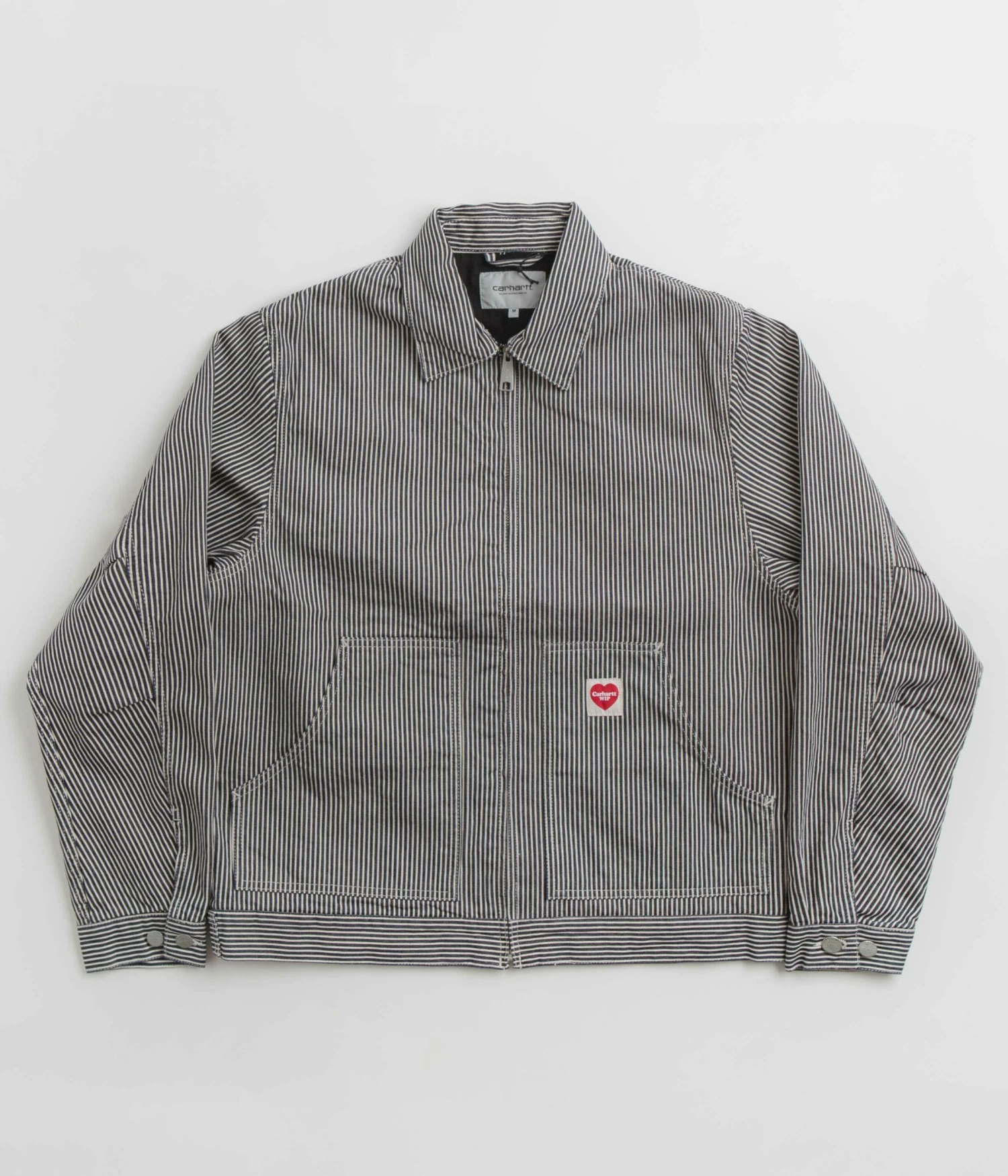Carhartt Terrell Jacket in Dark Navy and Wax. Utility inspired and tailored to a regular fitting, this Carhartt jacket is made from 100% cotton ‘Terrell’ hickory stripe with nylon-lined sleeves and a lined body. Featuring a full length zipper fastening, adjustable cuffs and an adjustable hem, this navy striped Carhartt jacket is finished with two waist pockets, a single chest pocket and with a woven Carhartt WIP heart flag label.